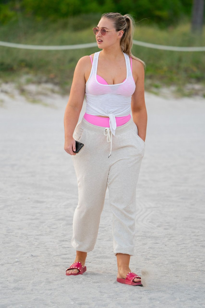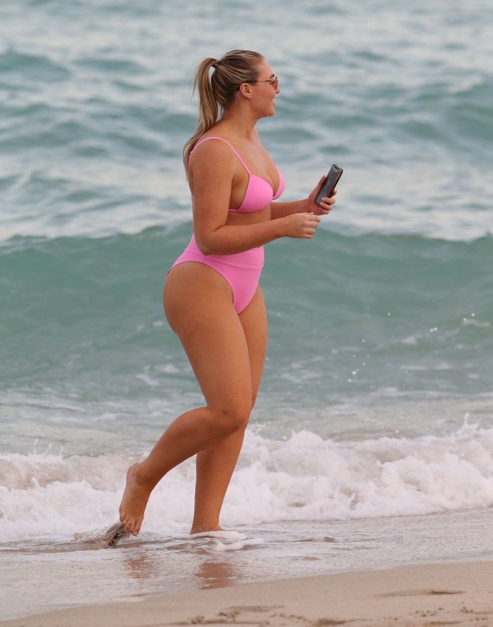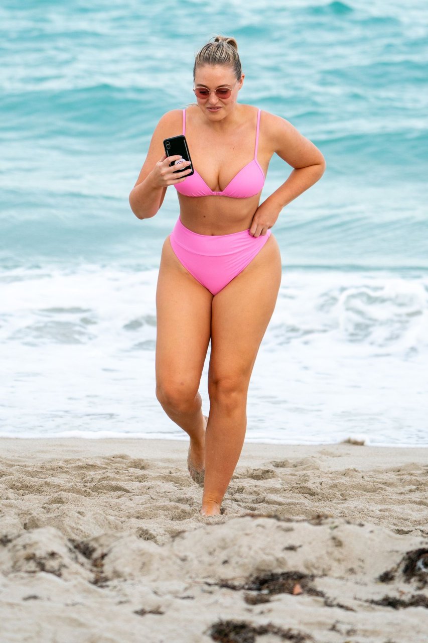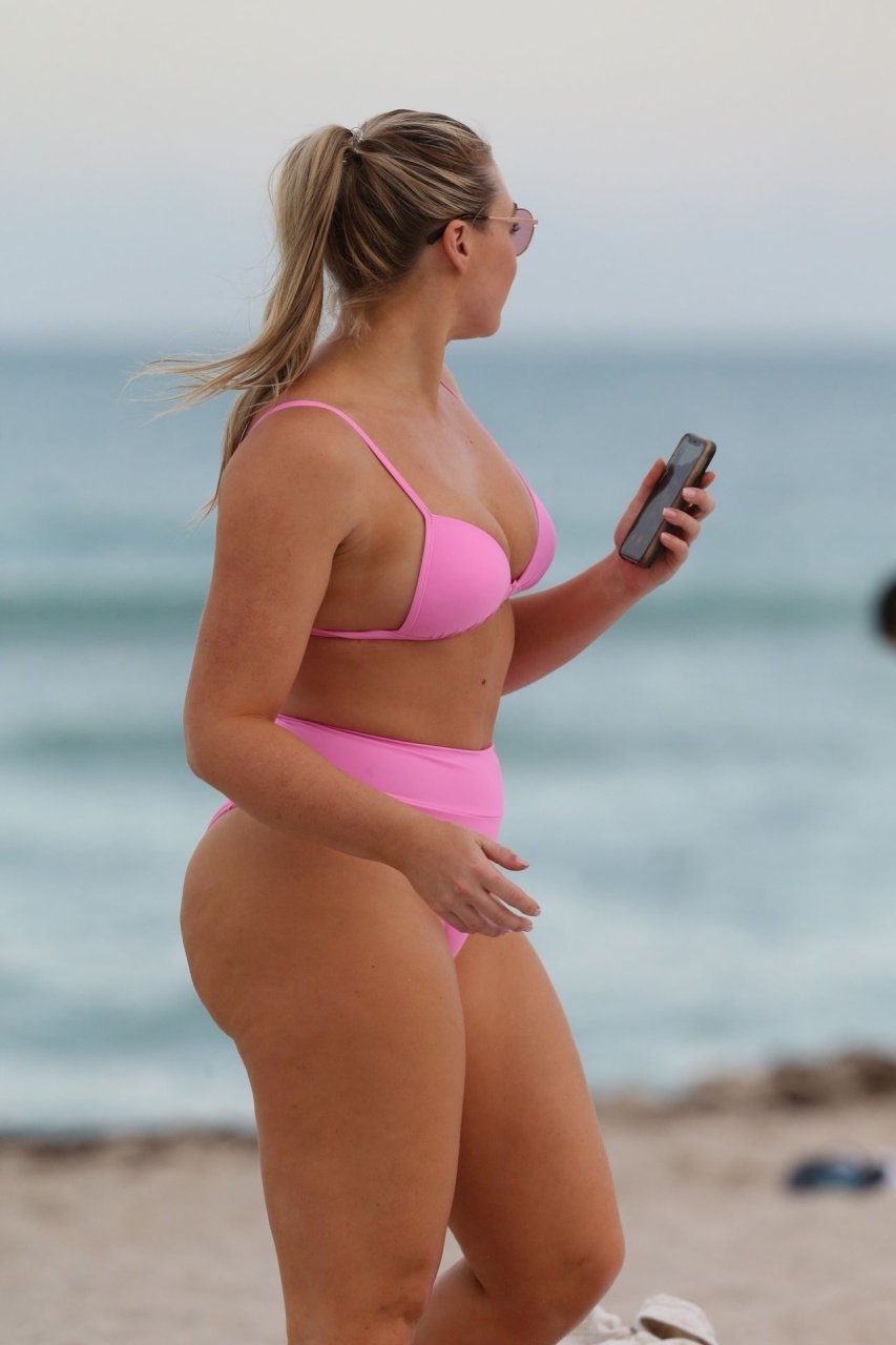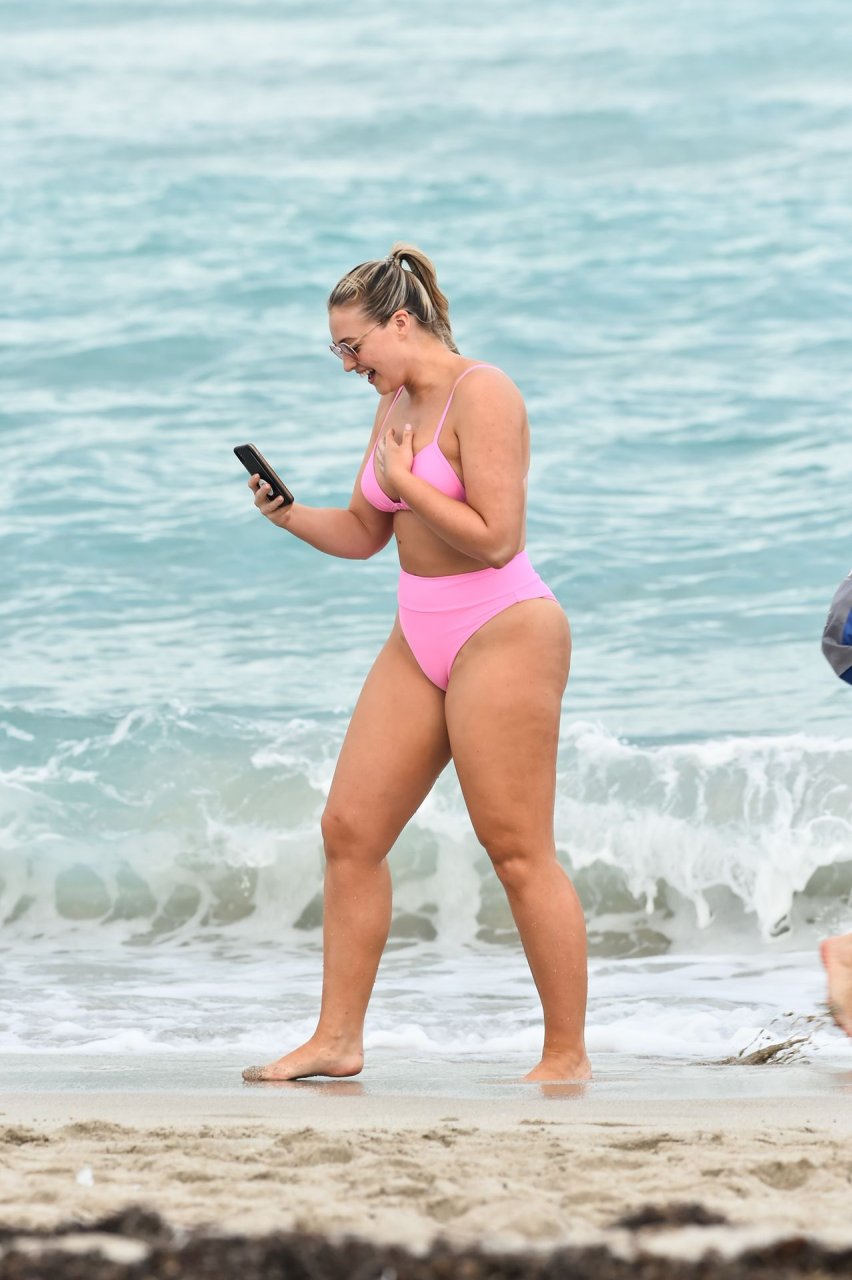 La modella Iskra Lawrence mostra le sue curve in spiaggia con un bikini rosa a Miami, 12/09/2018. Iskra è splendida mentre si gode la sua giornata in spiaggia.
