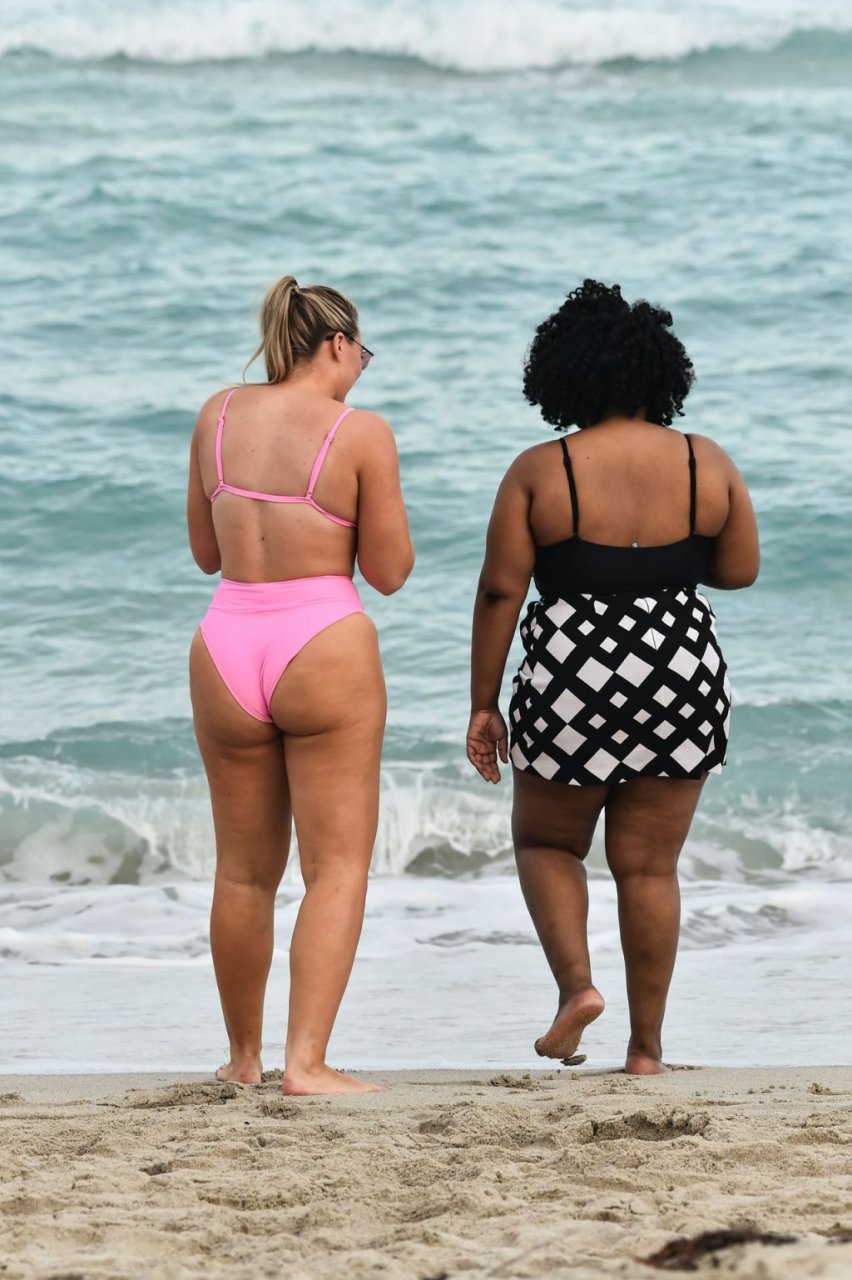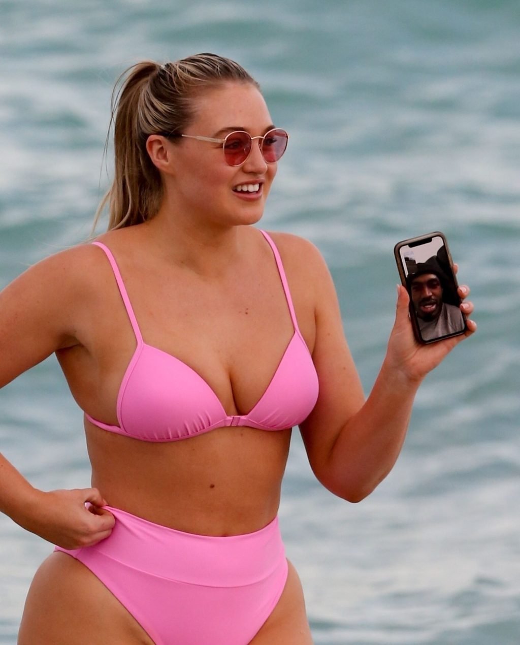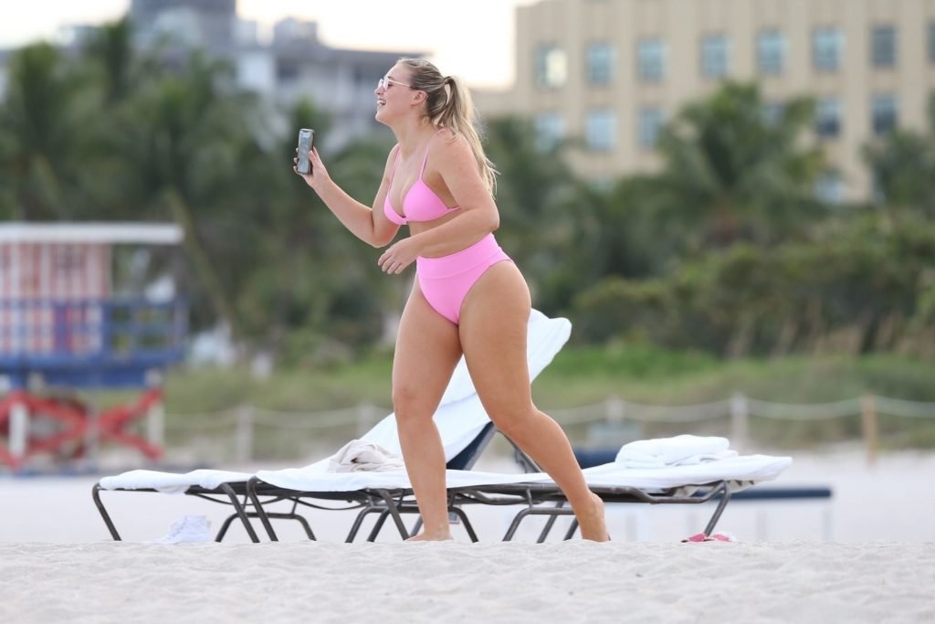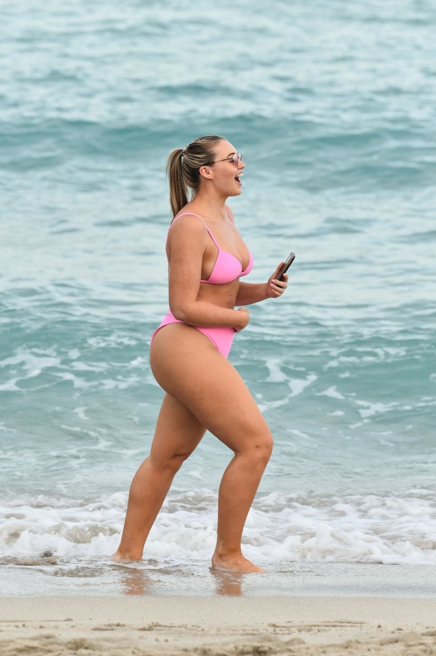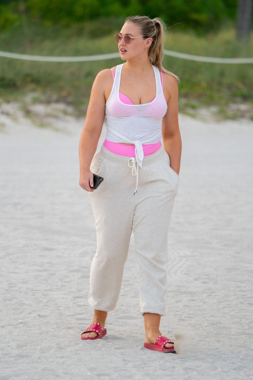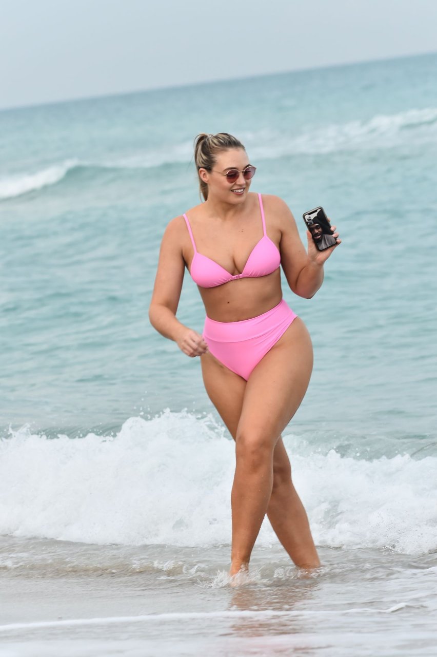 La modella Iskra Lawrence mostra le sue curve in spiaggia con un bikini rosa a Miami, 12/09/2018. Iskra è splendida mentre si gode la sua giornata in spiaggia.