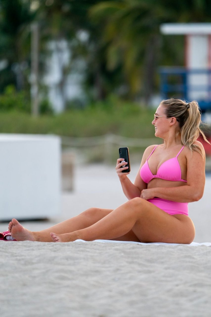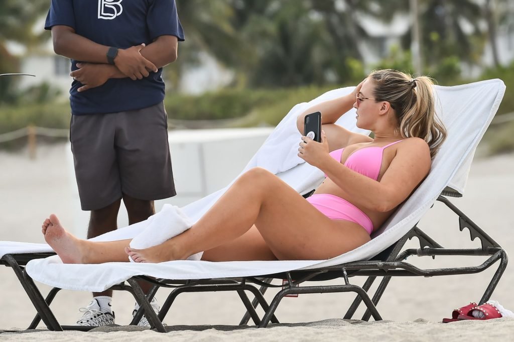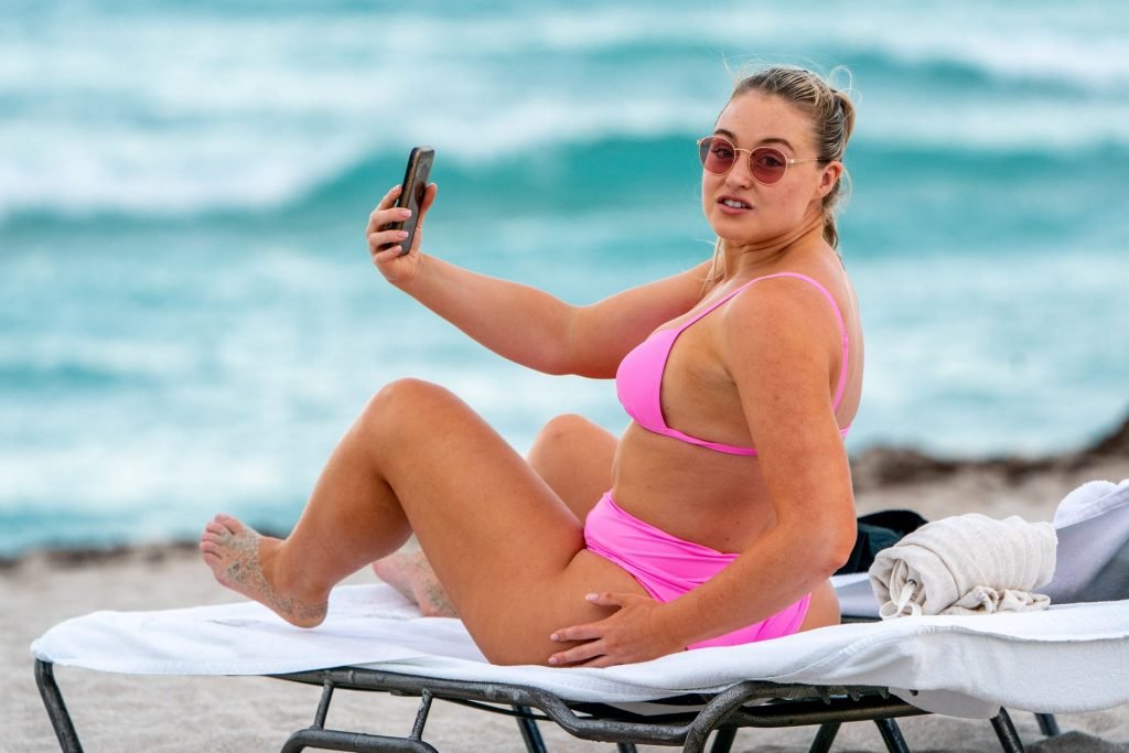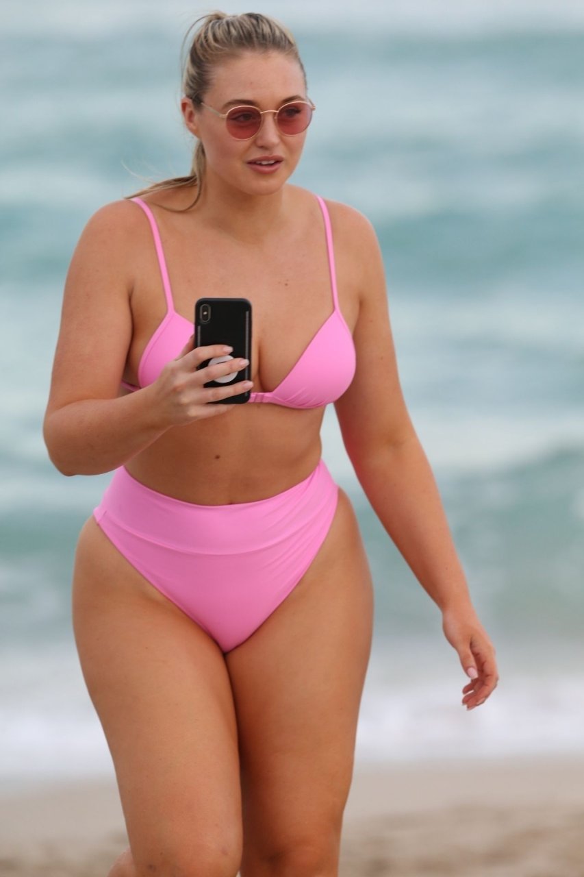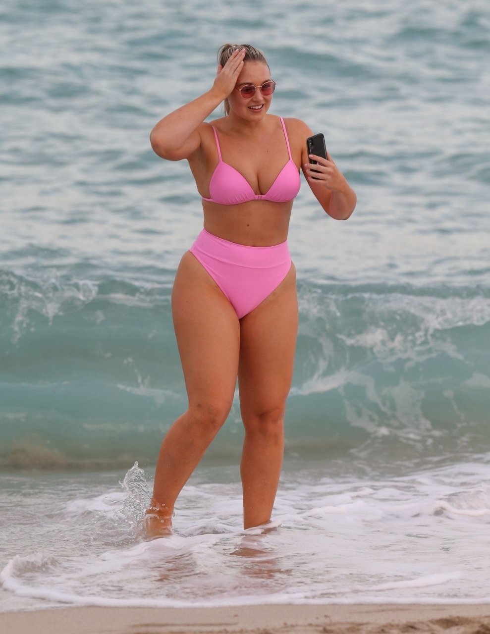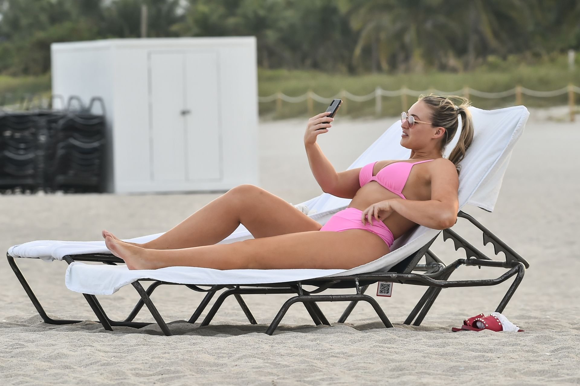La modella Iskra Lawrence mostra le sue curve in spiaggia con un bikini rosa a Miami, 12/09/2018. Iskra è splendida mentre si gode la sua giornata in spiaggia.