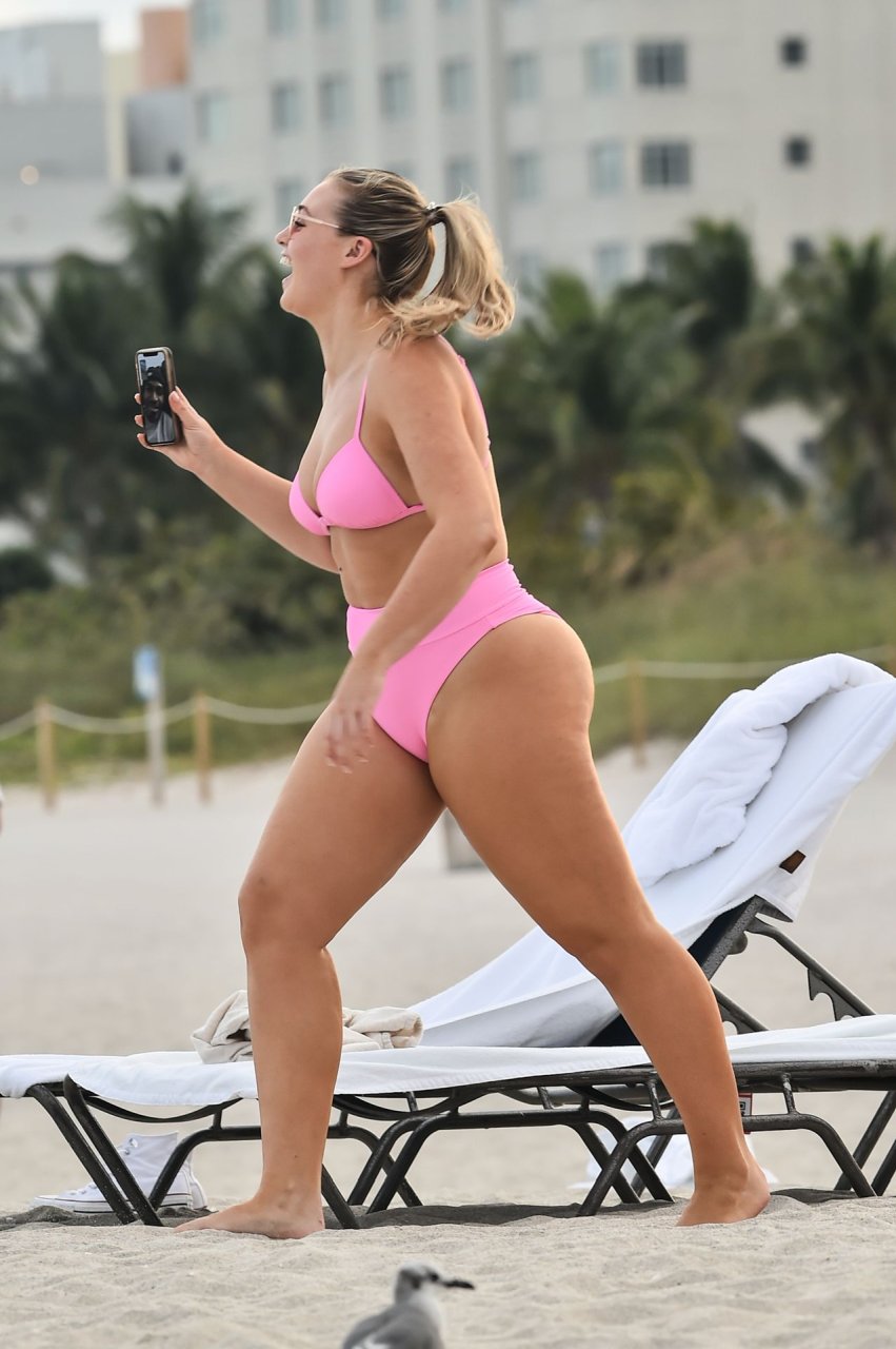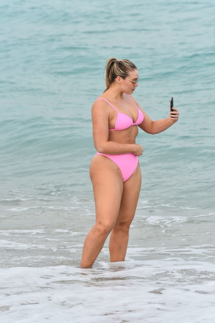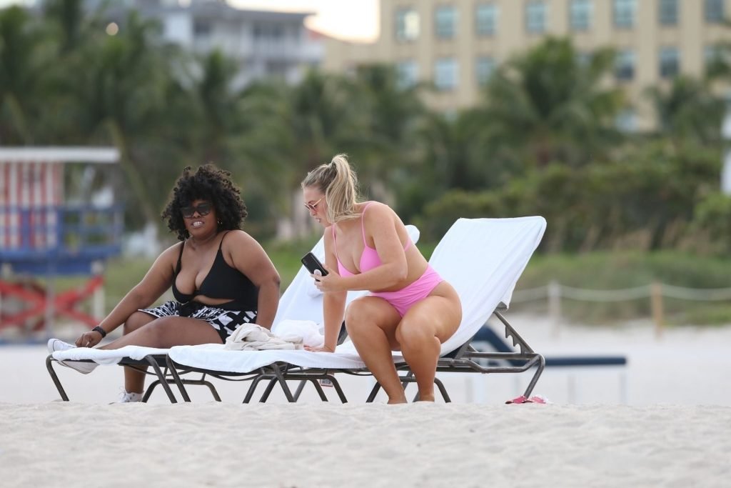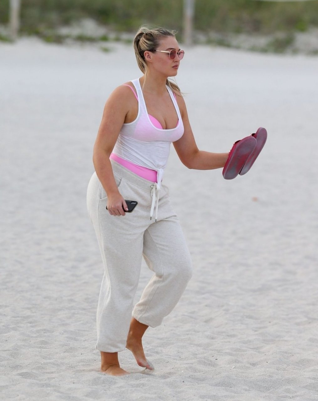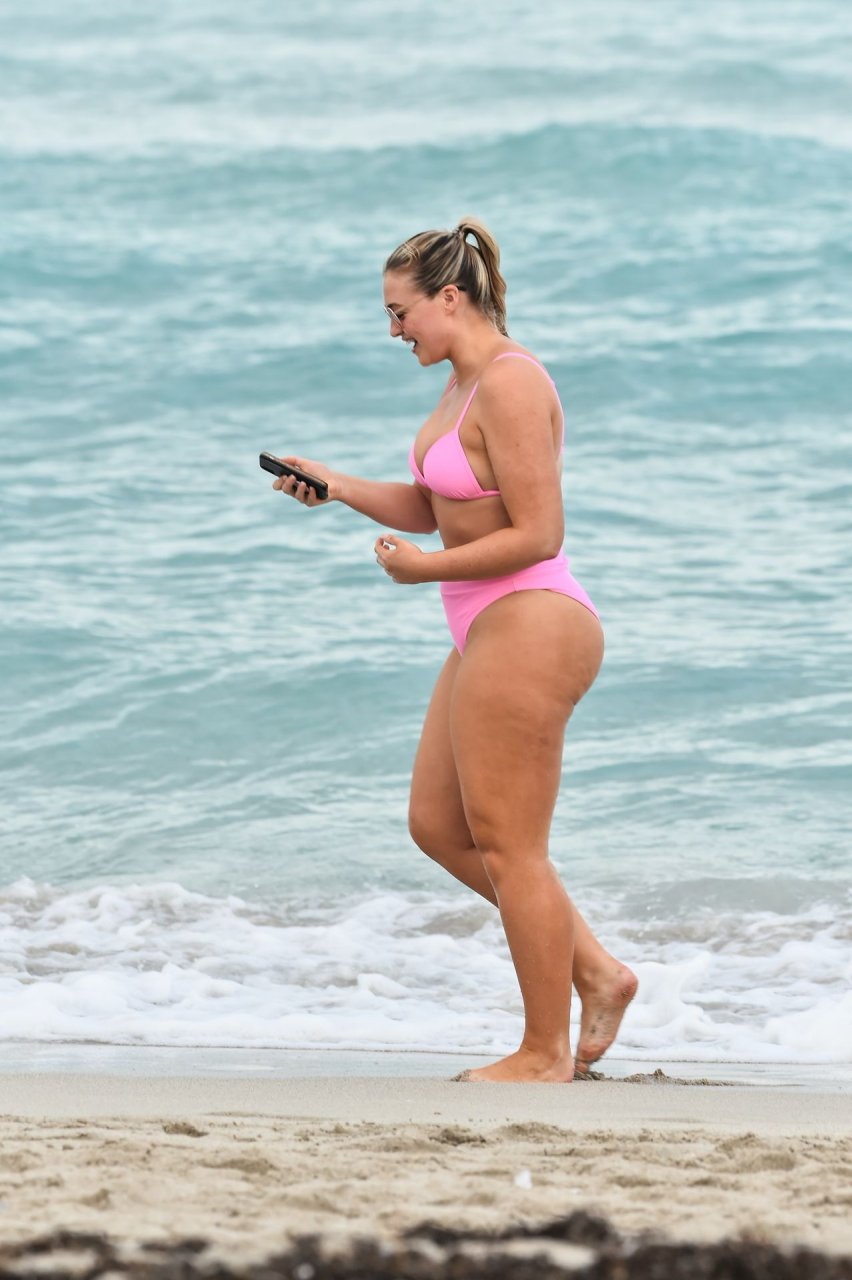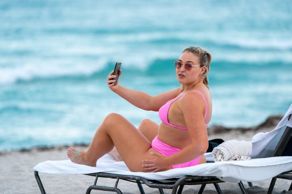 La modella Iskra Lawrence mostra le sue curve in spiaggia con un bikini rosa a Miami, 12/09/2018. Iskra è splendida mentre si gode la sua giornata in spiaggia.