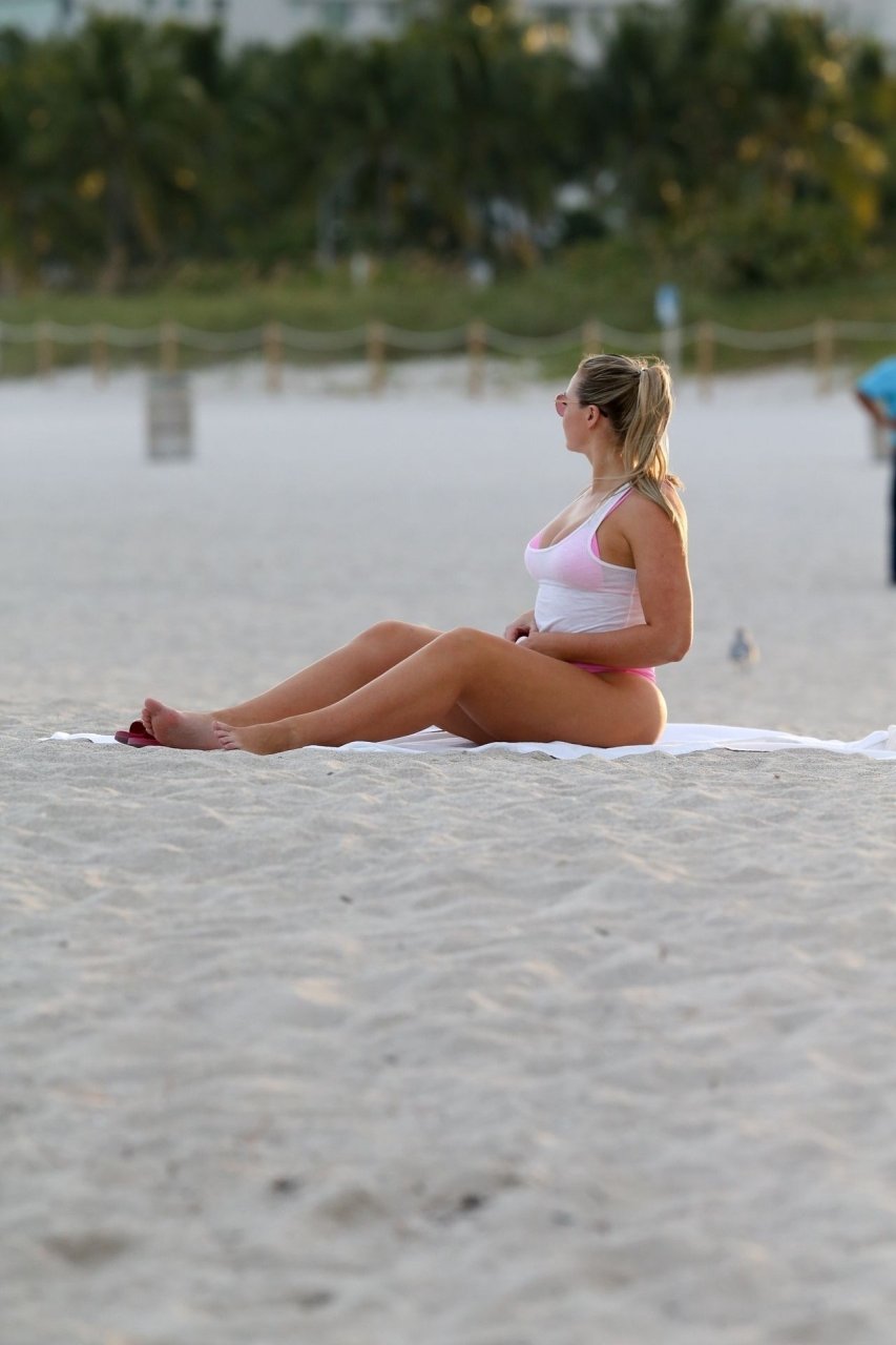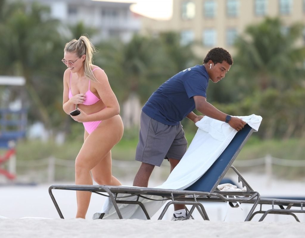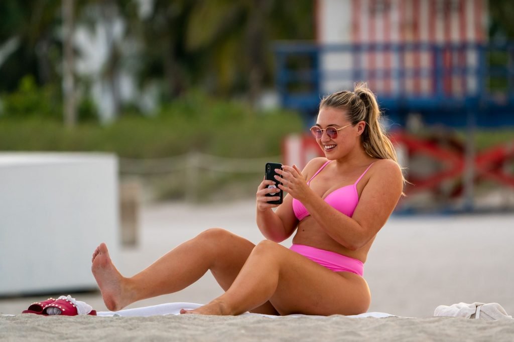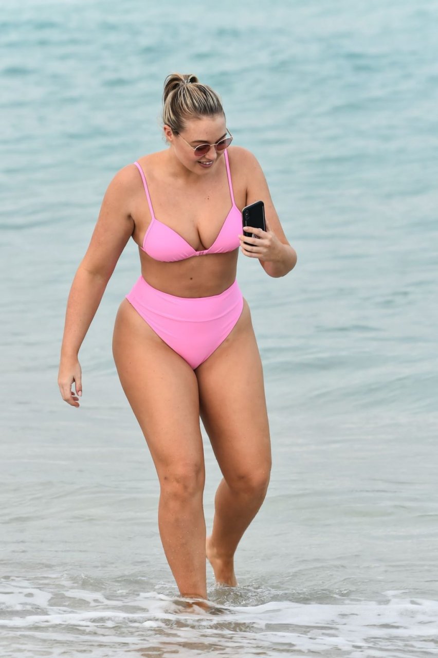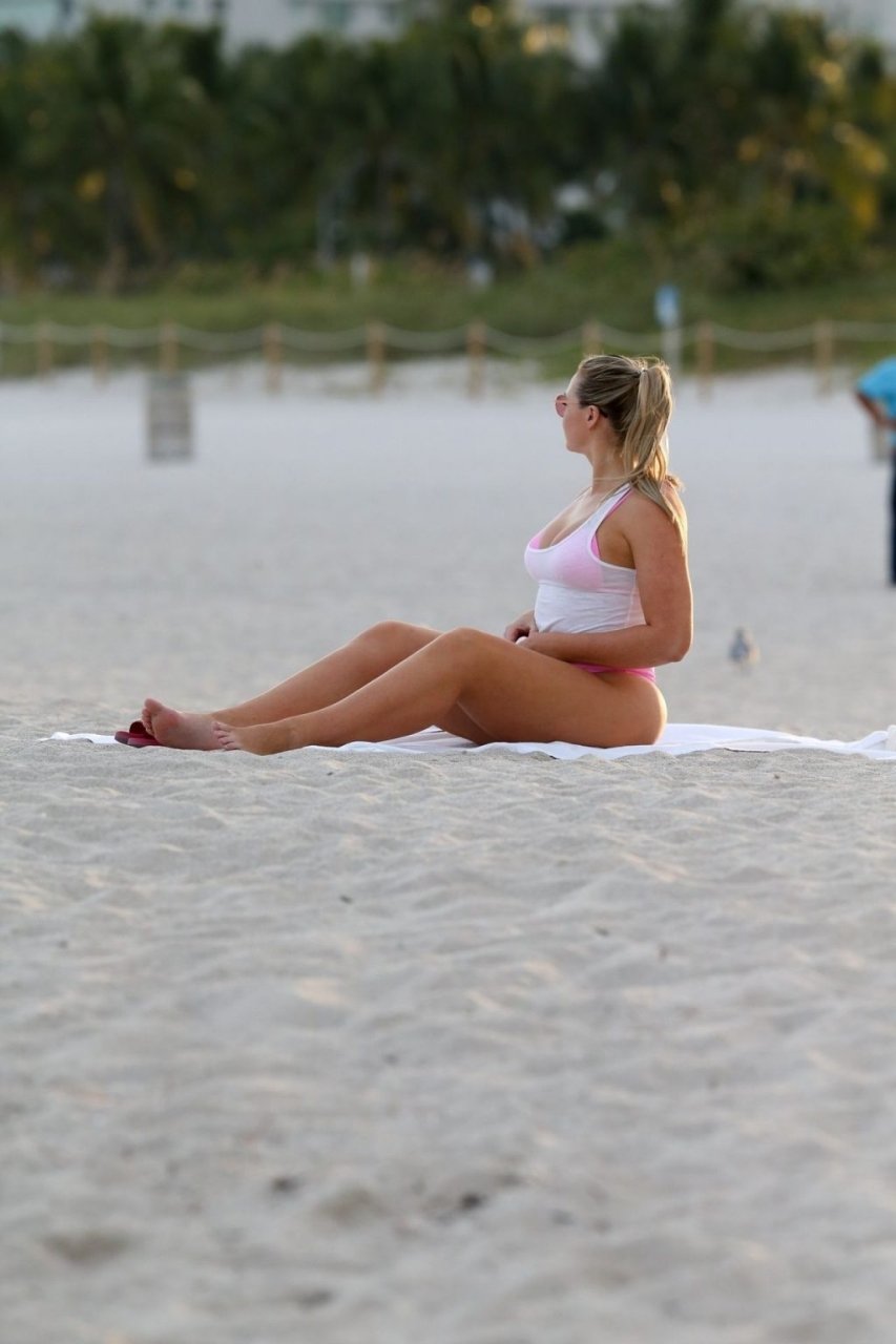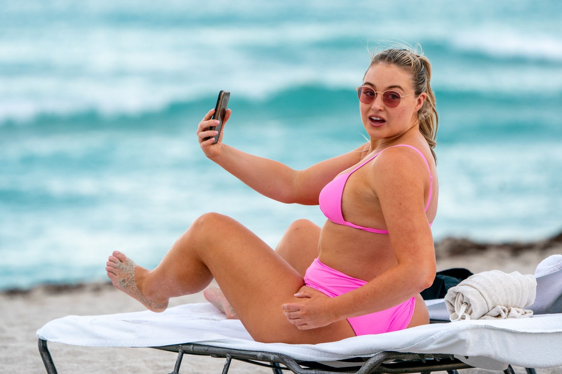 La modella Iskra Lawrence mostra le sue curve in spiaggia con un bikini rosa a Miami, 12/09/2018. Iskra è splendida mentre si gode la sua giornata in spiaggia.