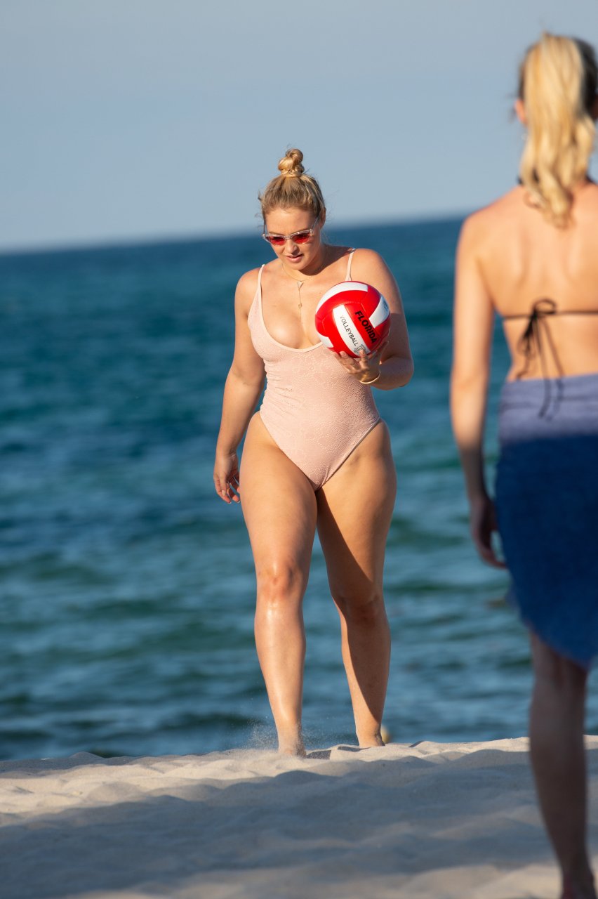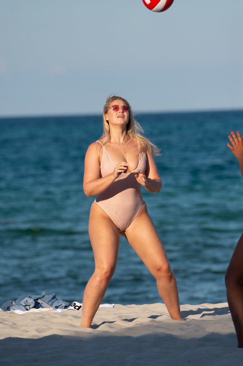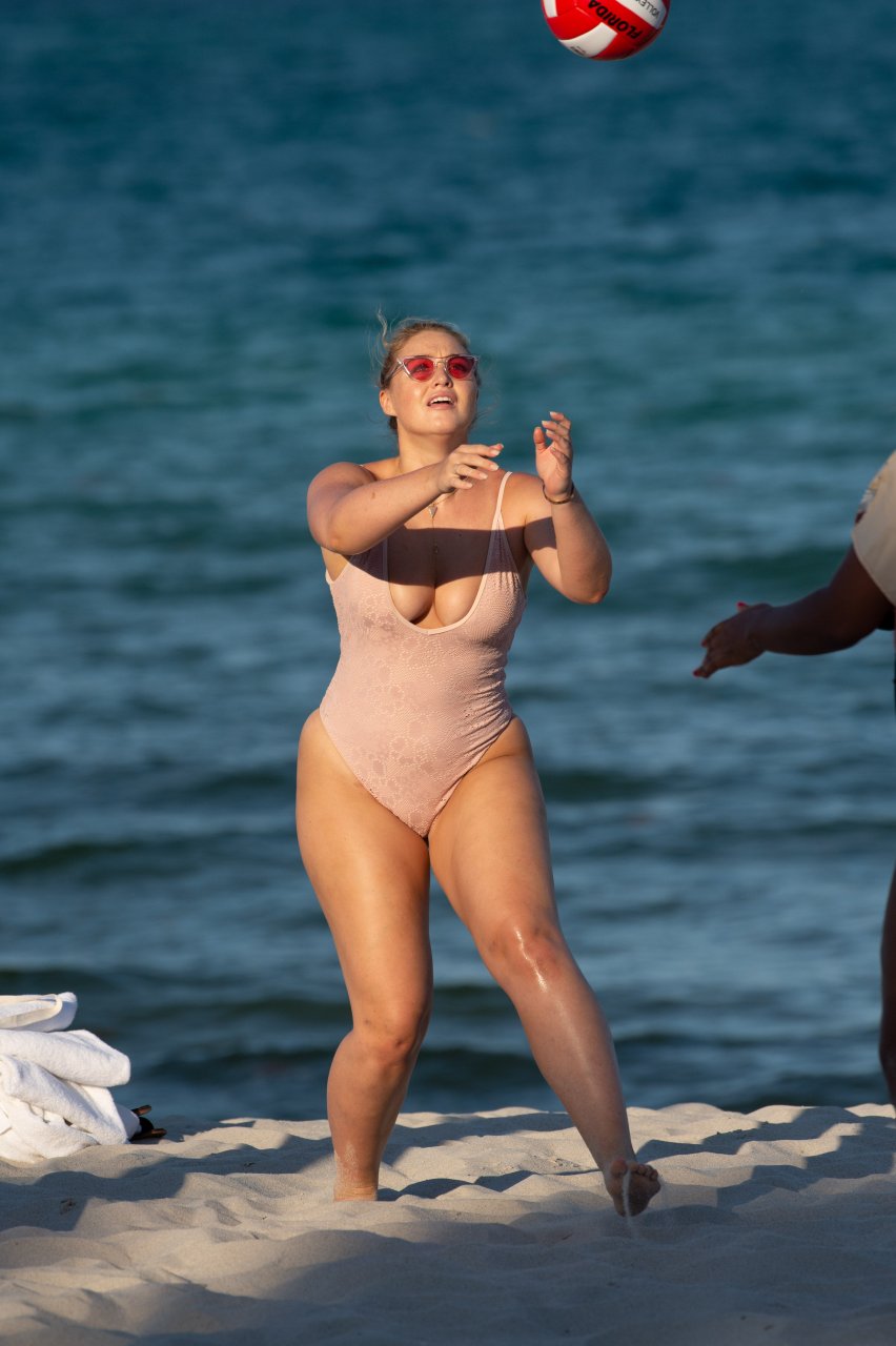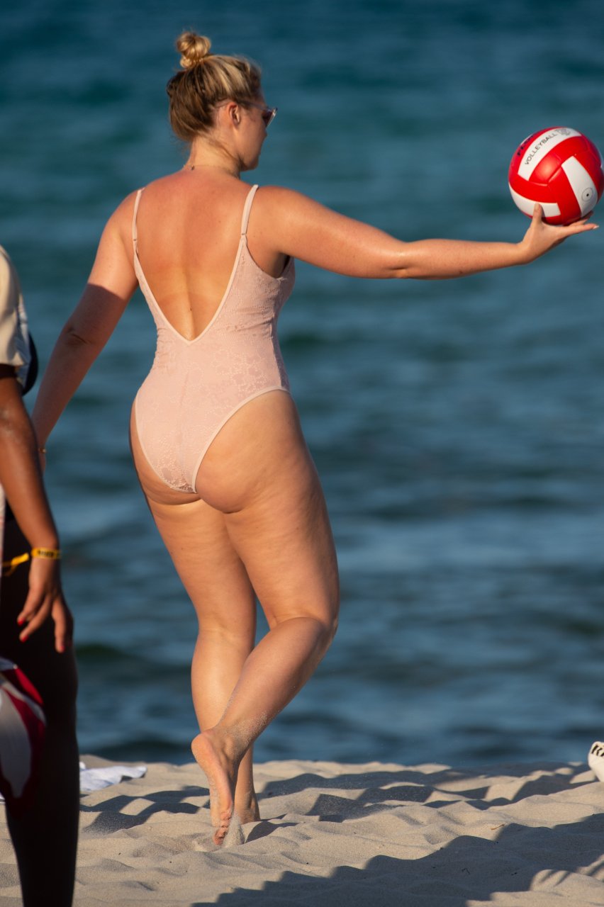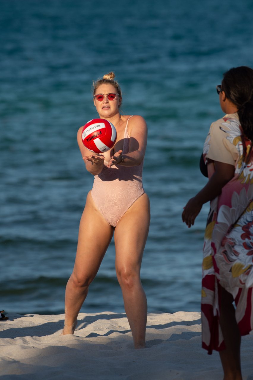 La modella Iskra Lawrence (27) è stata vista mentre si godeva il sole estivo e una partita di pallavolo con un costume intero rosa a Miami Beach, 14/07/2018.