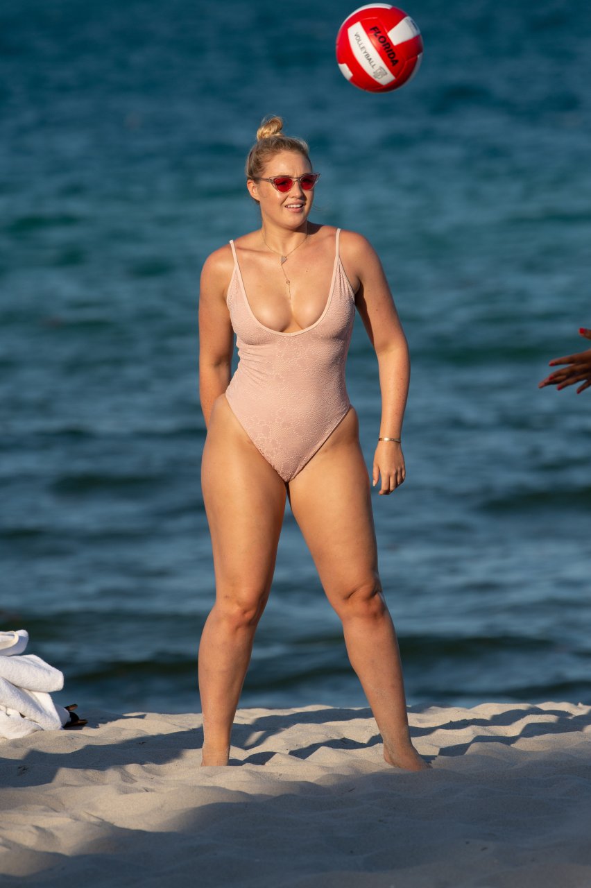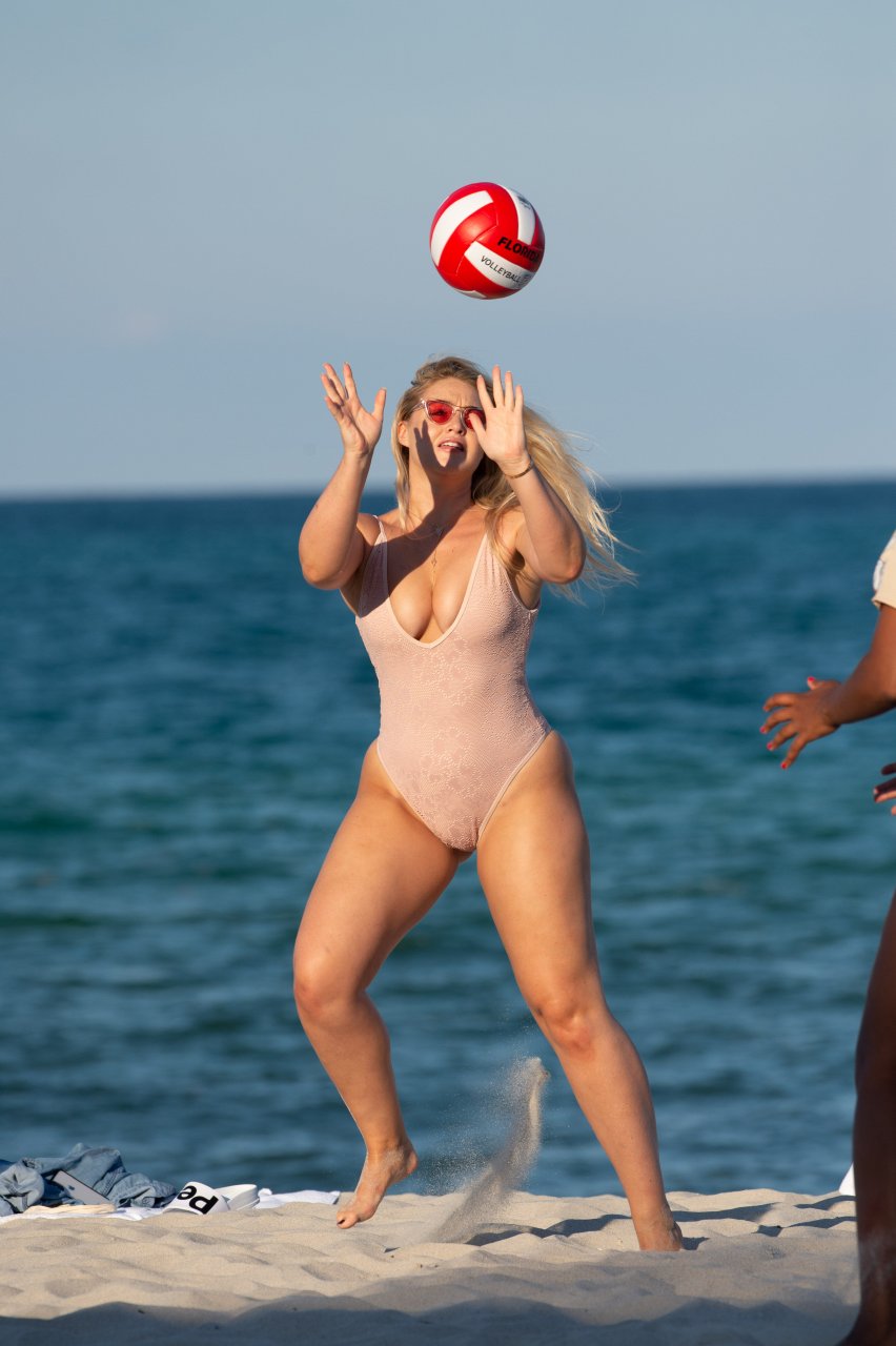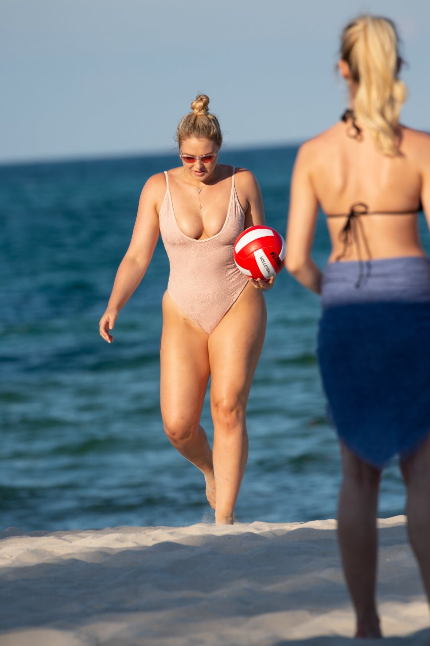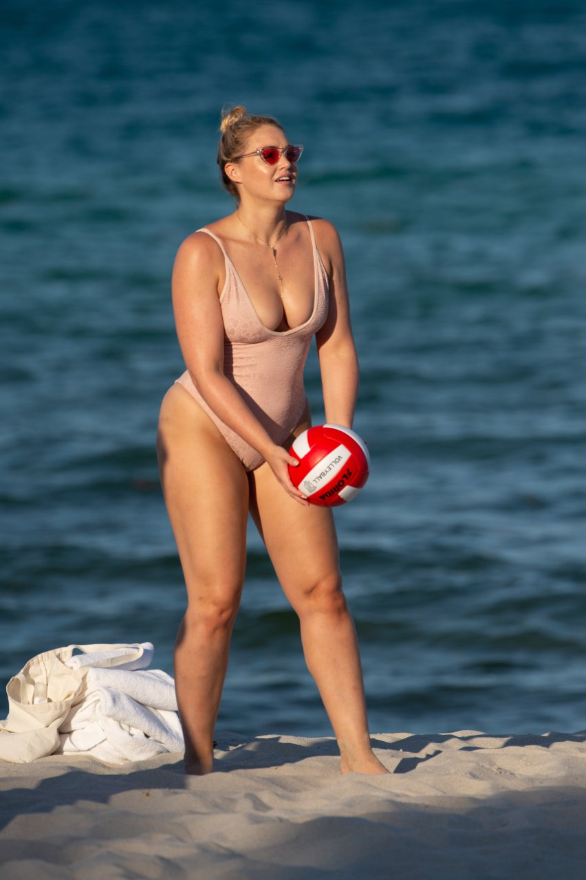 La modella Iskra Lawrence (27) è stata vista mentre si godeva il sole estivo e una partita di pallavolo con un costume intero rosa a Miami Beach, 14/07/2018.