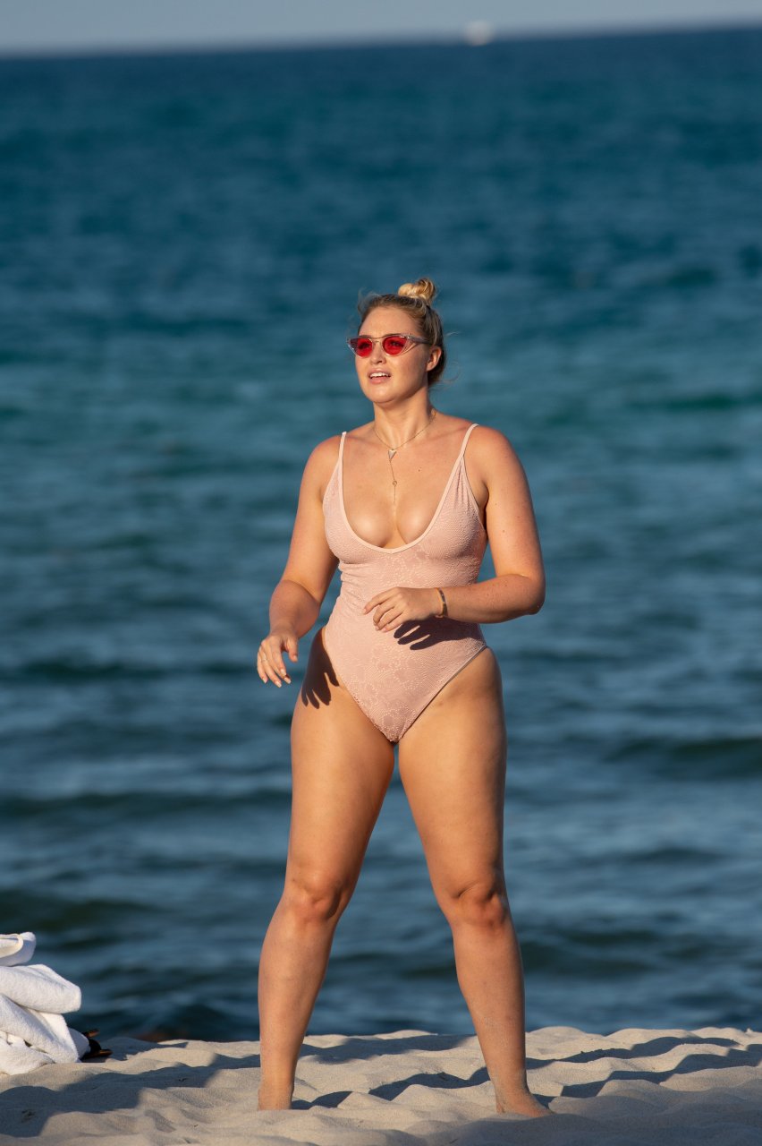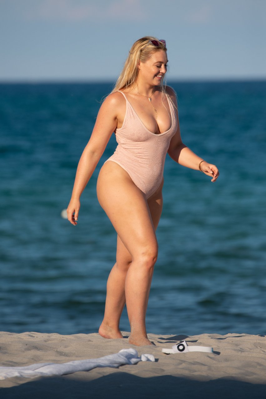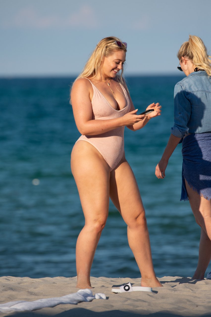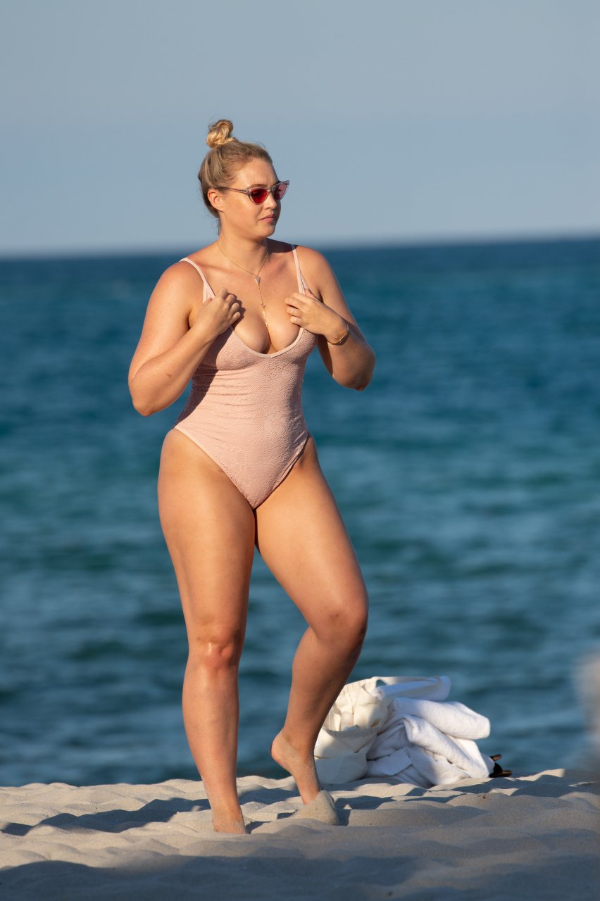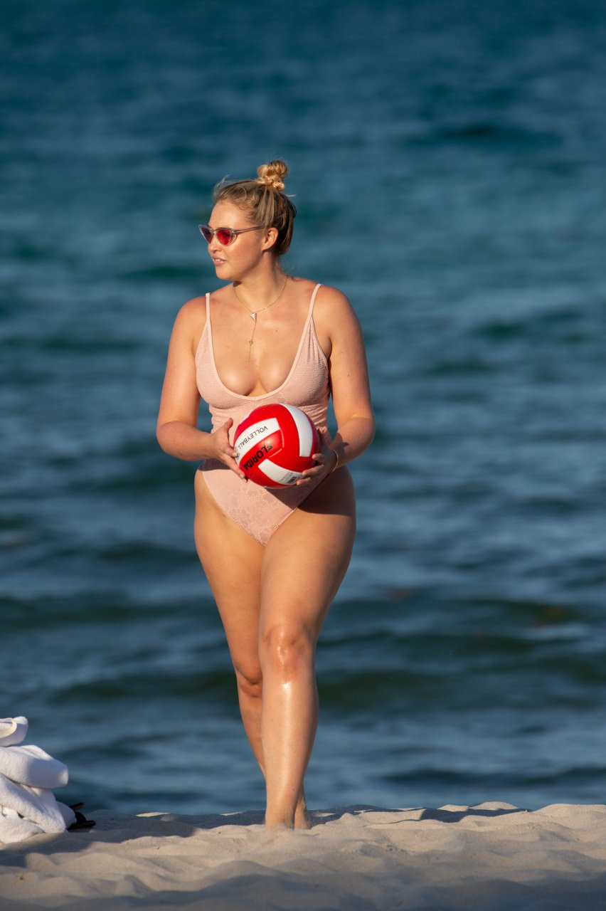 La modella Iskra Lawrence (27) è stata vista mentre si godeva il sole estivo e una partita di pallavolo con un costume intero rosa a Miami Beach, 14/07/2018.