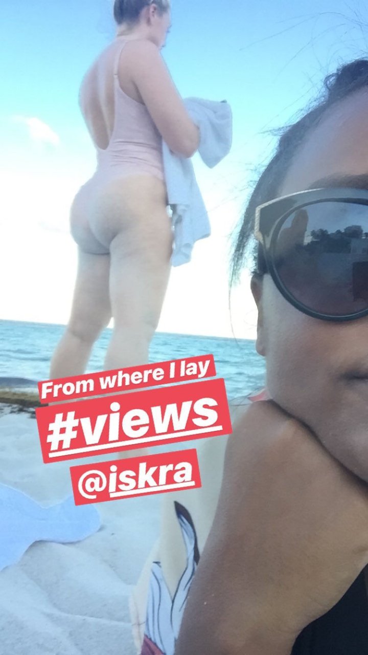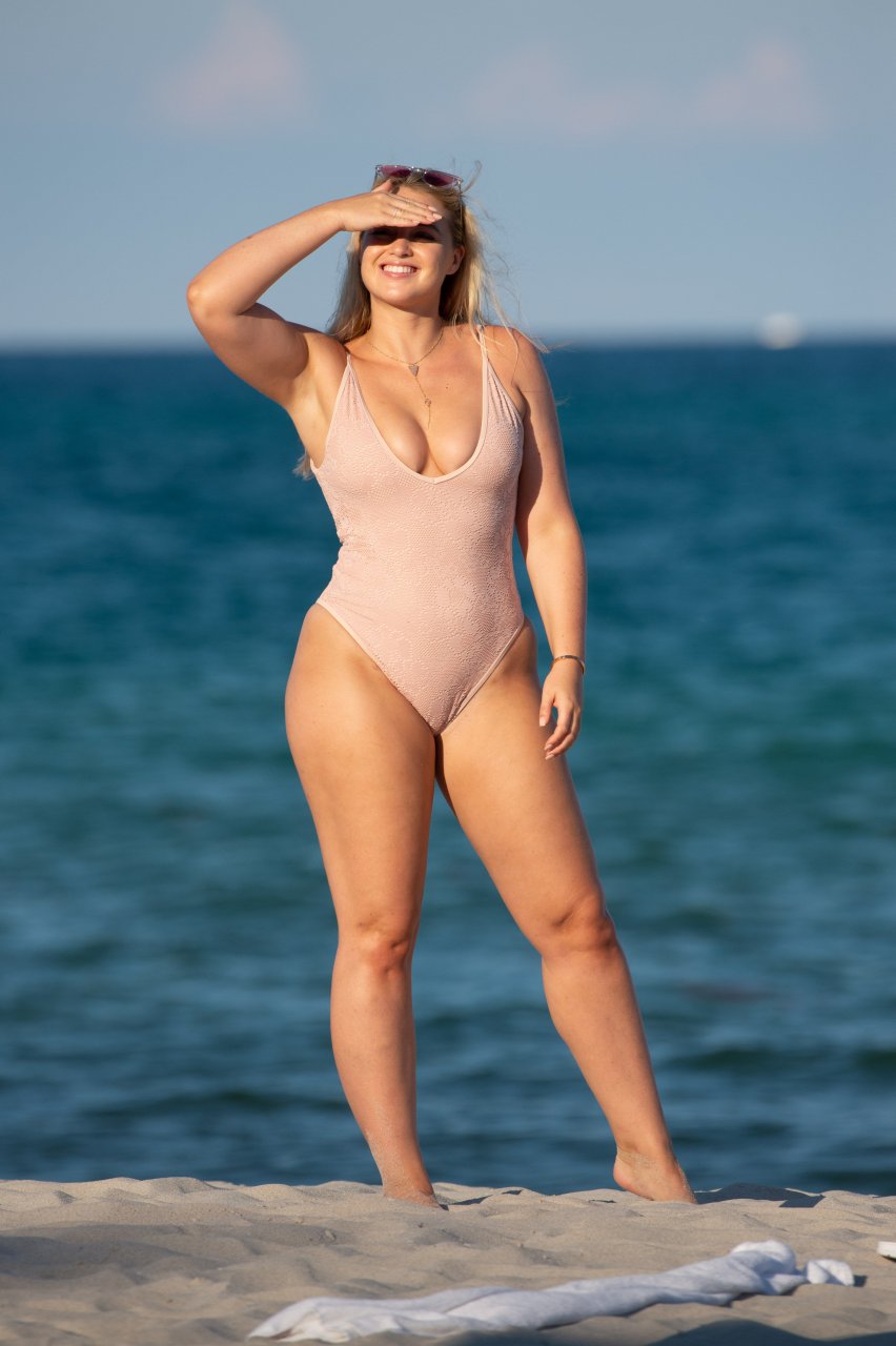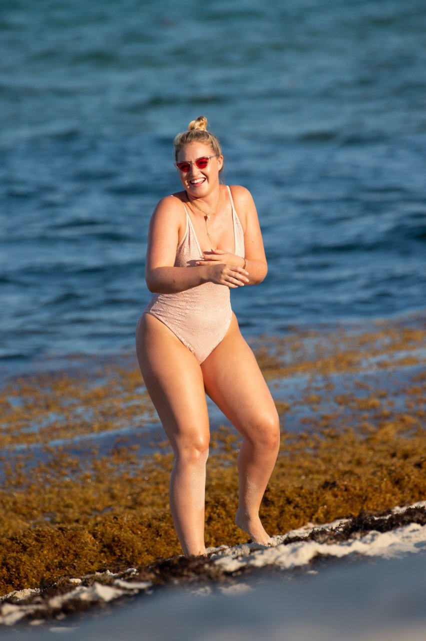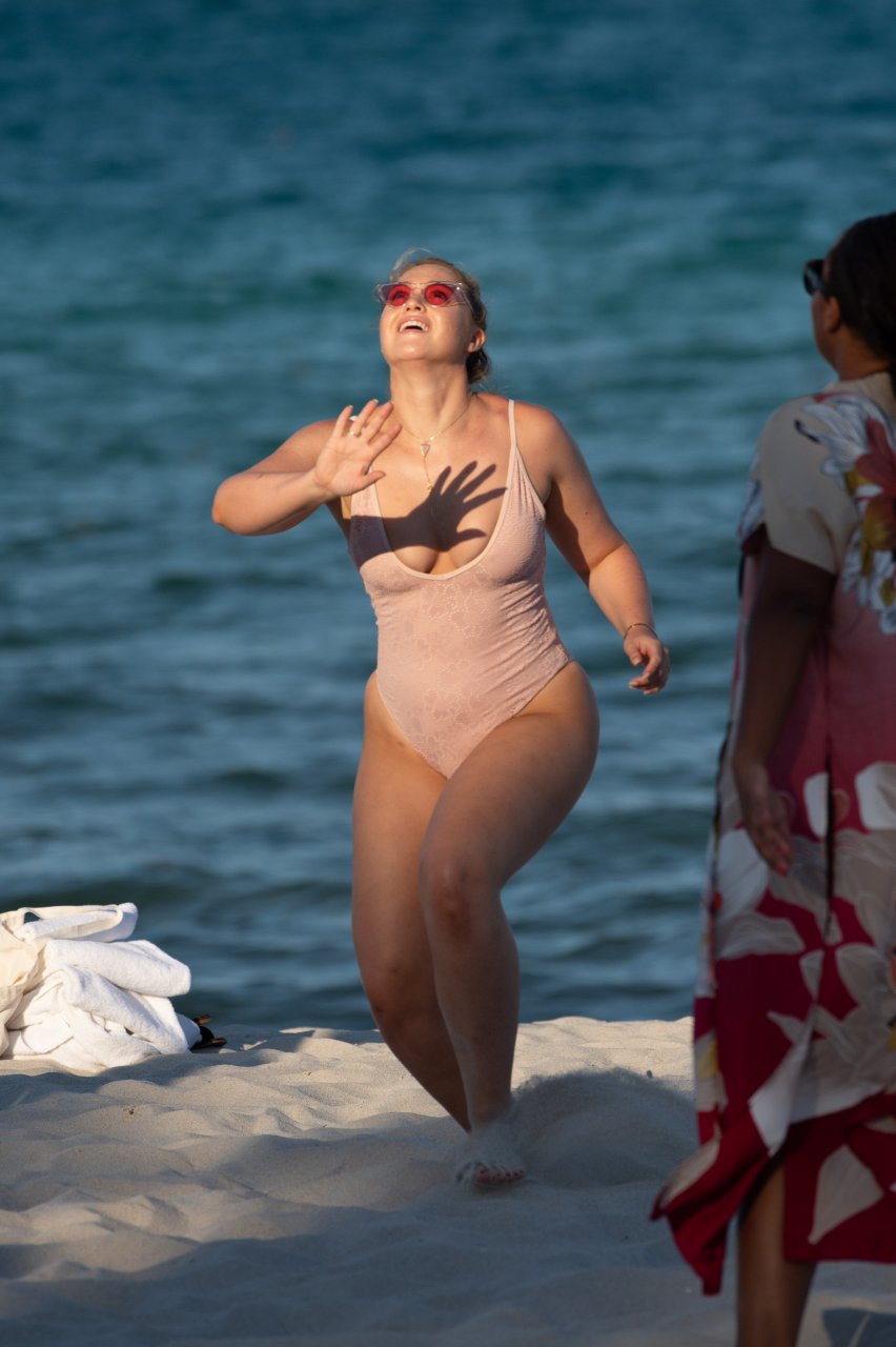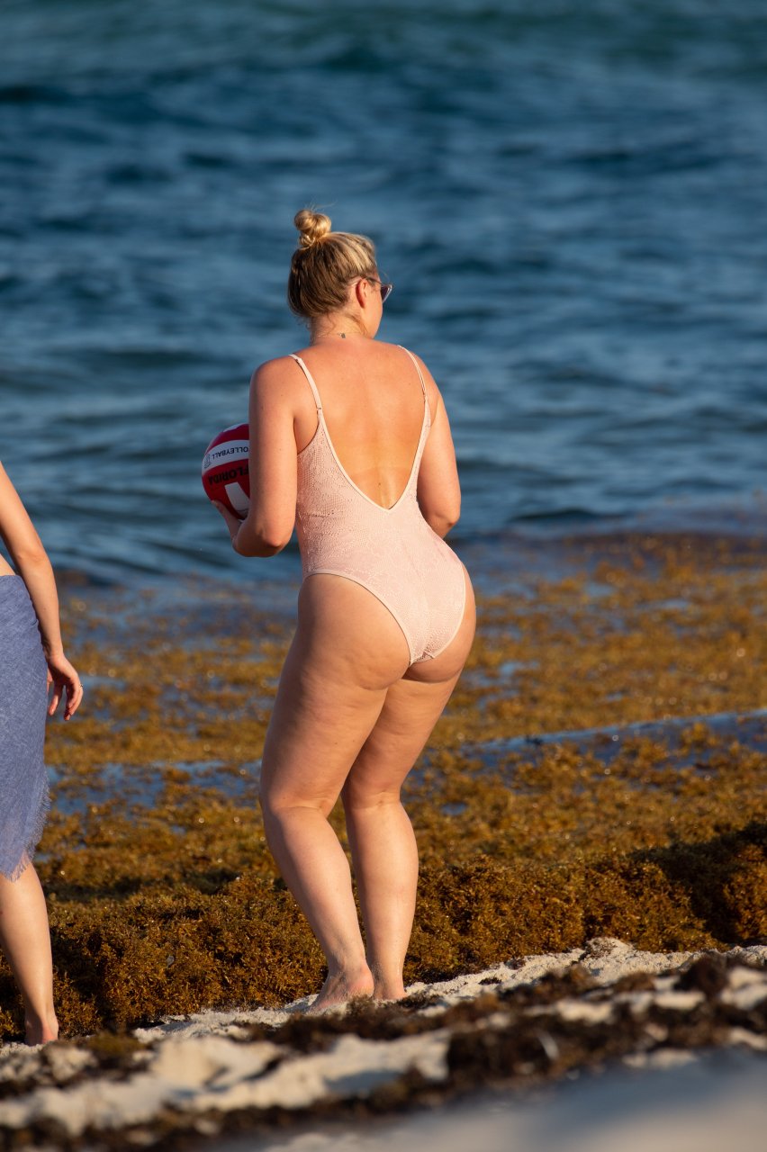 La modella Iskra Lawrence (27) è stata vista mentre si godeva il sole estivo e una partita di pallavolo con un costume intero rosa a Miami Beach, 14/07/2018.