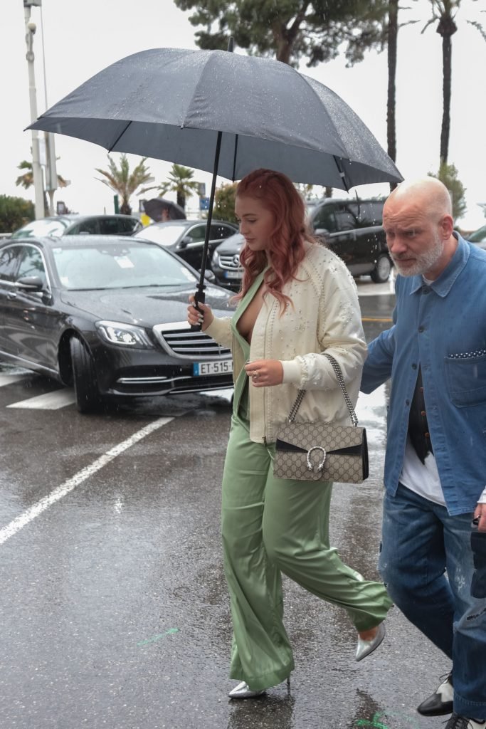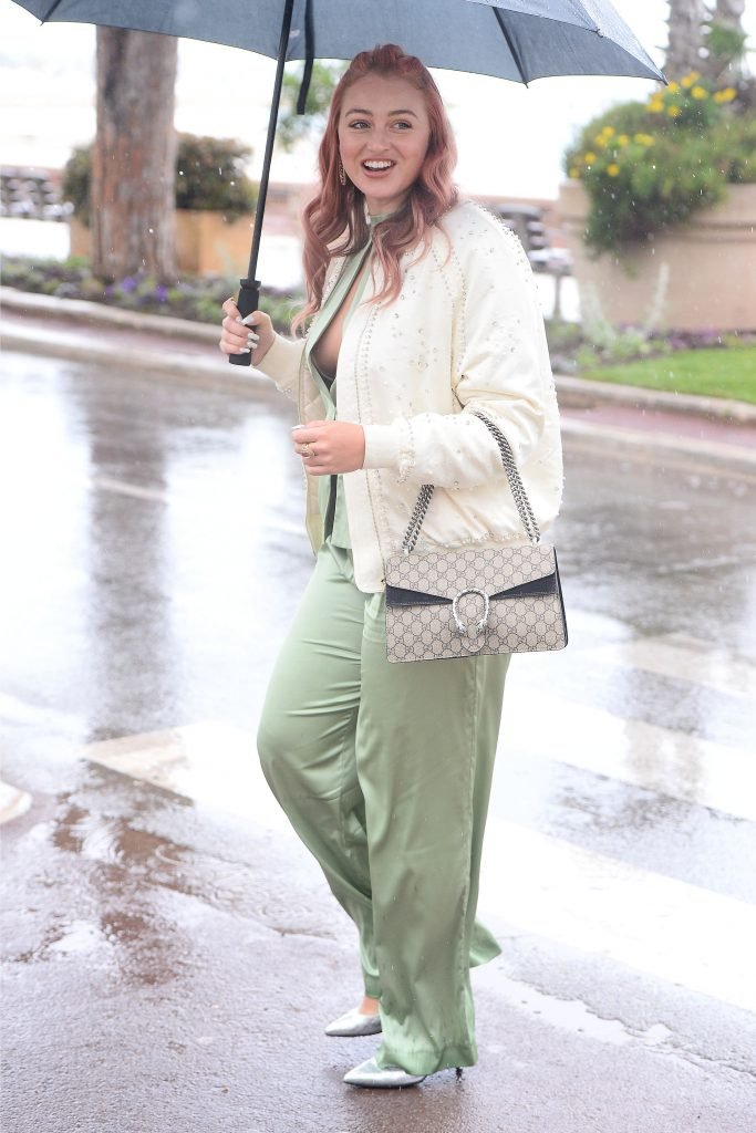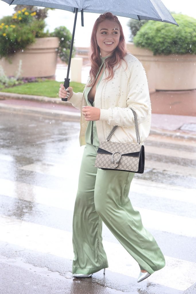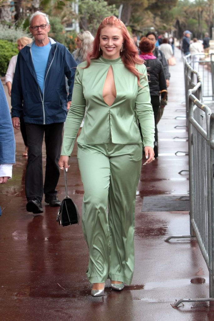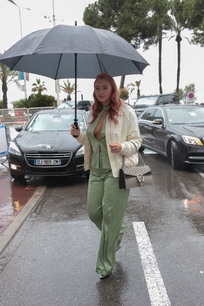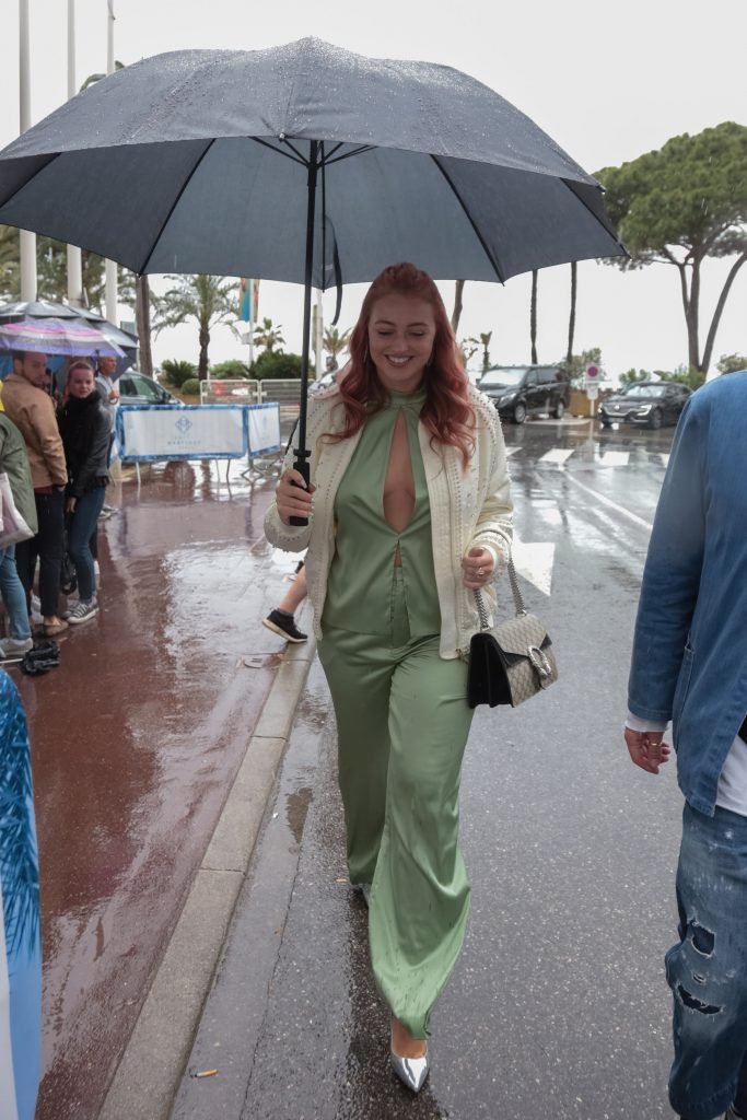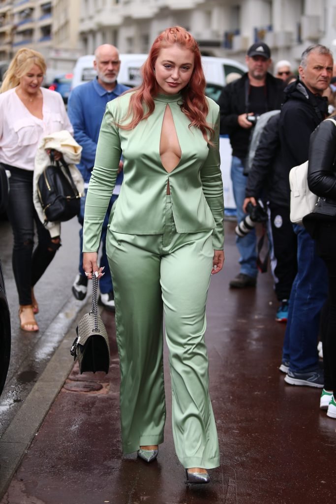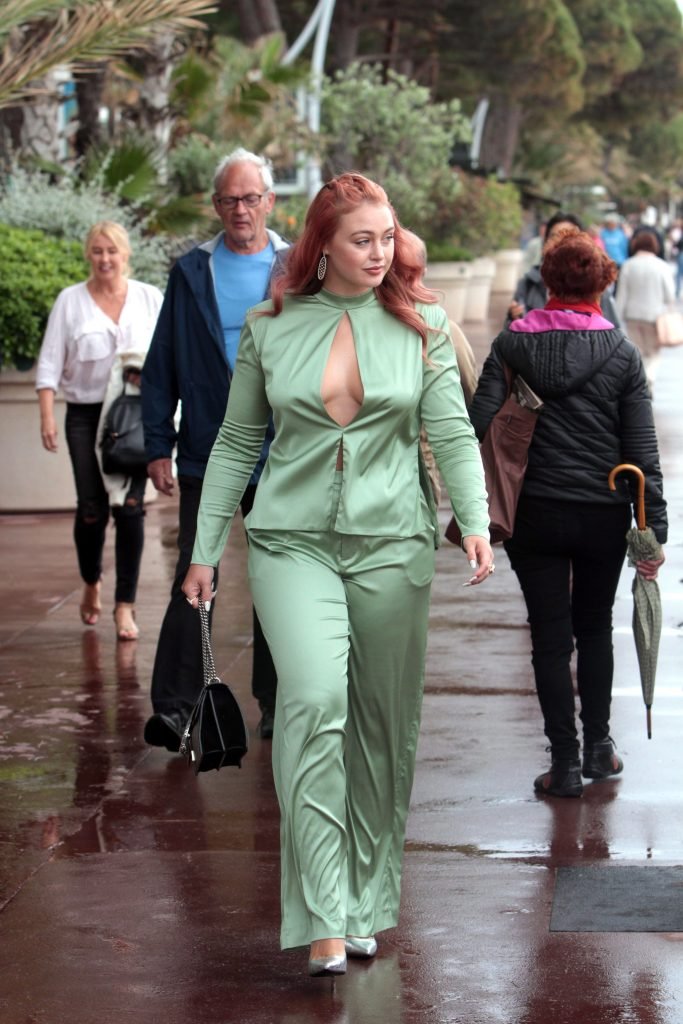 Iskra Lawrence è vista in un completo verde in una giornata piovosa alla Croisette di Cannes, Francia, 14/05/2018. L’attrice di 27 anni ha leggermente mostrato il seno grazie al taglio sulla giacca verde.