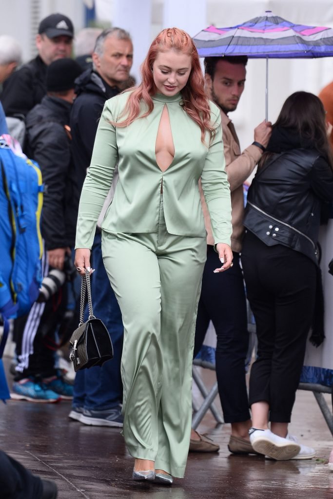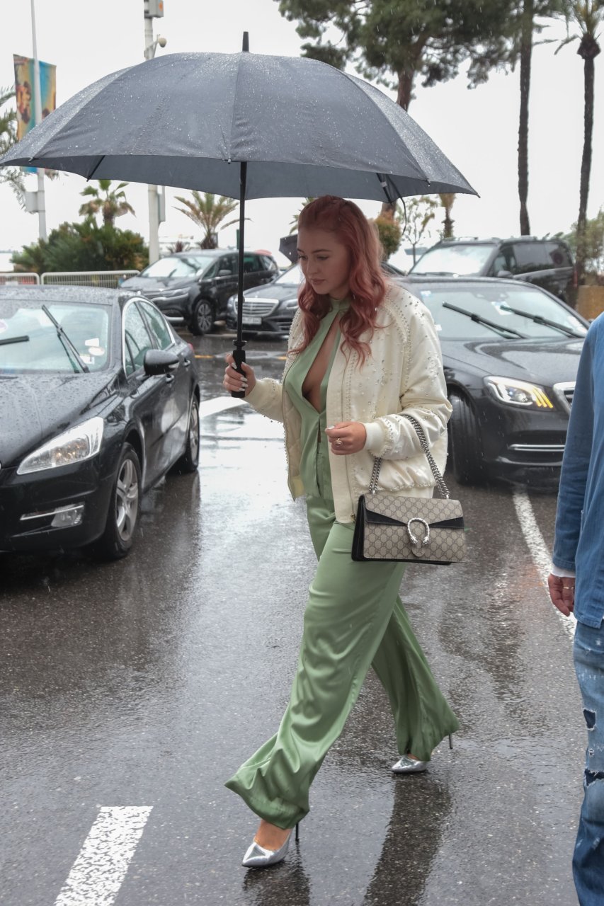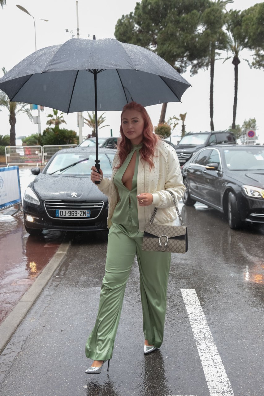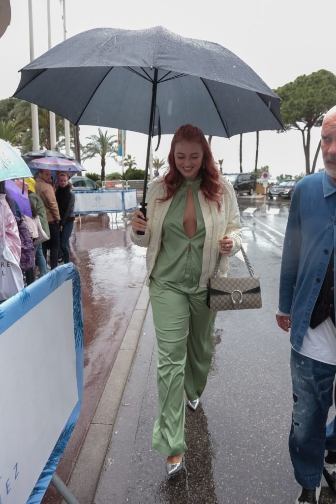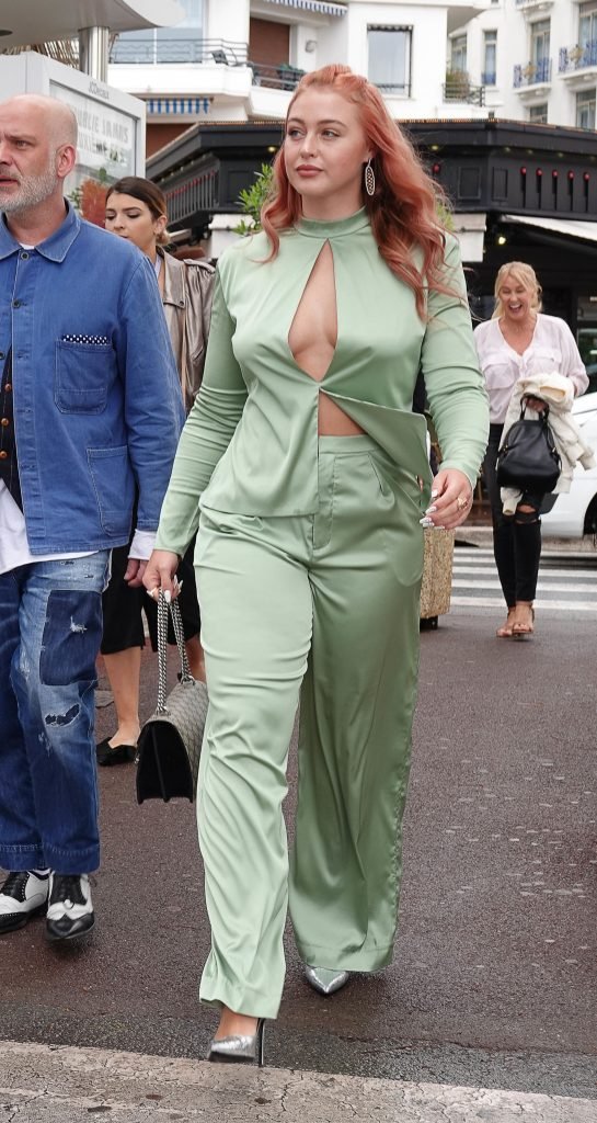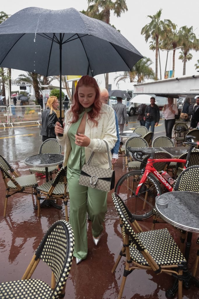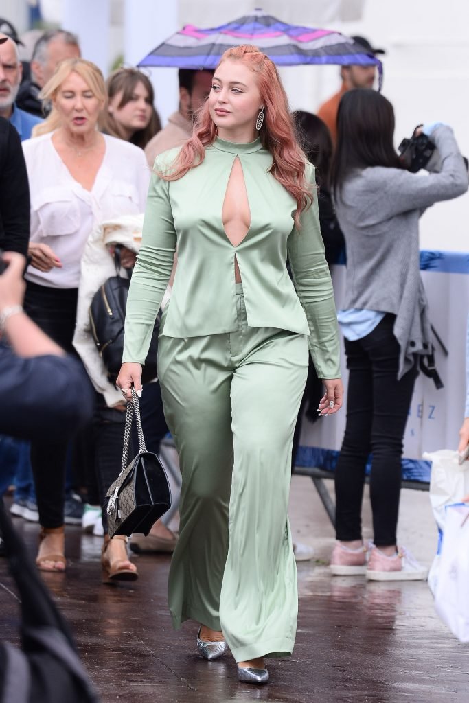 Iskra Lawrence è vista in un completo verde in una giornata piovosa alla Croisette di Cannes, Francia, 14/05/2018. L’attrice di 27 anni ha leggermente mostrato il seno grazie al taglio sulla giacca verde.