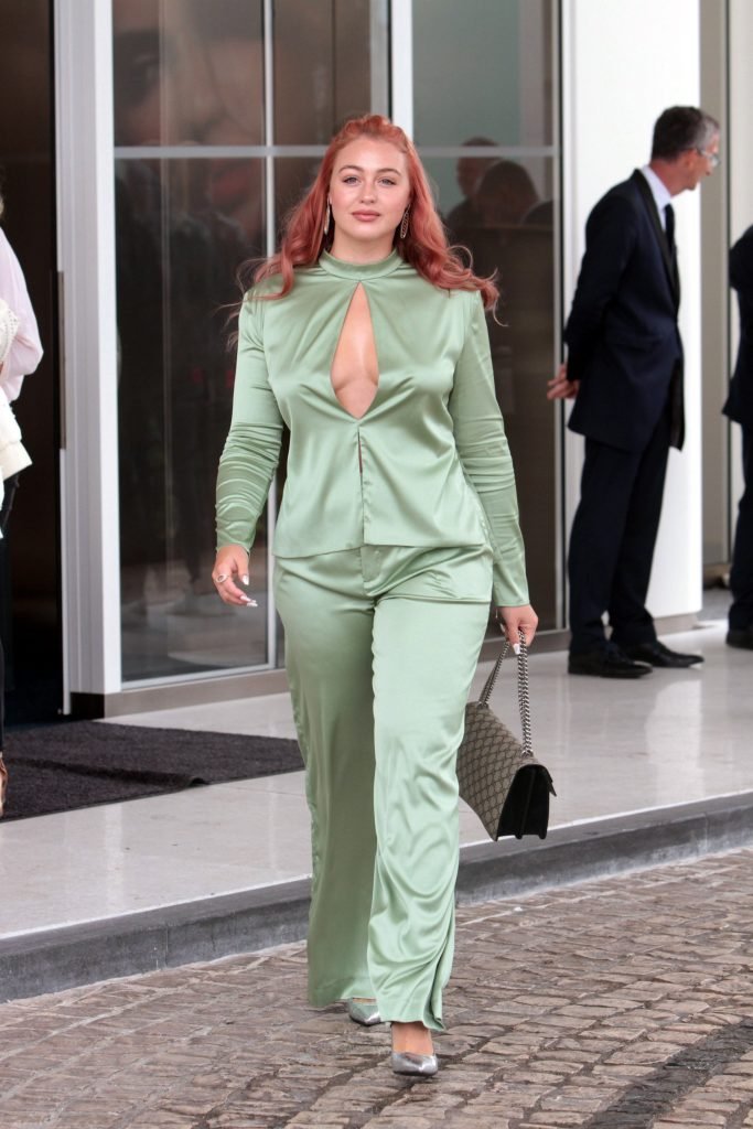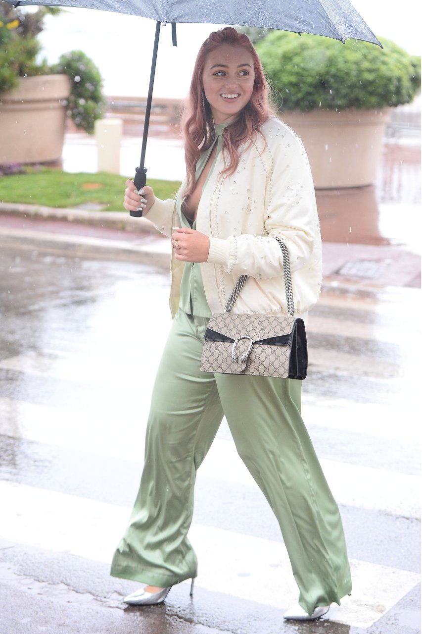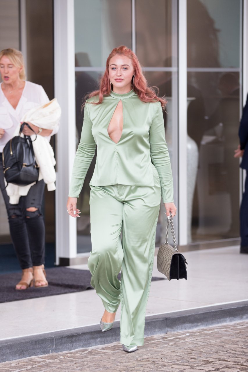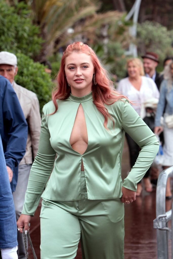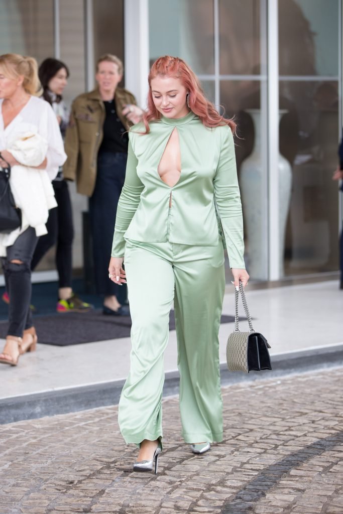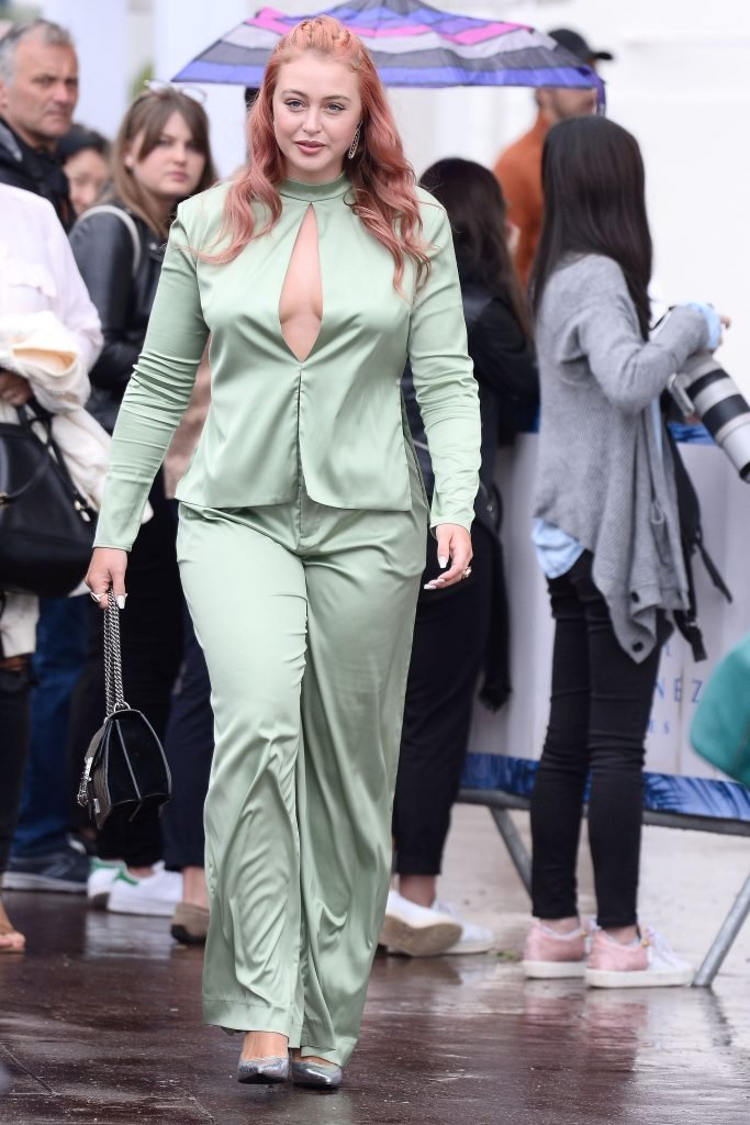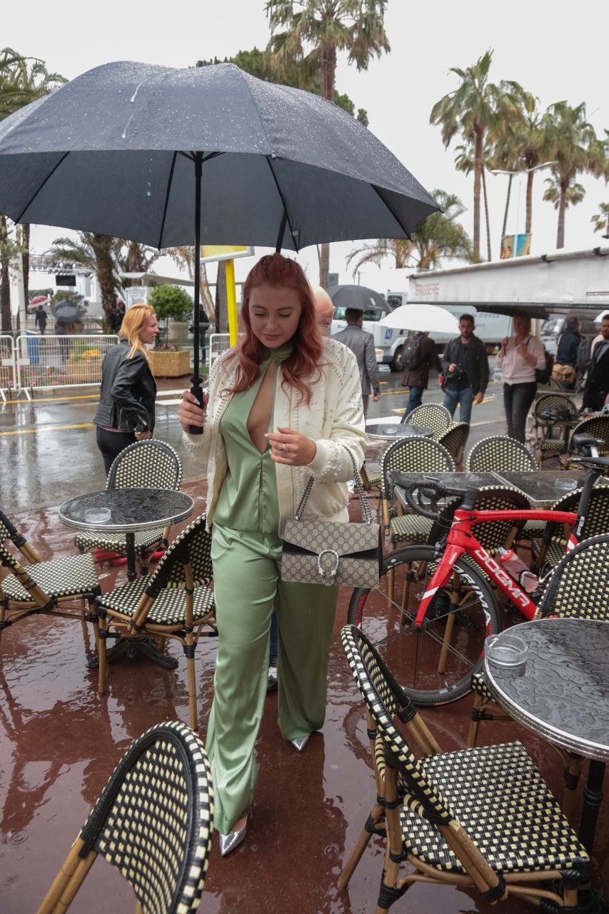 Iskra Lawrence è vista in un completo verde in una giornata piovosa alla Croisette di Cannes, Francia, 14/05/2018. L’attrice di 27 anni ha leggermente mostrato il seno grazie al taglio sulla giacca verde.