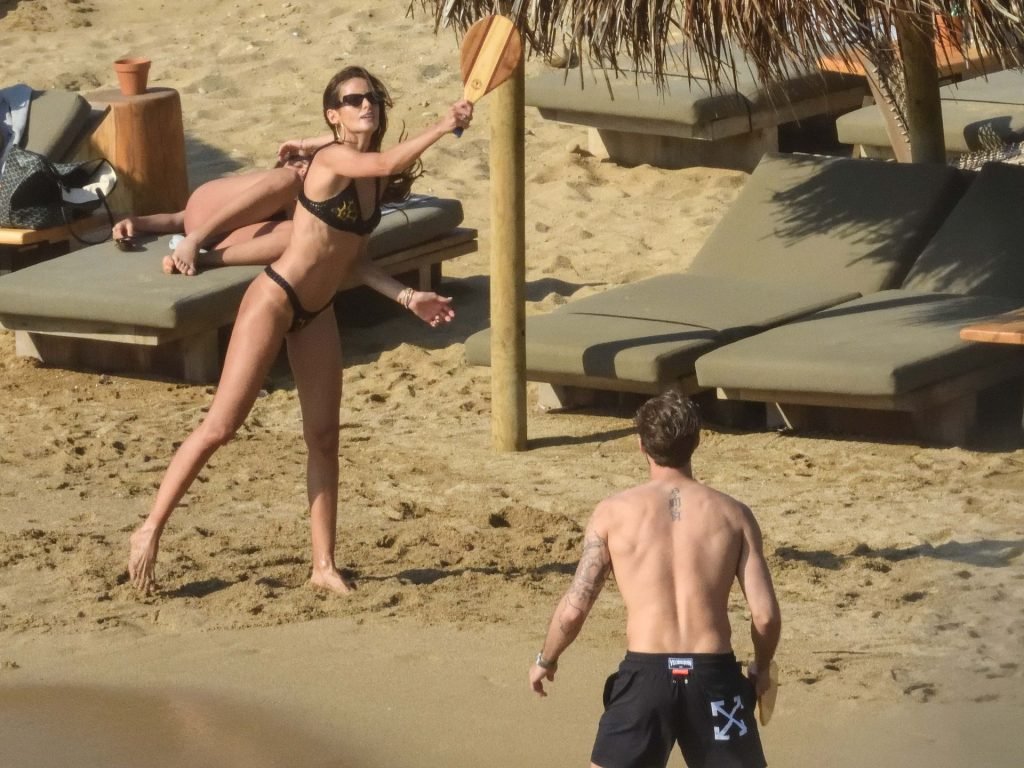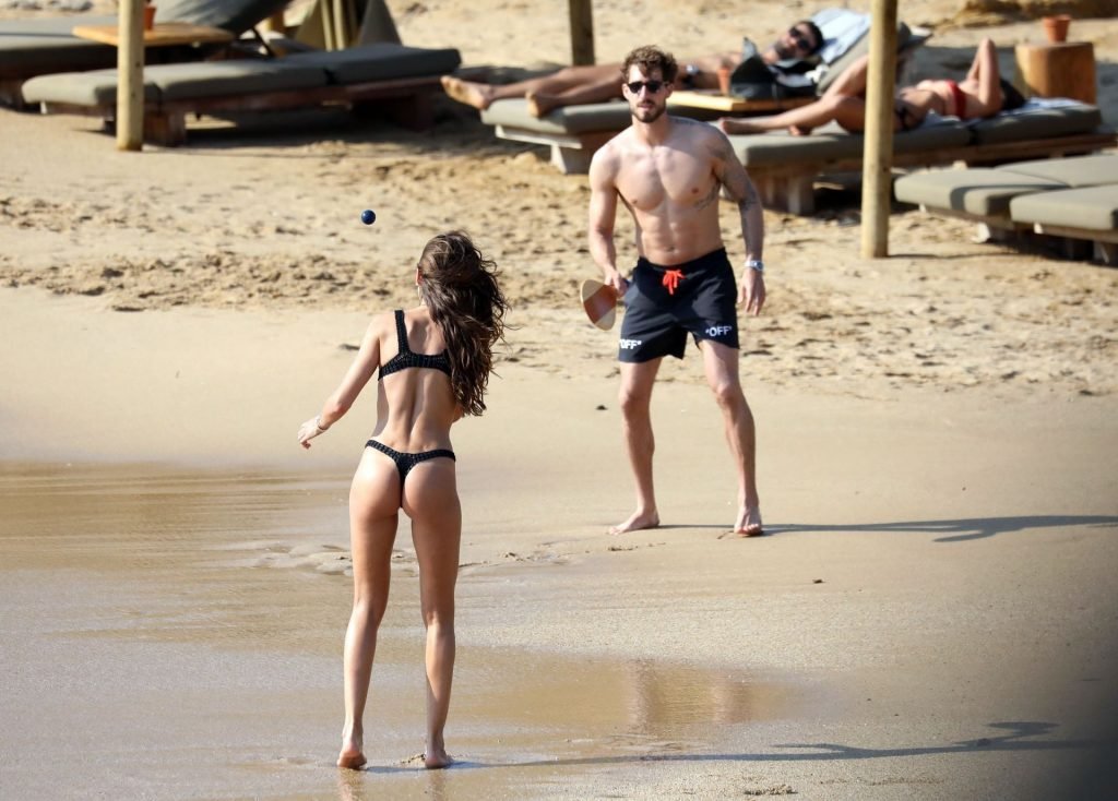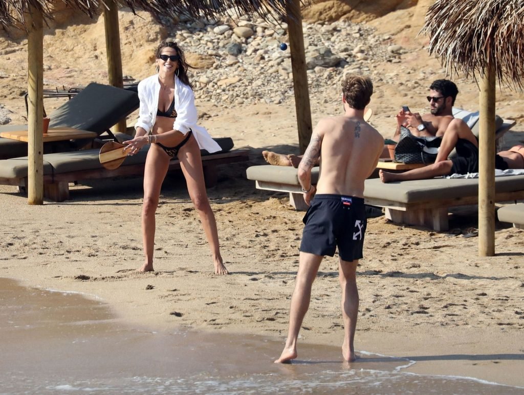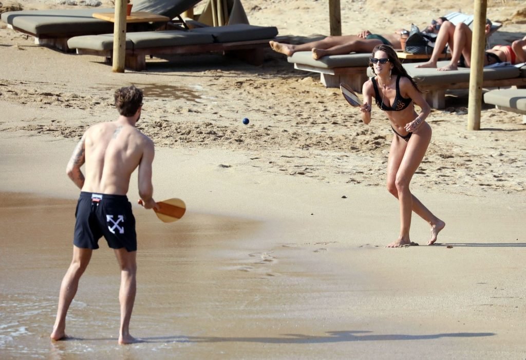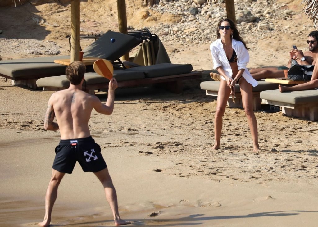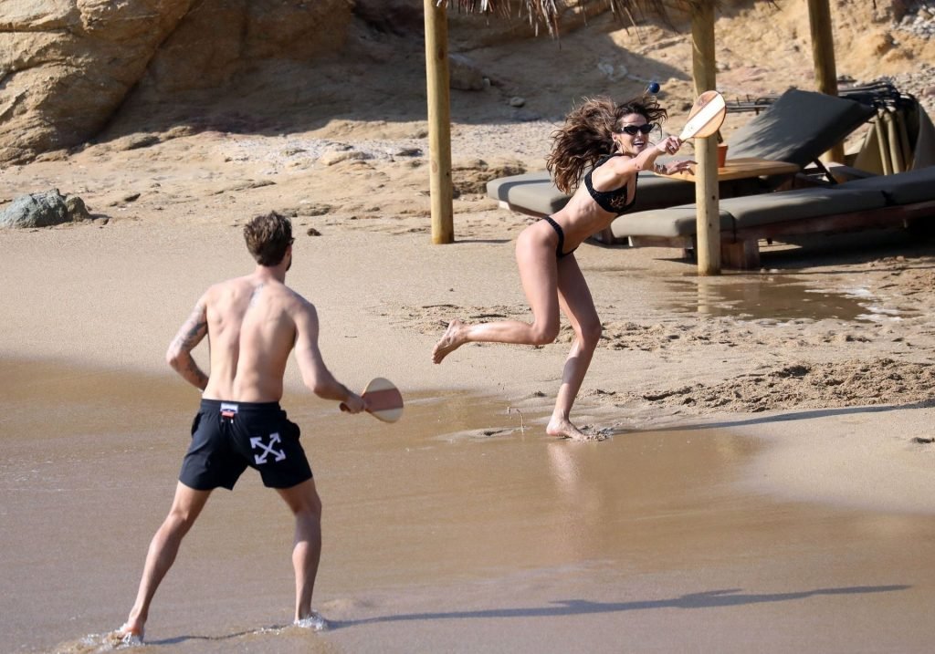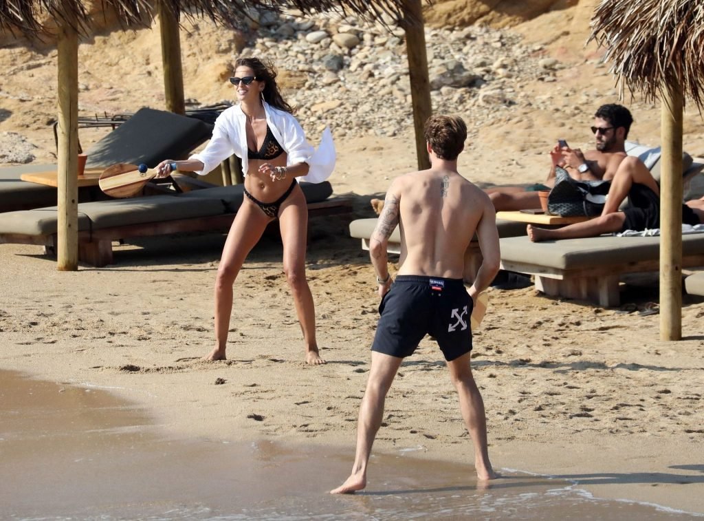 La modella brasiliana Izabel Goulart e il fidanzato calciatore Kevin Trapp sono stati fotografati mentre si divertivano a giocare a paddle ball sulla spiaggia durante una vacanza sull’isola greca di Mykonos, 27/06/2019.