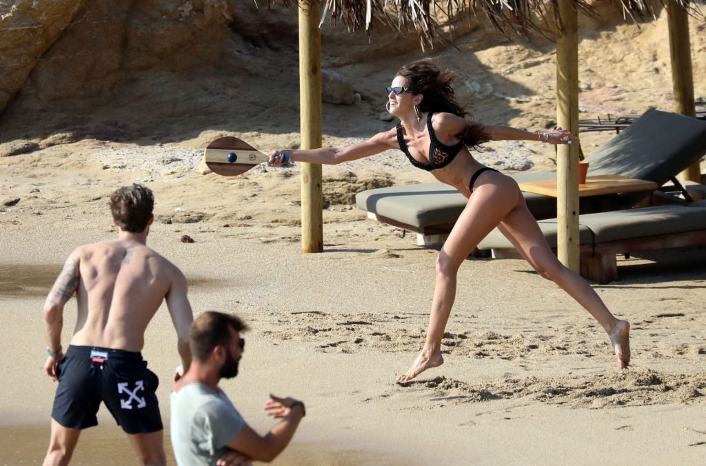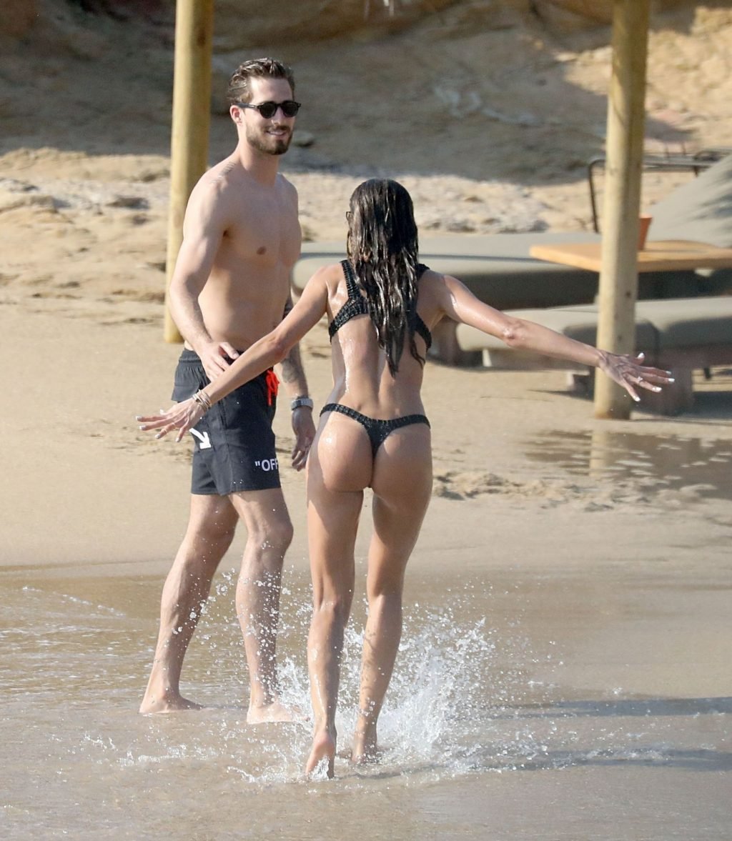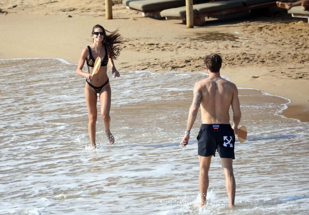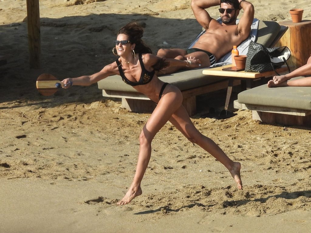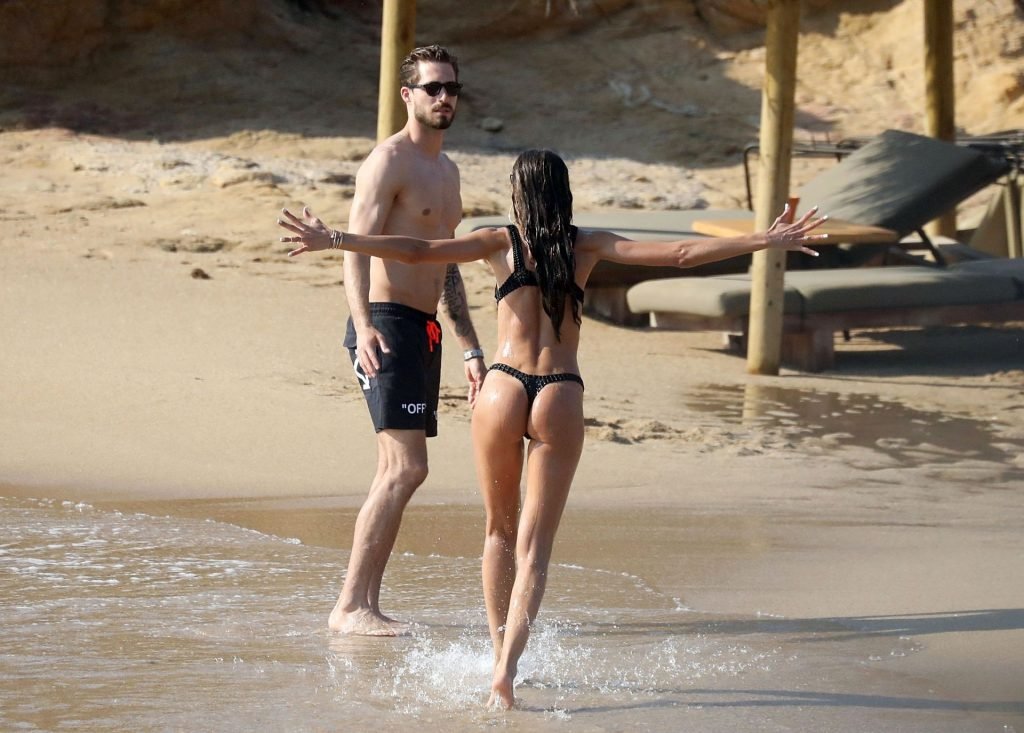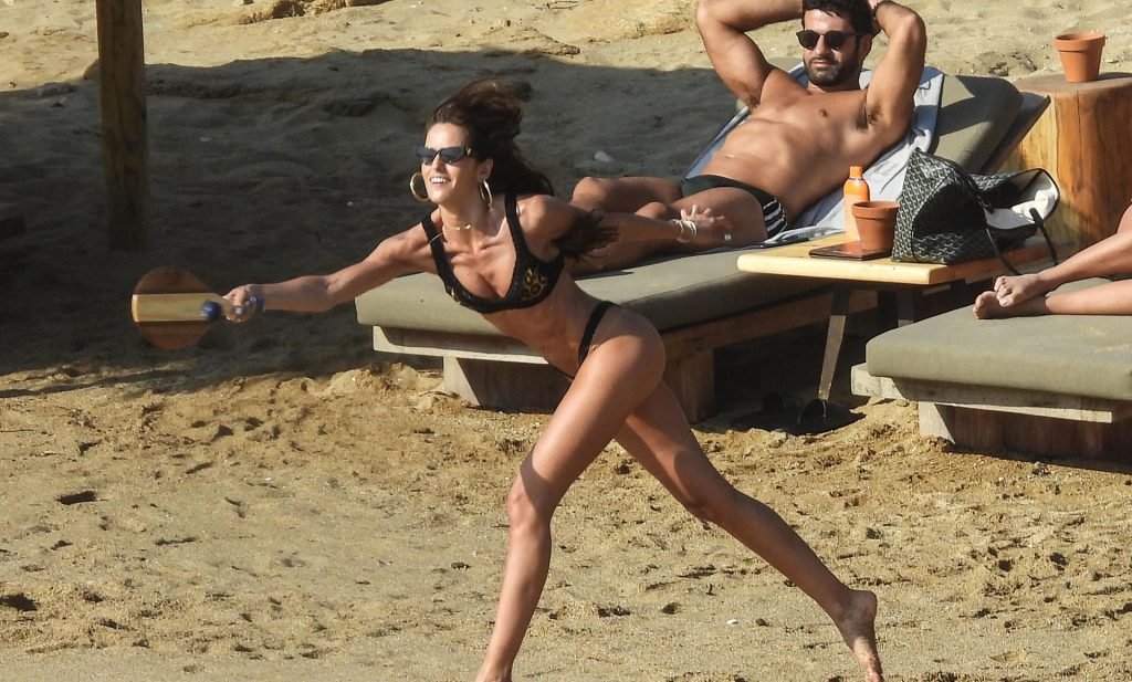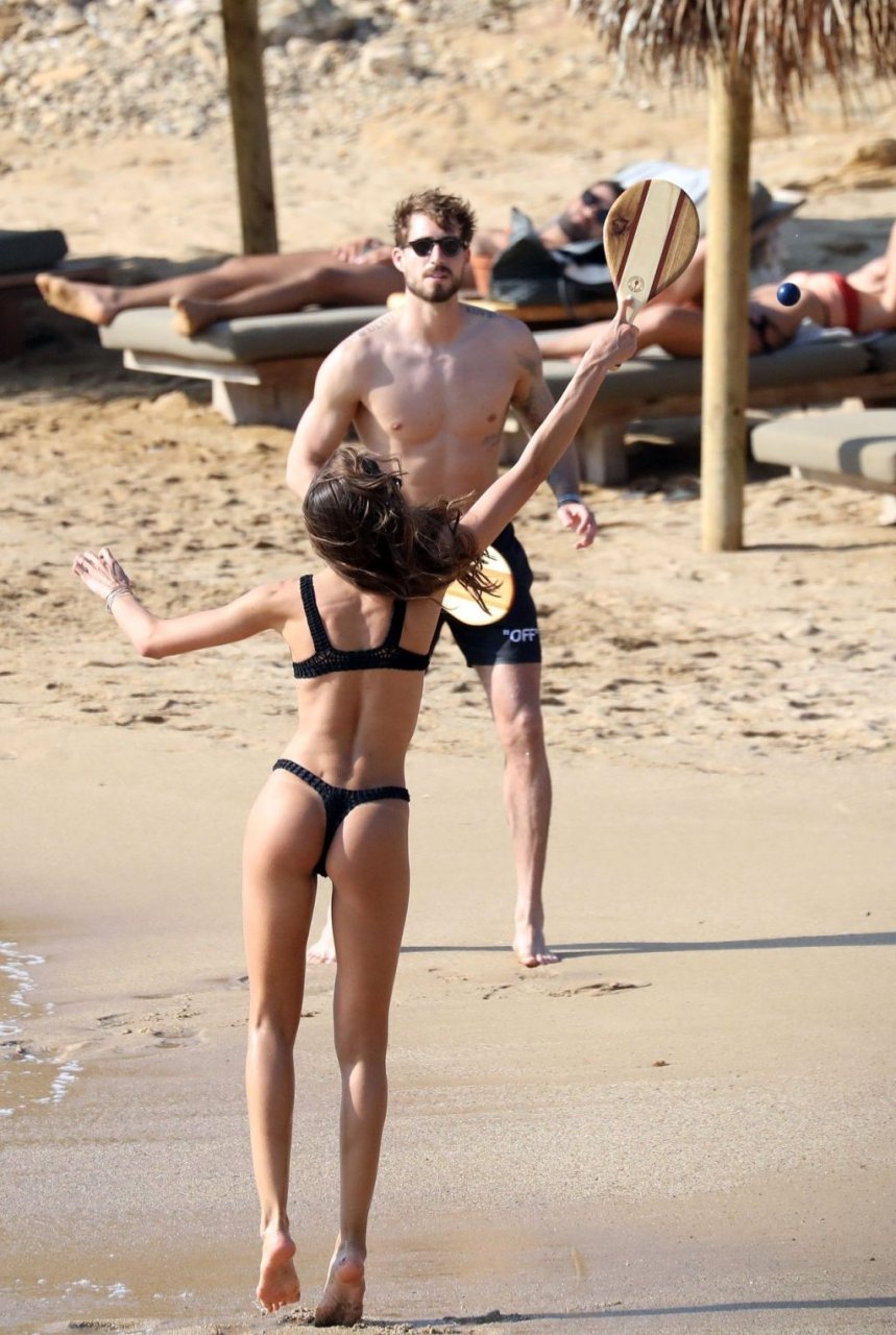 La modella brasiliana Izabel Goulart e il fidanzato calciatore Kevin Trapp sono stati fotografati mentre si divertivano a giocare a paddle ball sulla spiaggia durante una vacanza sull’isola greca di Mykonos, 27/06/2019.