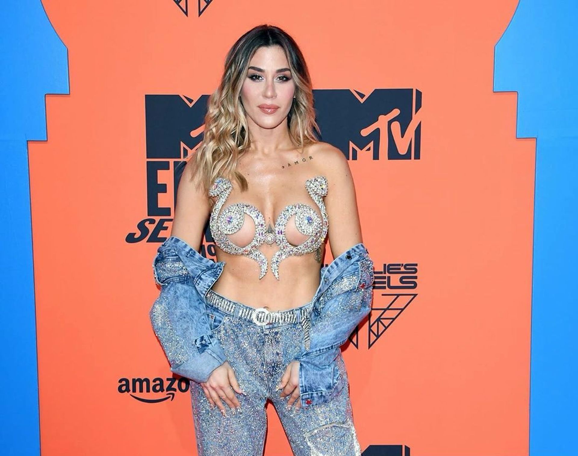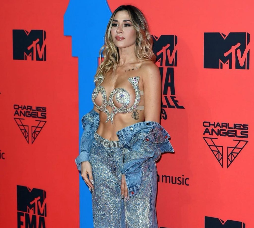 J Mena posa sul tappeto rosso mentre arriva agli MTV Europe Music Awards 2019 al FIBES Conference and Exhibition Centre di Siviglia, Spagna, 3 novembre 2019. Ha mostrato il suo seno, indossando un reggiseno interessante. Jimena Barón (alias J Mena) è un’attrice e cantante argentina. È la sorella dell’attore Federico Barón.