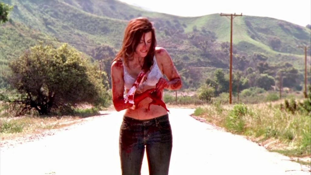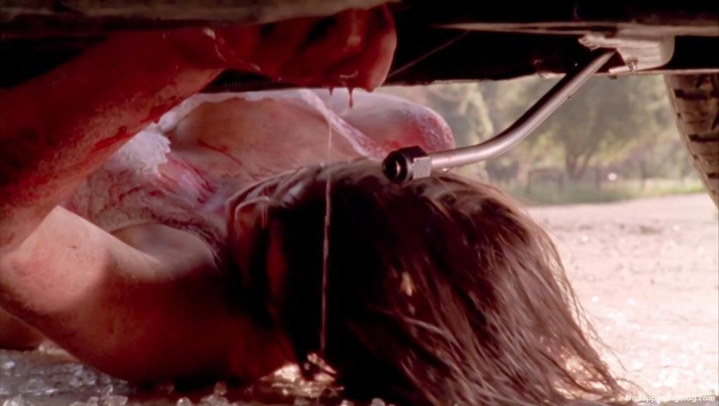 Jaimie is in an office as she rips her white tanktop off to reveal a white lace bra and then grabs an empty liquor bottle and goes outside. She then tries to pop the hood of a car before getting underneath and using a hose to pour gasoline out of the car and into the bottle. Finally she stands in the middle of the road trying to light a match as a car drives towards her until she gets the Molotov cocktail lit and throws it at the car causing it to explode all while she’s still just in her bra and jeans.