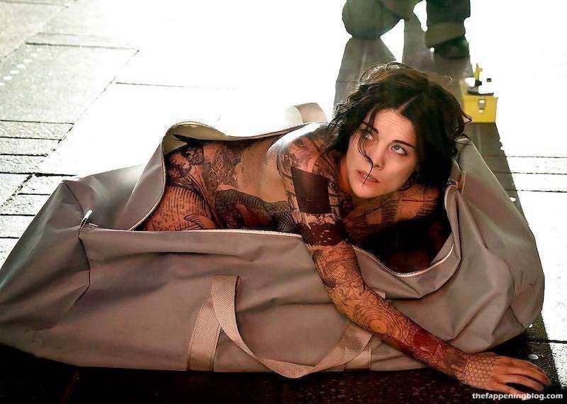 Jaimie Alexander is unzipping herself from a bag in the middle of Times Square and then standing up naked covered in tattoos as policemen shine a spotlight over her body and then make her get down on her knees.