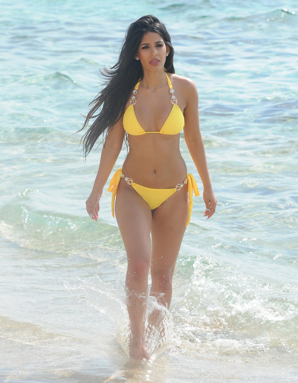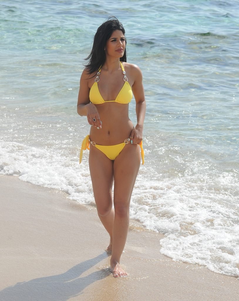 Jasmin Walia indossa un bikini giallo sulla spiaggia di Ibiza, 07/05/2017. Jasmin Walia è una star televisiva inglese, cantante, attrice di origine indiana. Età: 27.