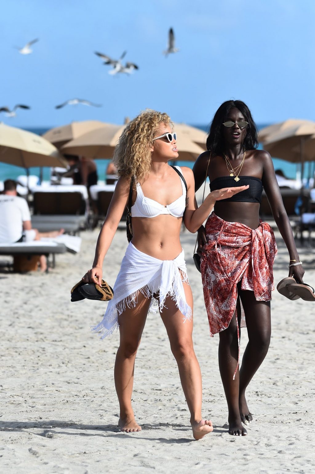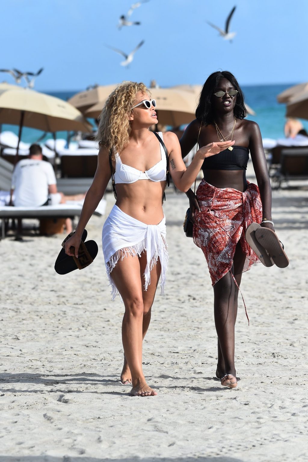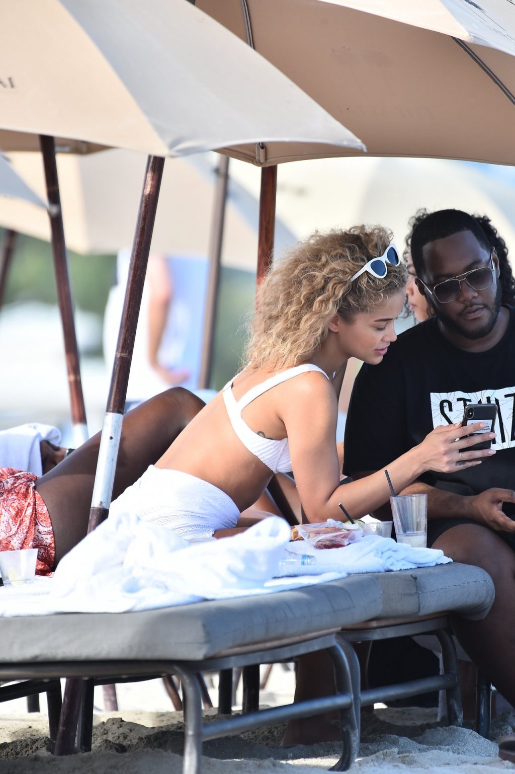 La modella di Sports Illustrated Jasmine Sanders indossa un bikini bianco con un copricostume abbinato sulla spiaggia con amici a Miami Beach, 11/12/2019.