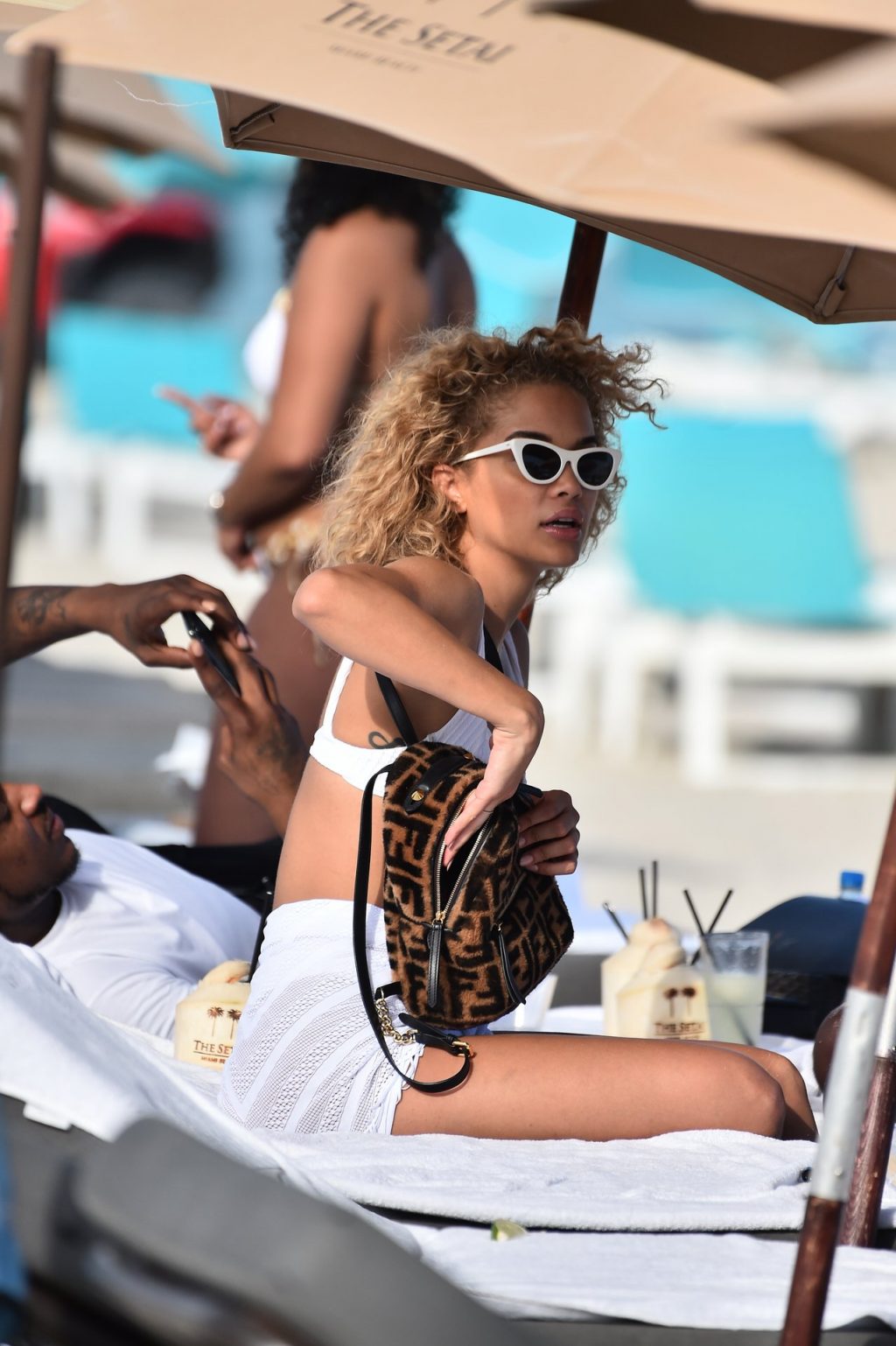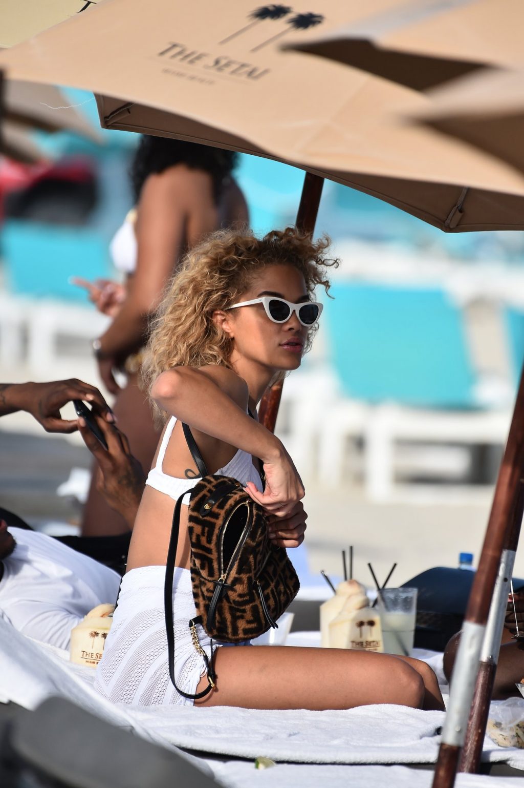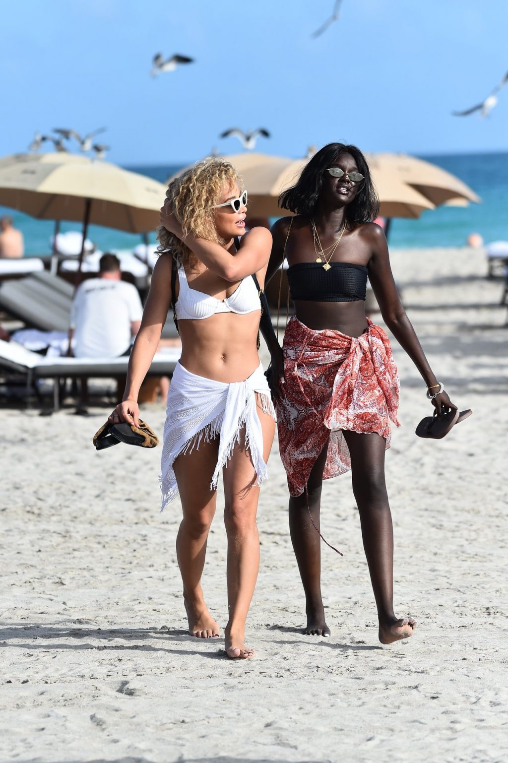 La modella di Sports Illustrated Jasmine Sanders indossa un bikini bianco con un copricostume abbinato sulla spiaggia con amici a Miami Beach, 11/12/2019.