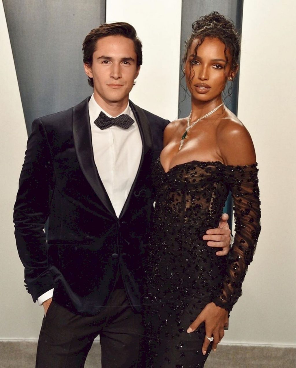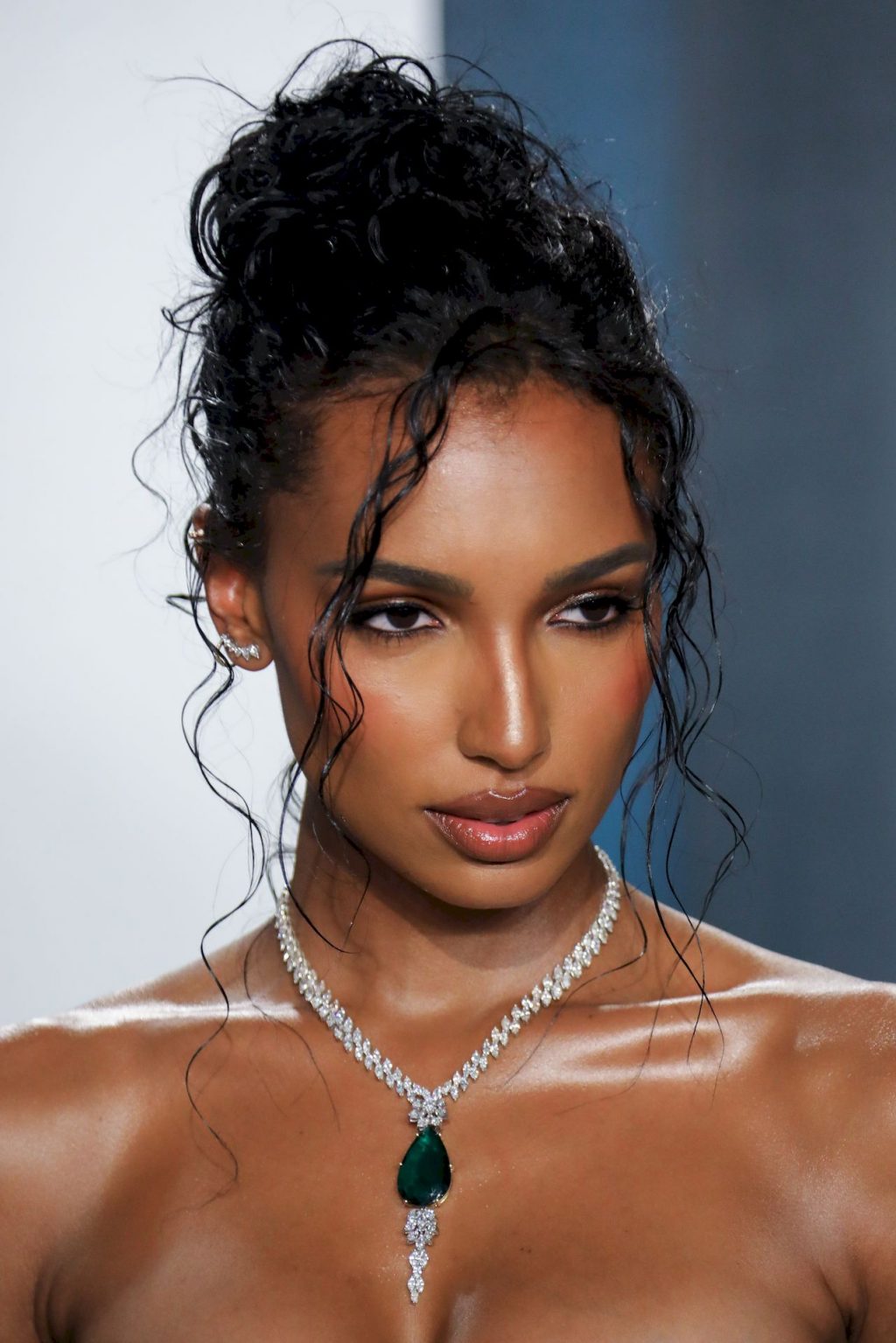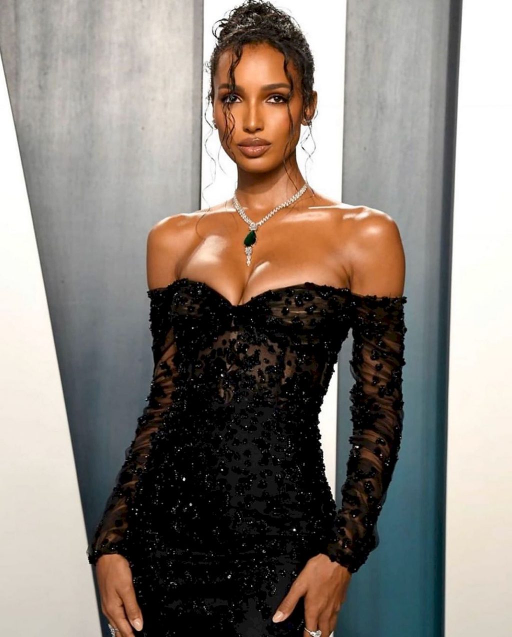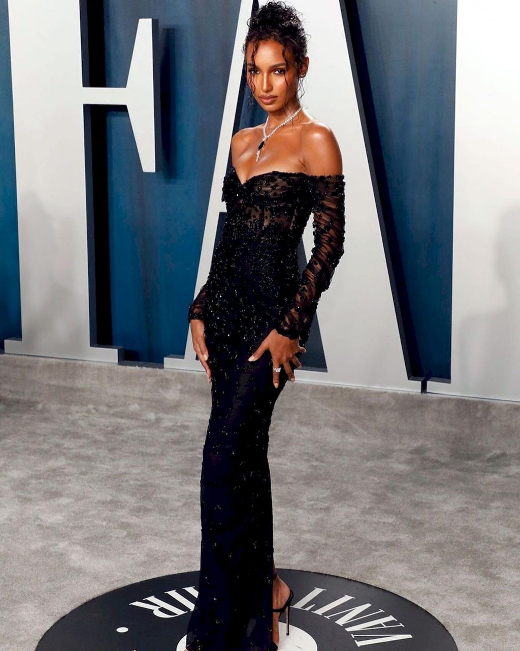 Modella Jasmine Tookes mostra il suo décolleté e si diverte, posando con un sexy abito nero trasparente alla Vanity Fair Oscar Party a Beverly Hills, 09/02/2020.