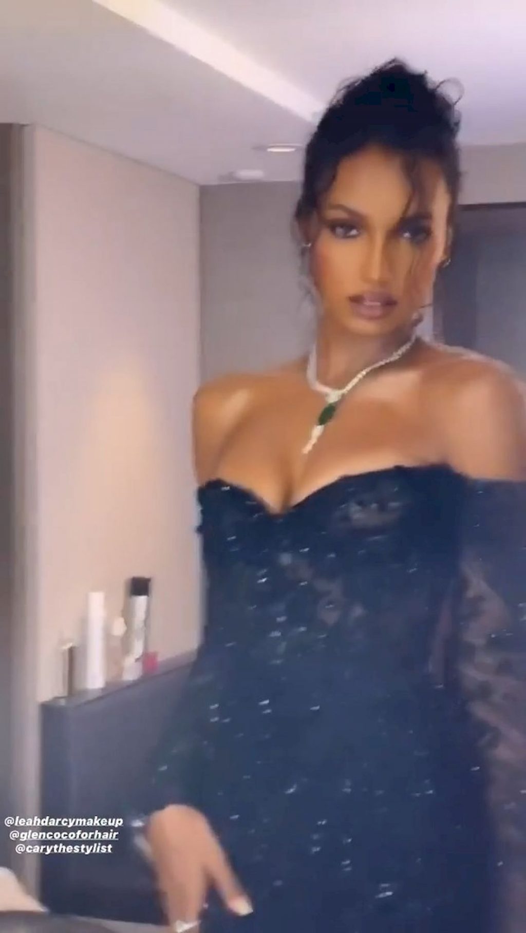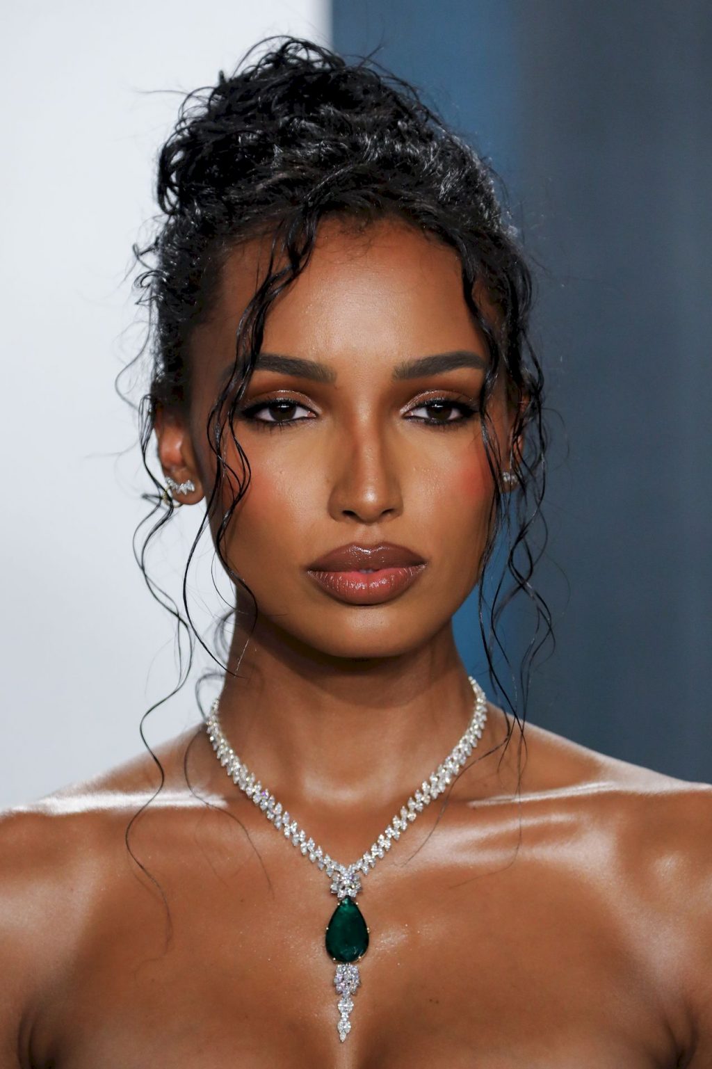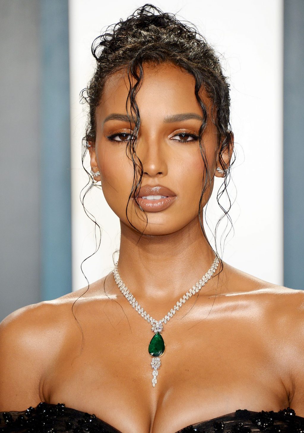 Modella Jasmine Tookes mostra il suo décolleté e si diverte, posando con un sexy abito nero trasparente alla Vanity Fair Oscar Party a Beverly Hills, 09/02/2020.