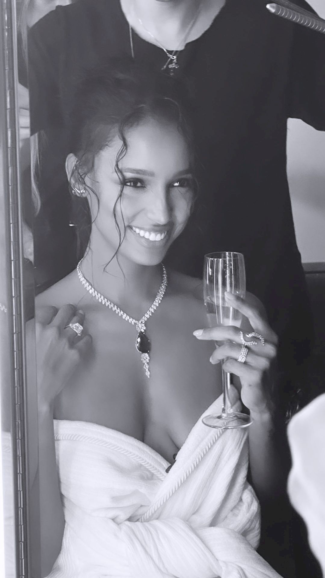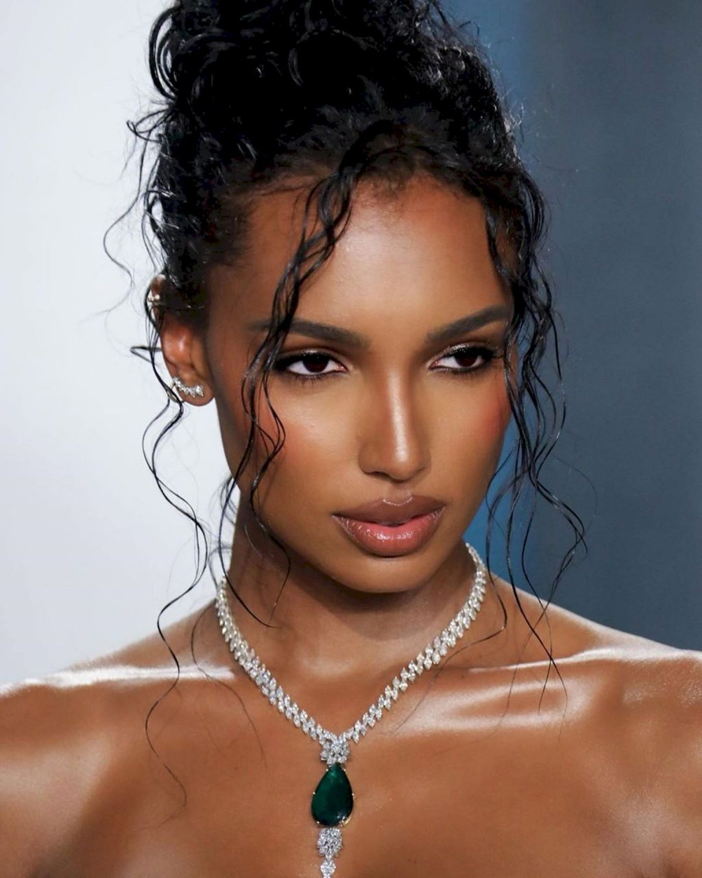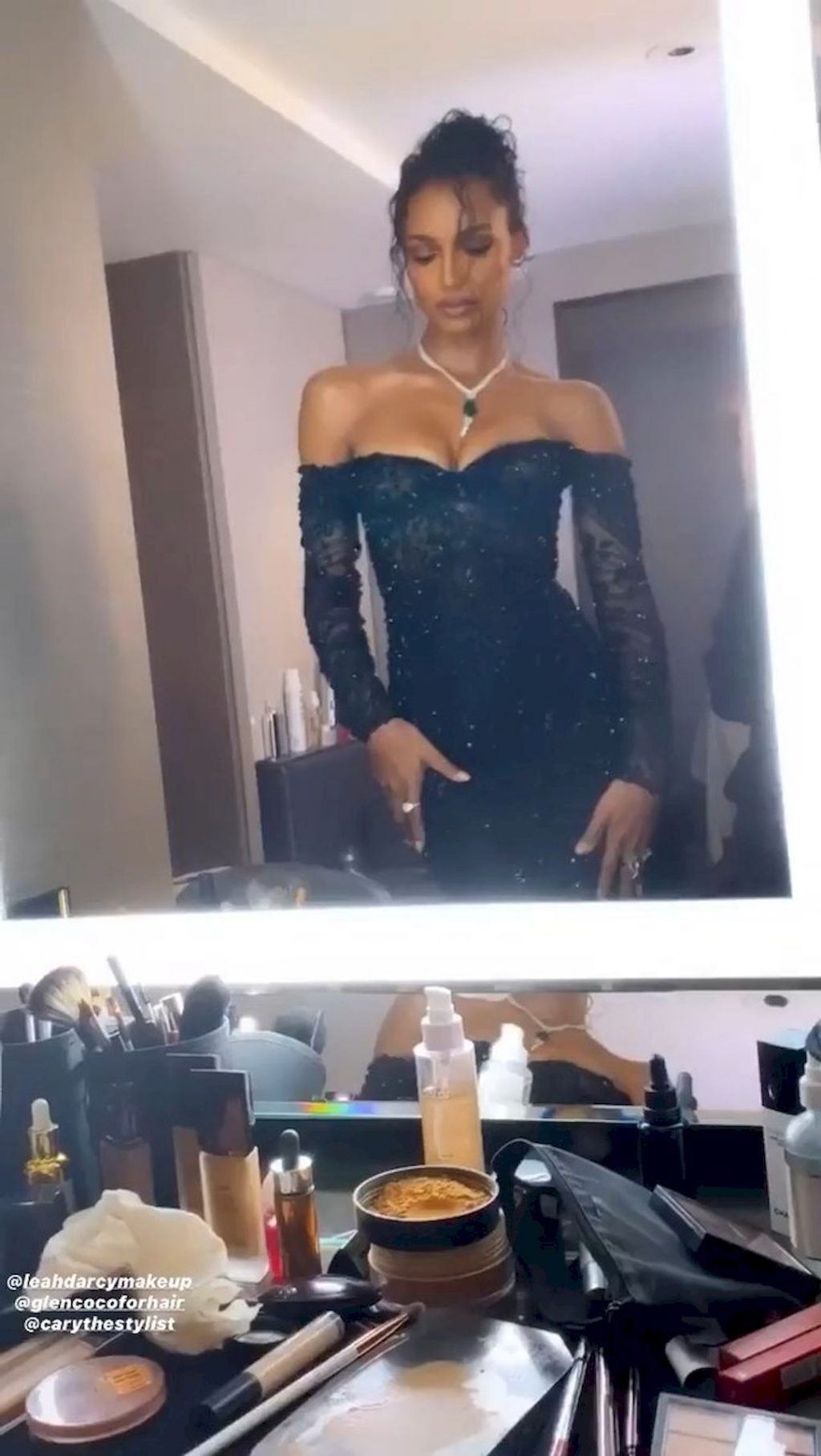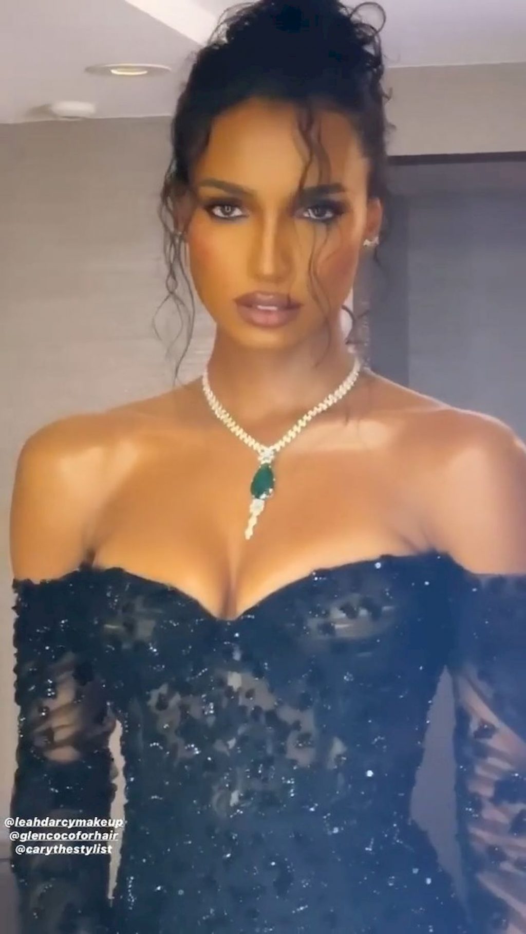 Modella Jasmine Tookes mostra il suo décolleté e si diverte, posando con un sexy abito nero trasparente alla Vanity Fair Oscar Party a Beverly Hills, 09/02/2020.