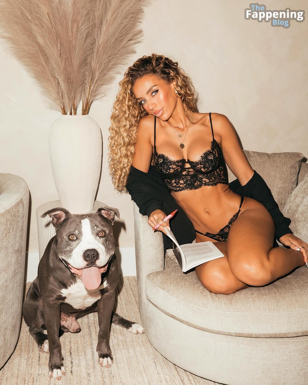 Jena Frumes sfoggia una scollatura mozzafiato, mostrando i suoi enormi seni, gambe toniche e una figura in forma con della lingerie nera in pizzo davvero sexy.