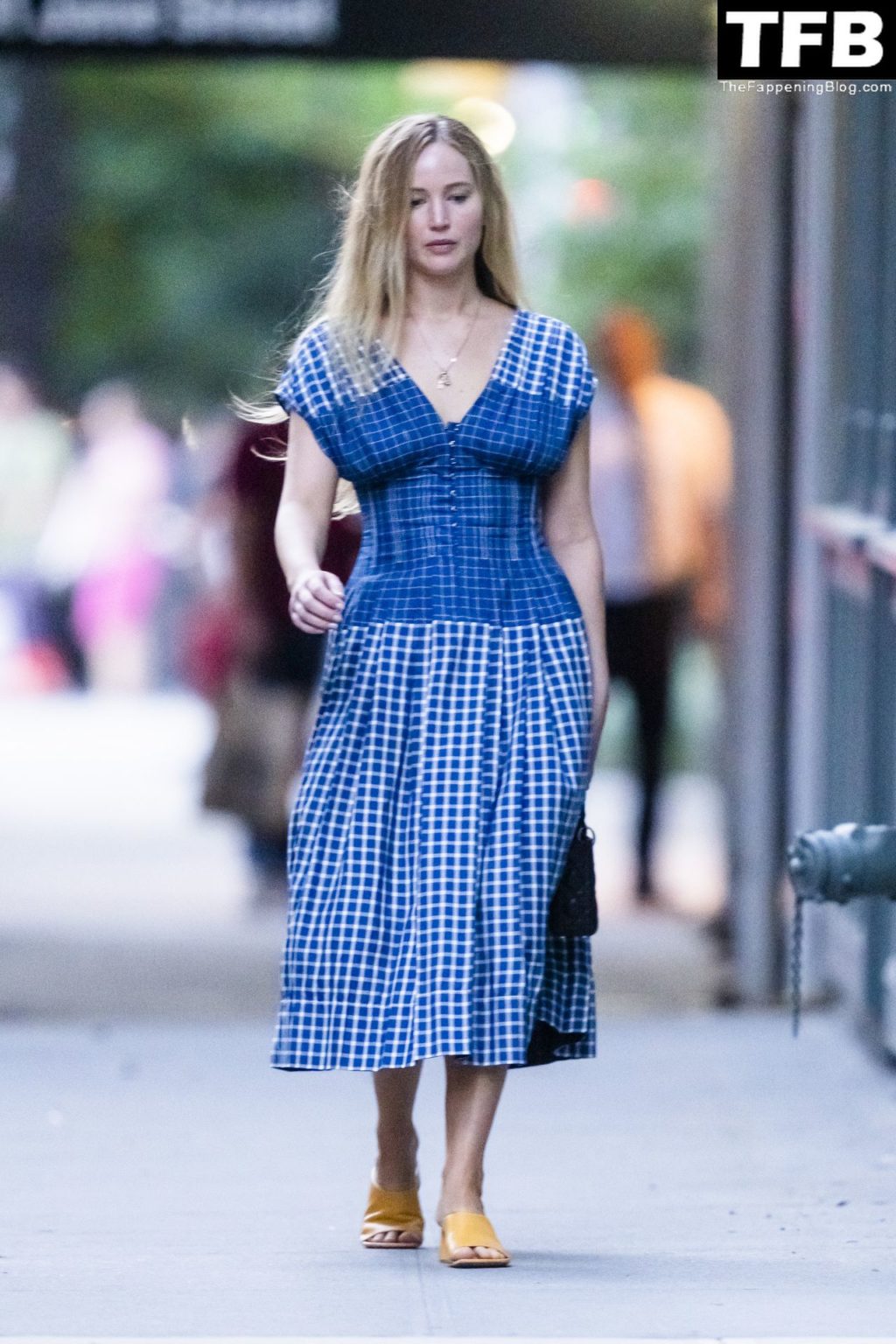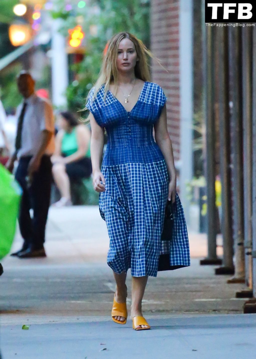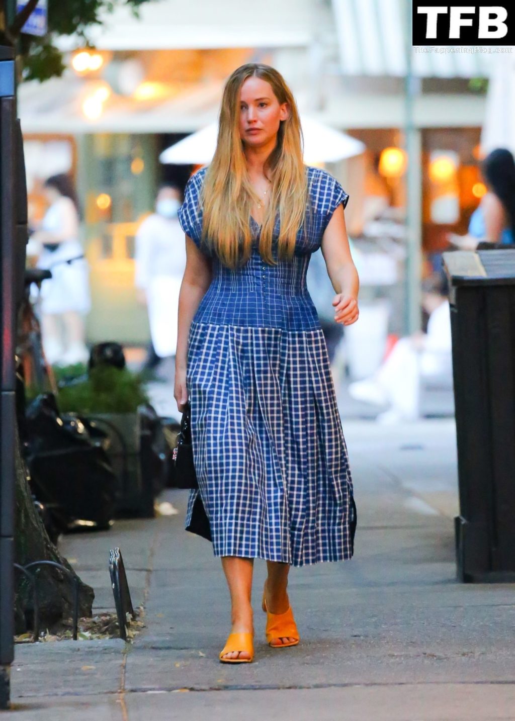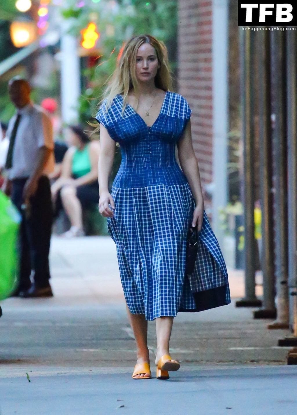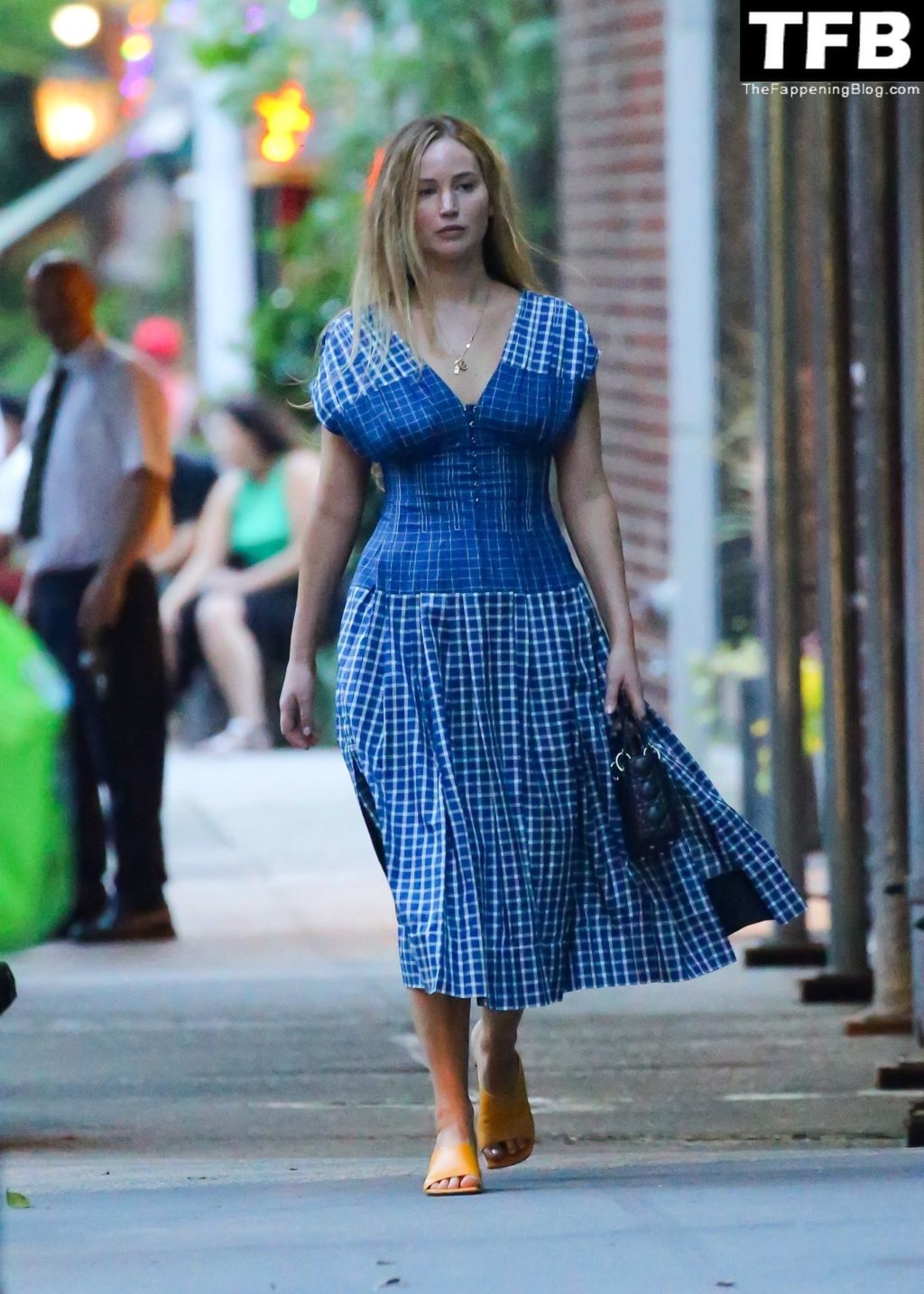 L’attrice e star di The Fappening Jennifer Lawrence appare splendida in un abito blu mentre viene vista lasciare il ristorante Cafe Cluny a New York, 15/07/2022.
