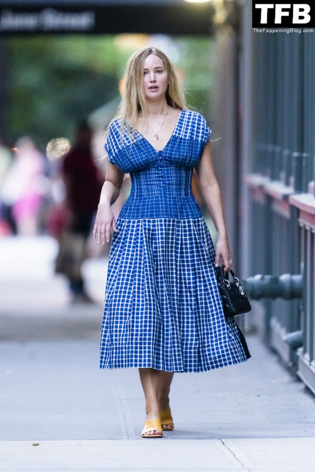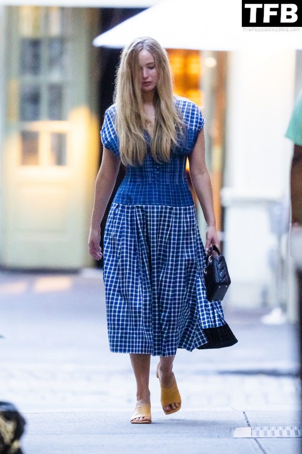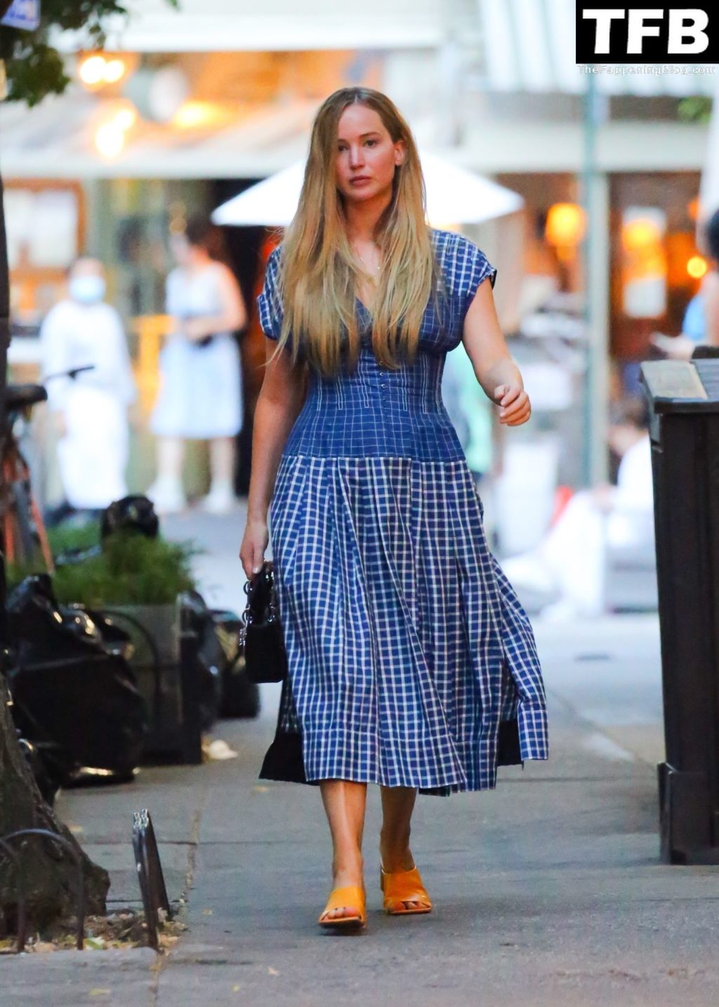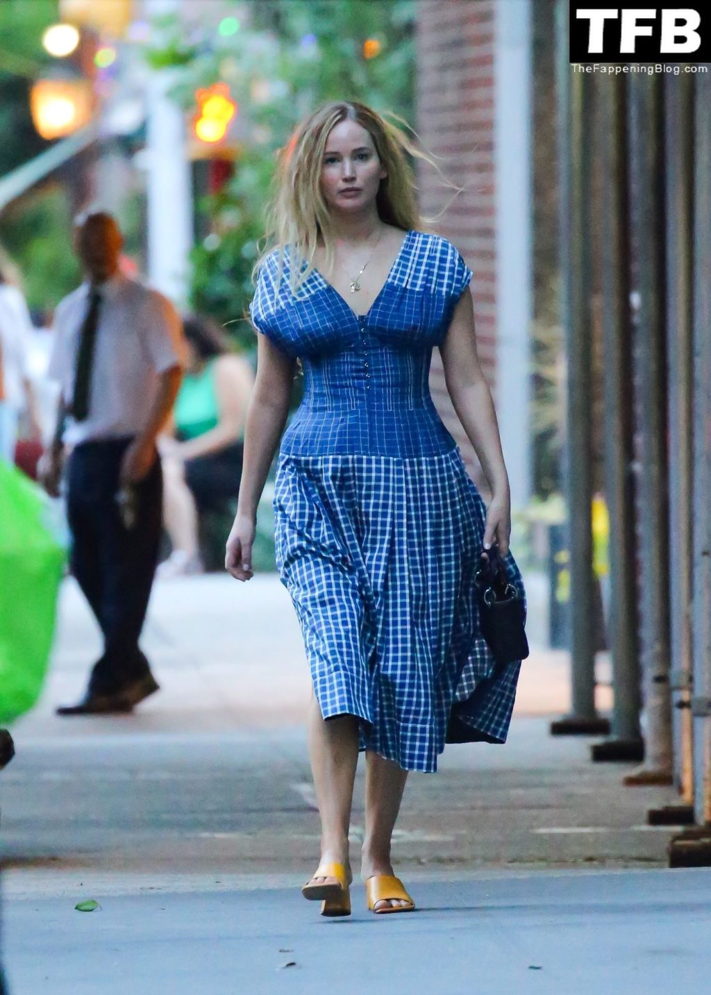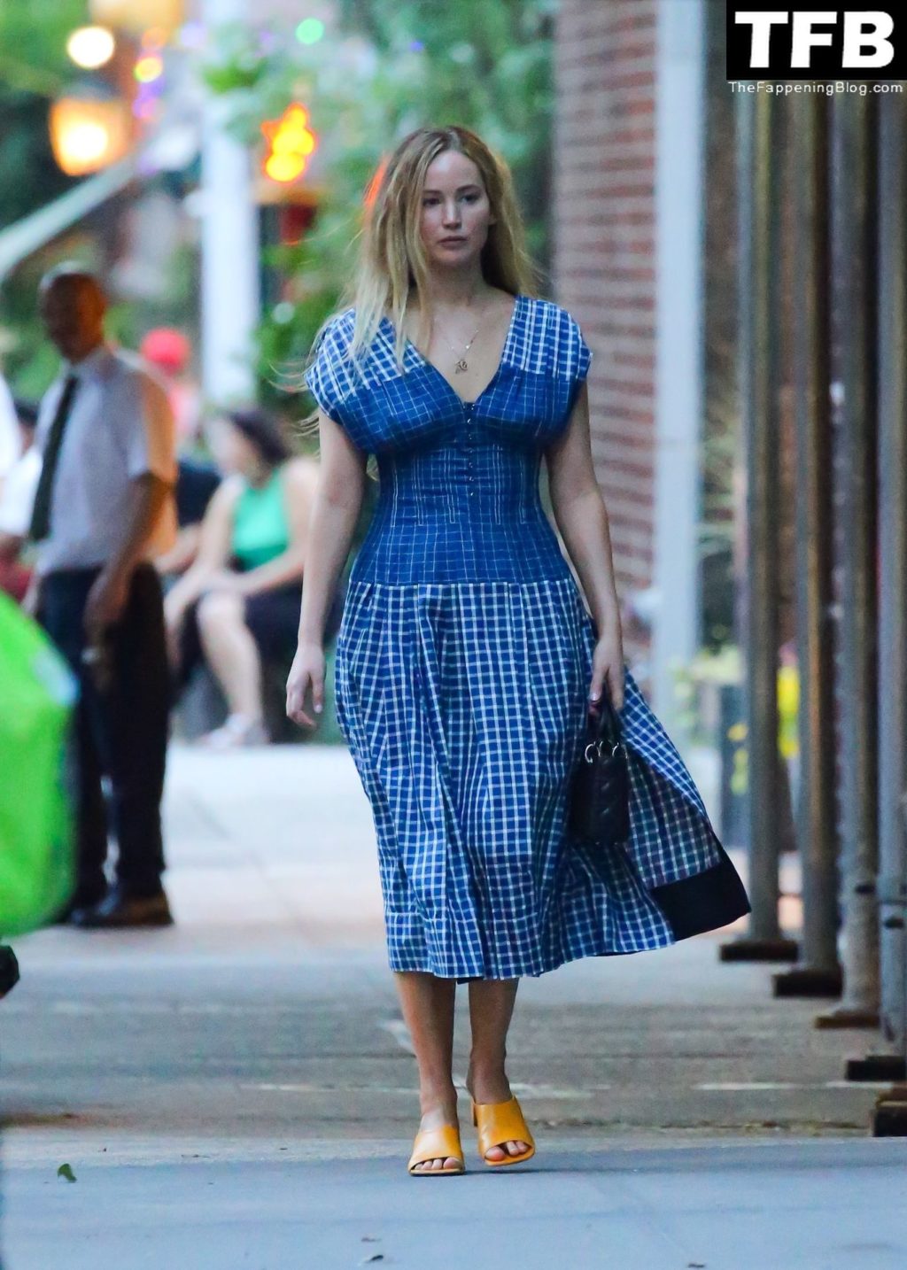L’attrice e star di The Fappening Jennifer Lawrence appare splendida in un abito blu mentre viene vista lasciare il ristorante Cafe Cluny a New York, 15/07/2022.