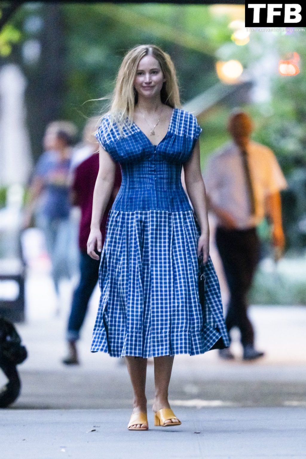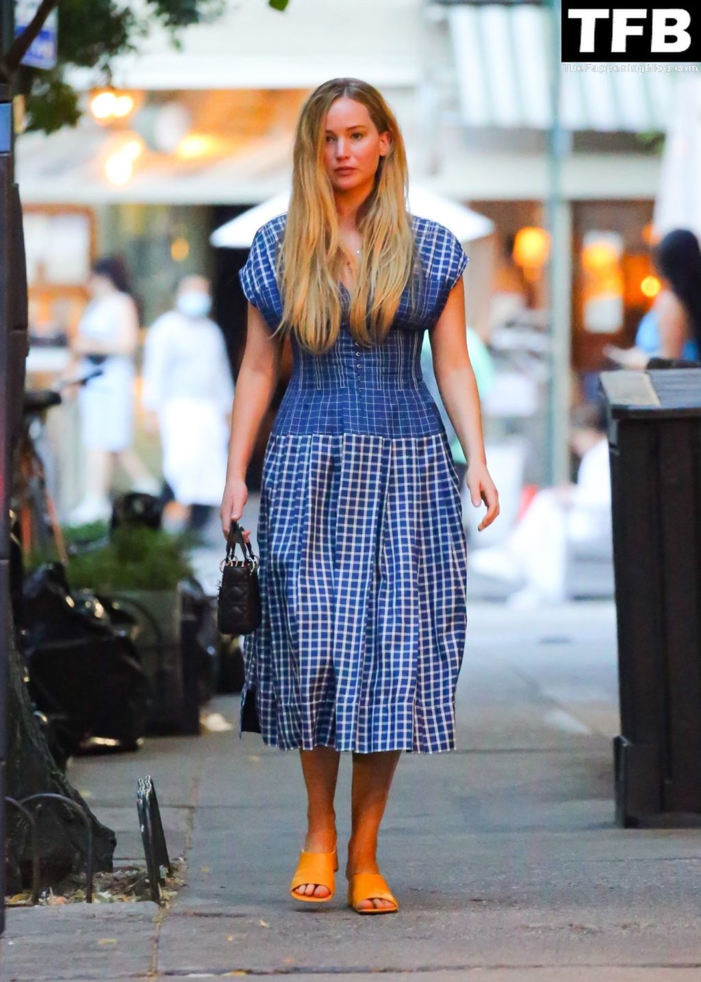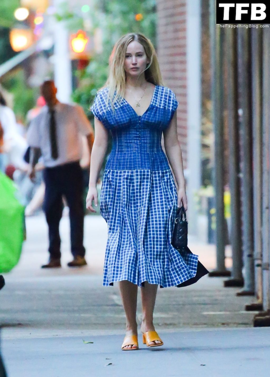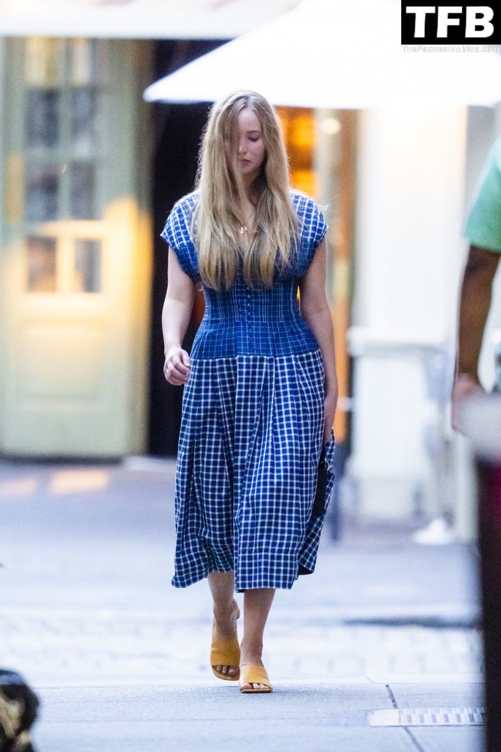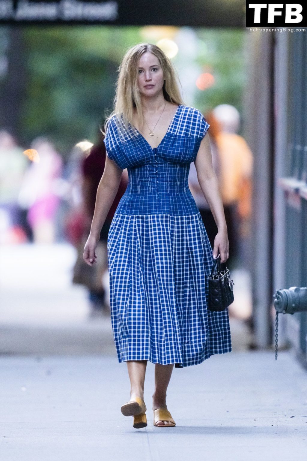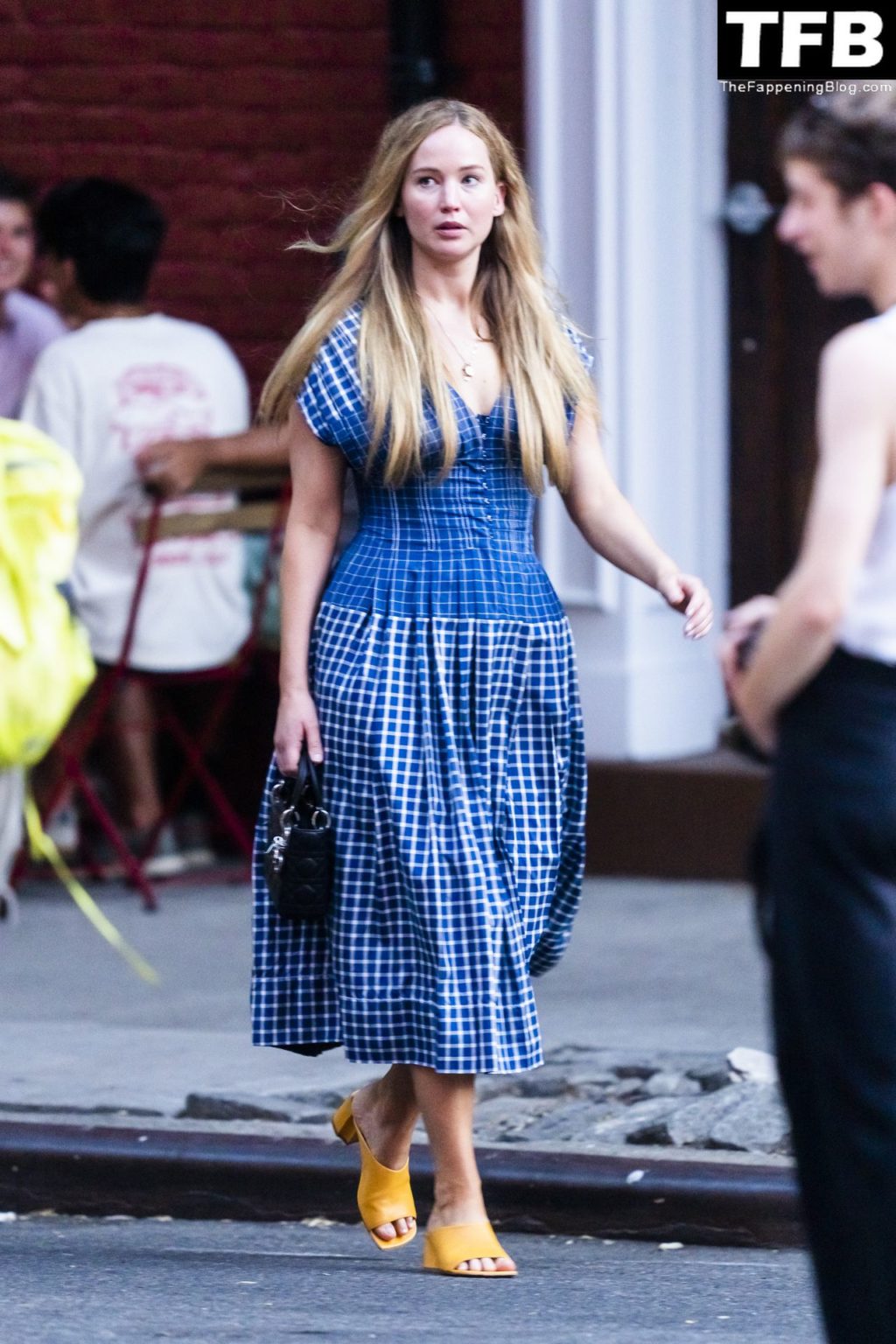 L’attrice e star di The Fappening Jennifer Lawrence appare splendida in un abito blu mentre viene vista lasciare il ristorante Cafe Cluny a New York, 15/07/2022.