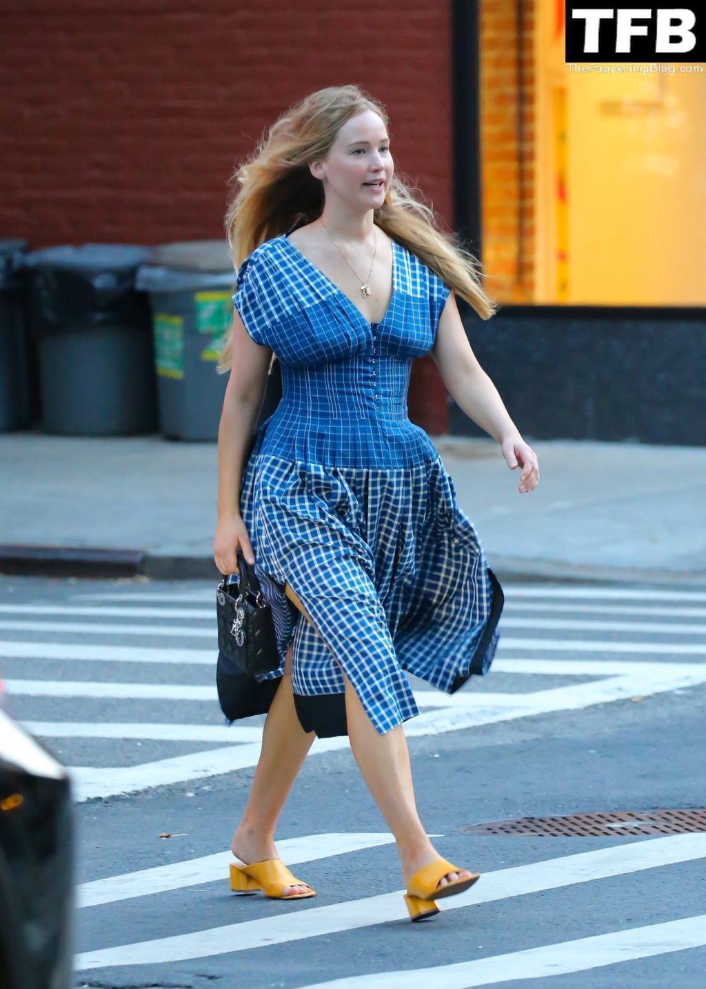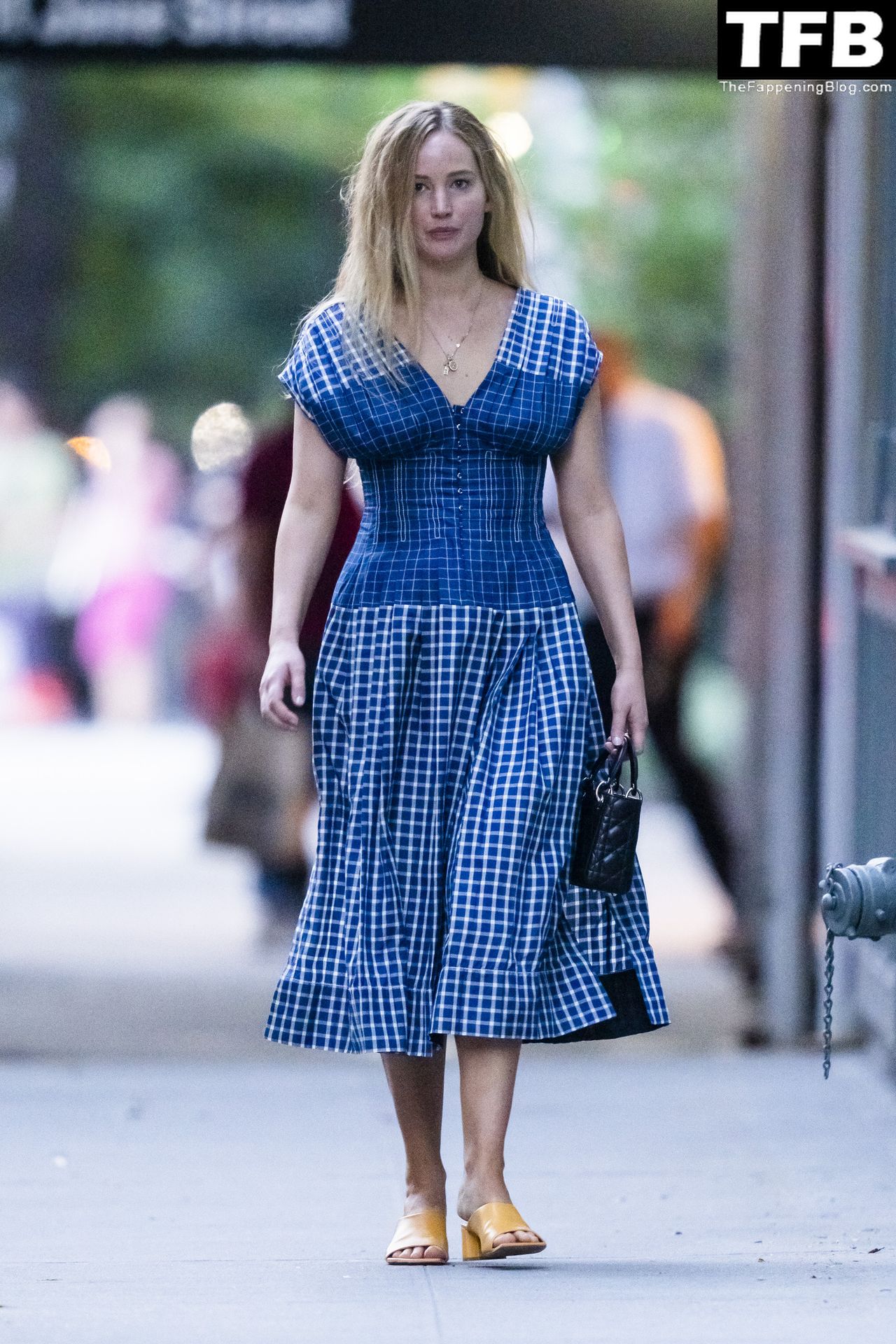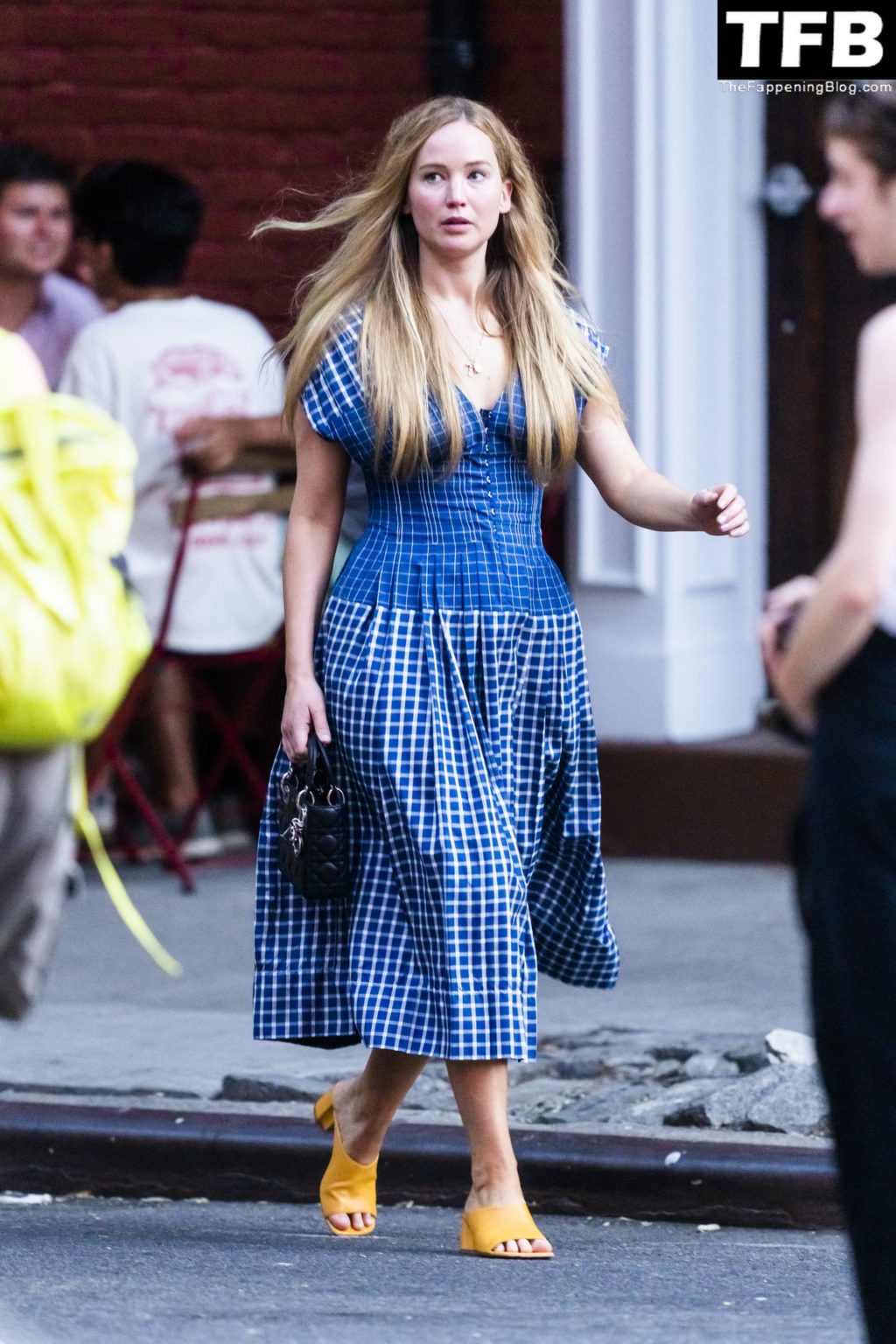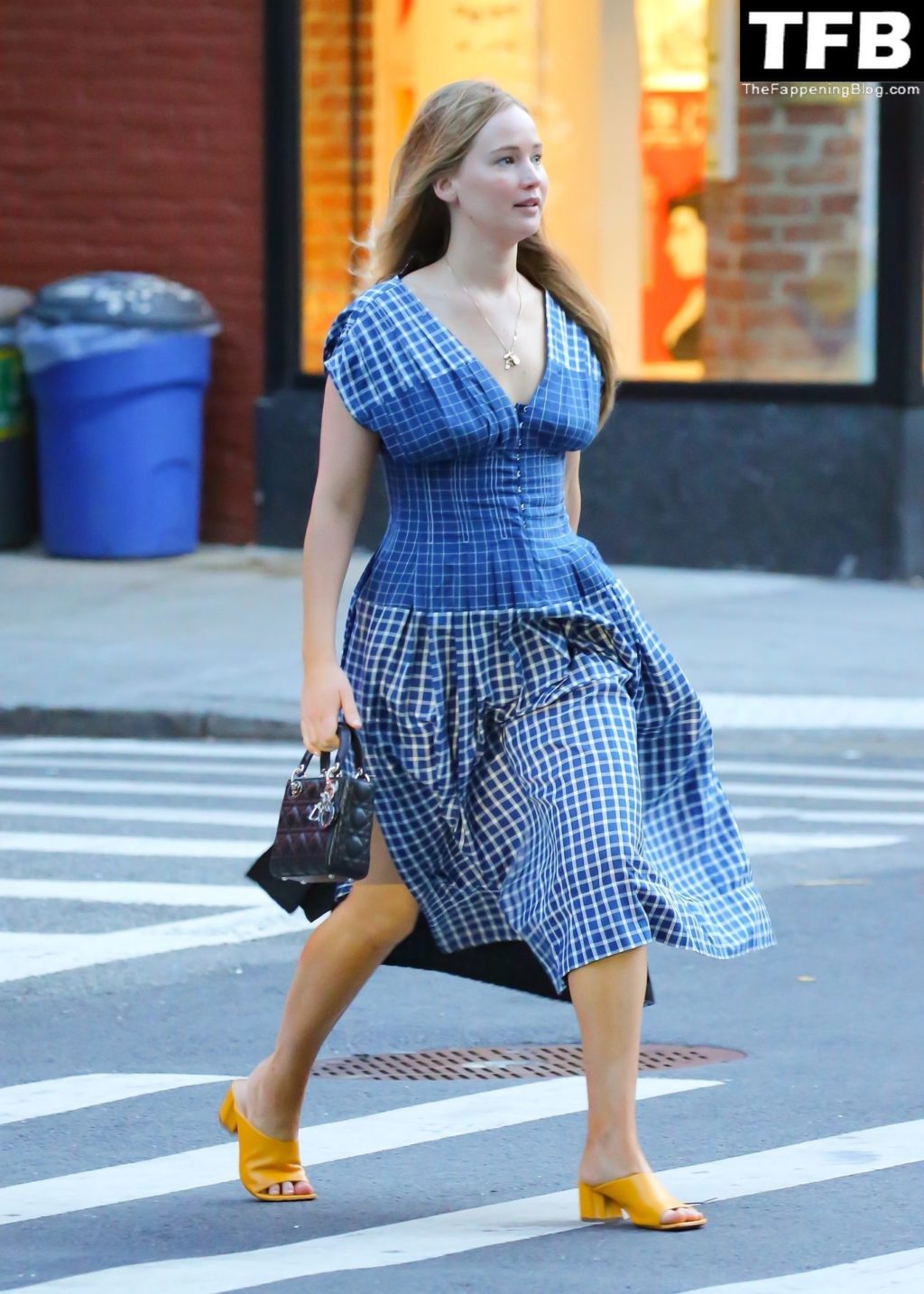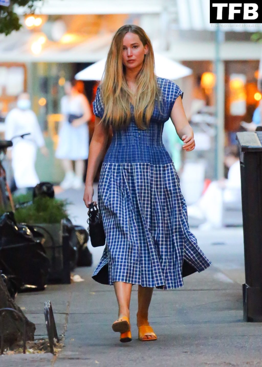 L’attrice e star di The Fappening Jennifer Lawrence appare splendida in un abito blu mentre viene vista lasciare il ristorante Cafe Cluny a New York, 15/07/2022.