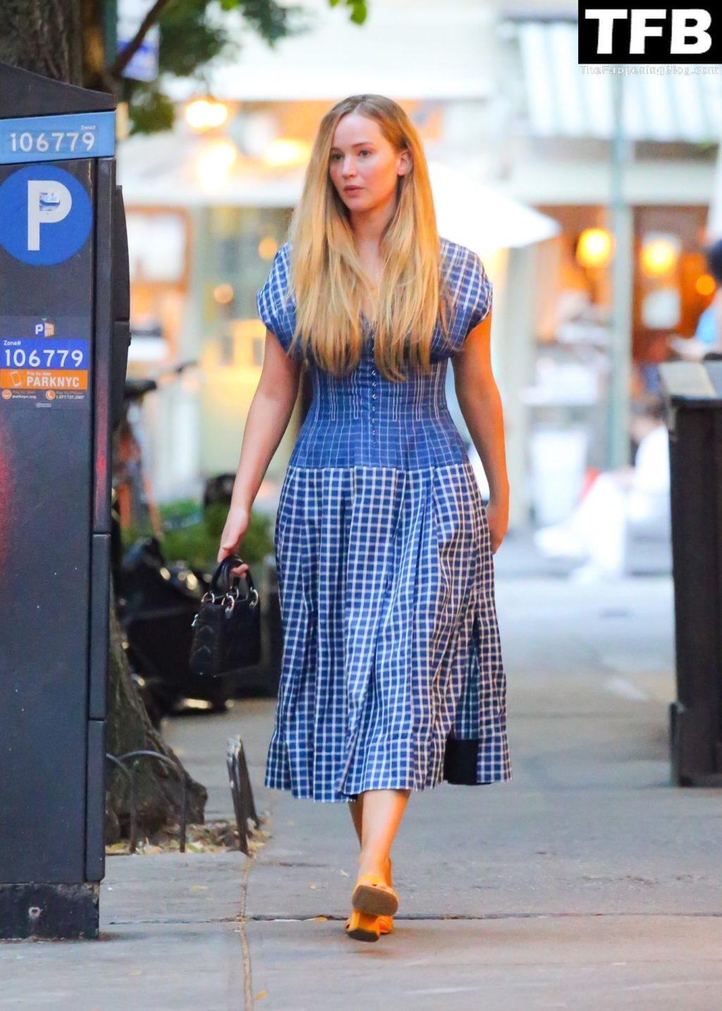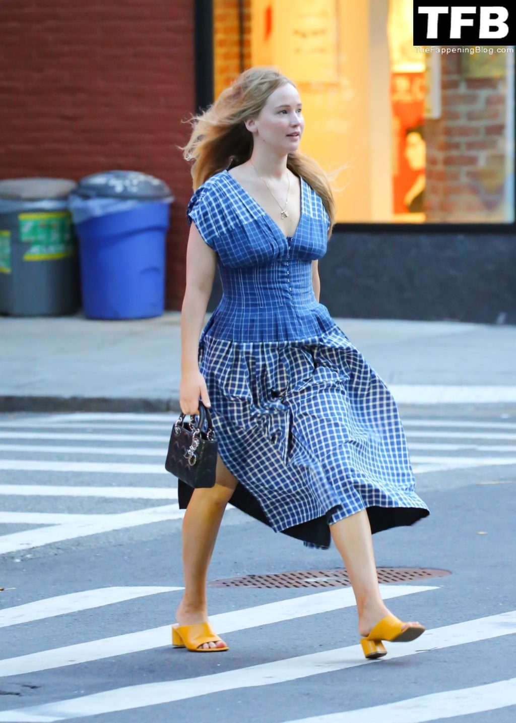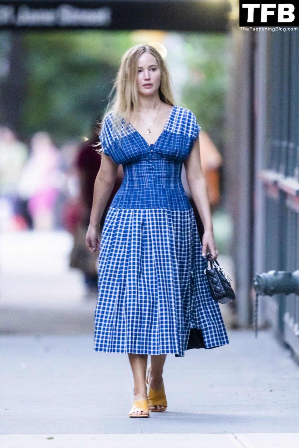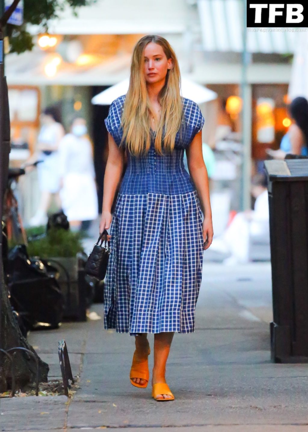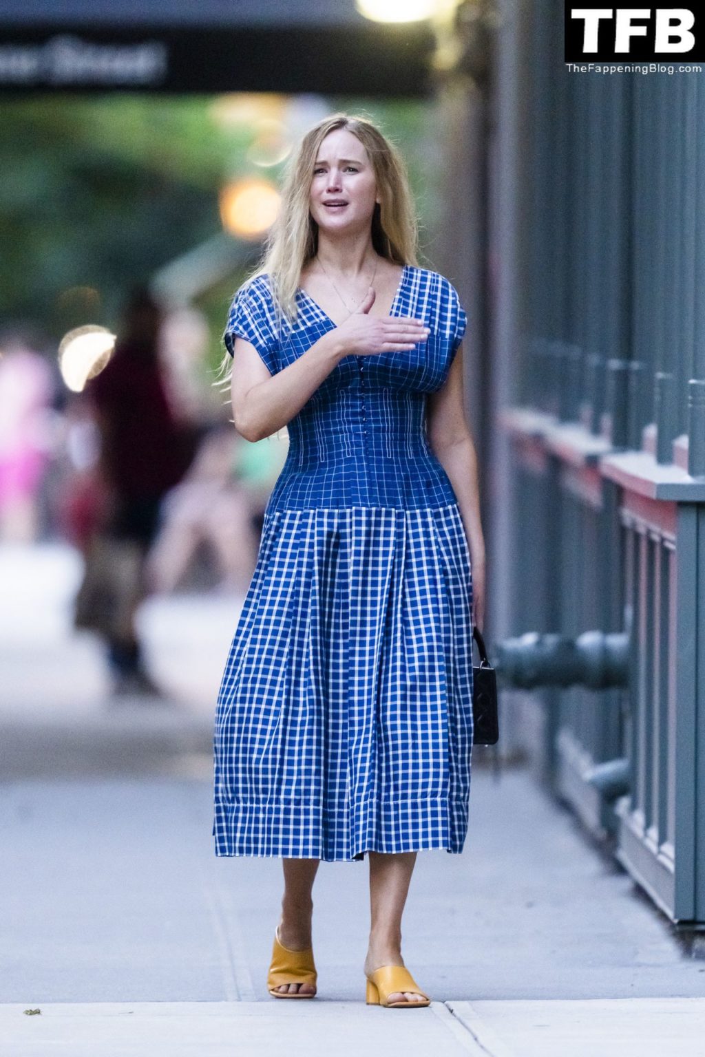 L’attrice e star di The Fappening Jennifer Lawrence appare splendida in un abito blu mentre viene vista lasciare il ristorante Cafe Cluny a New York, 15/07/2022.