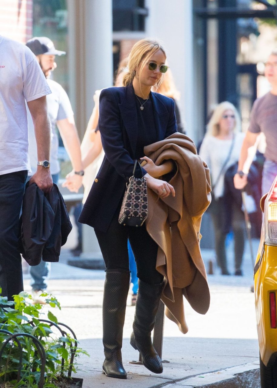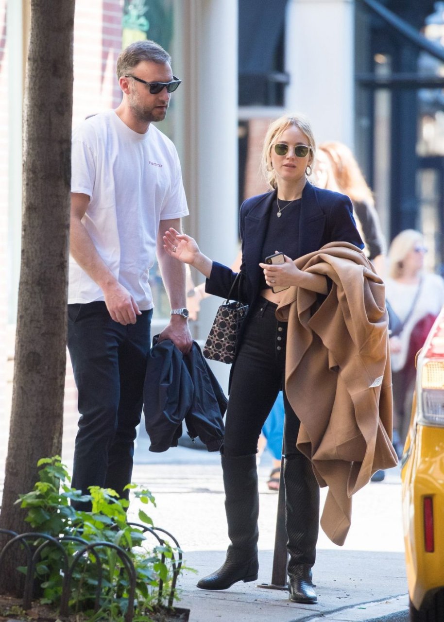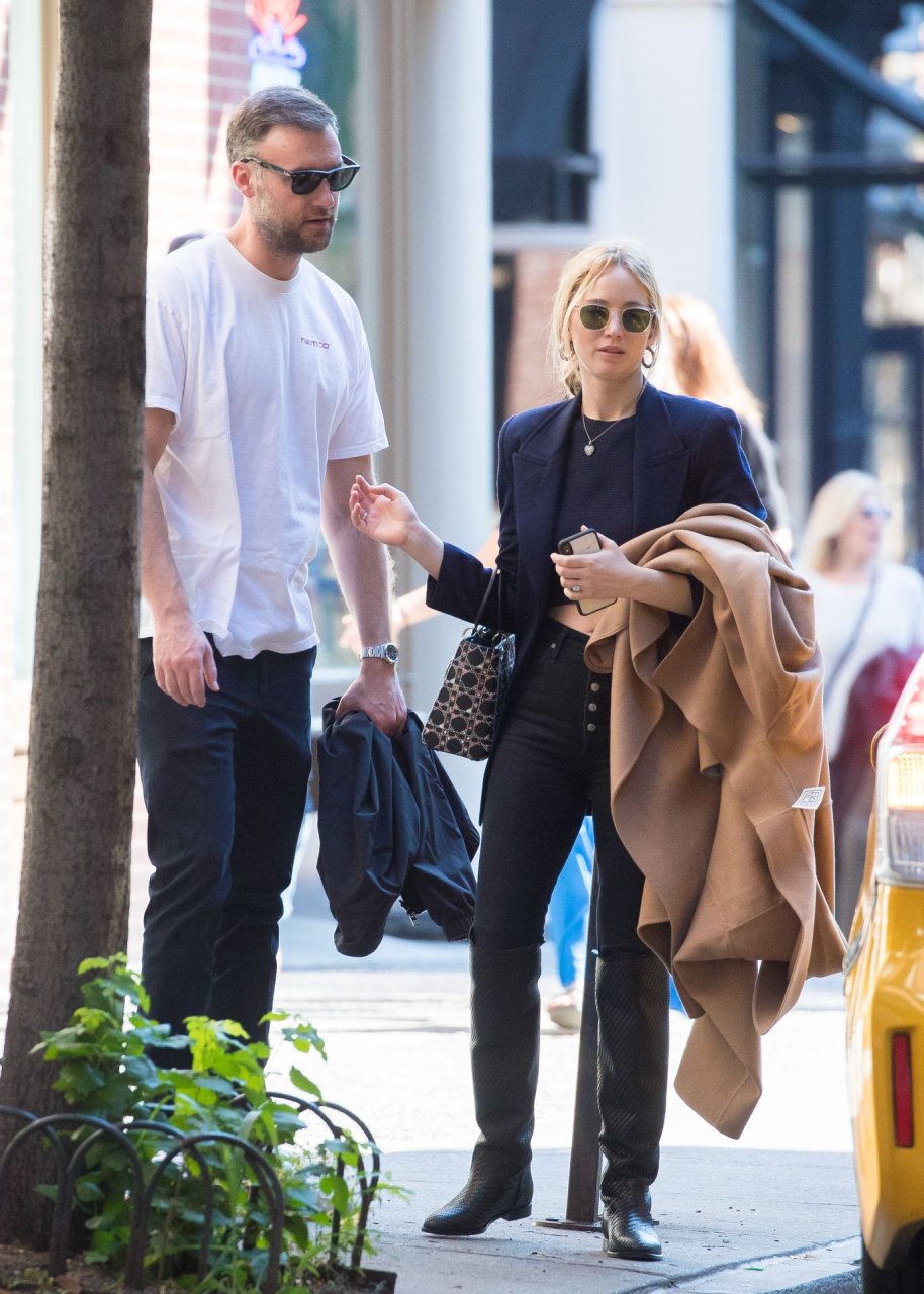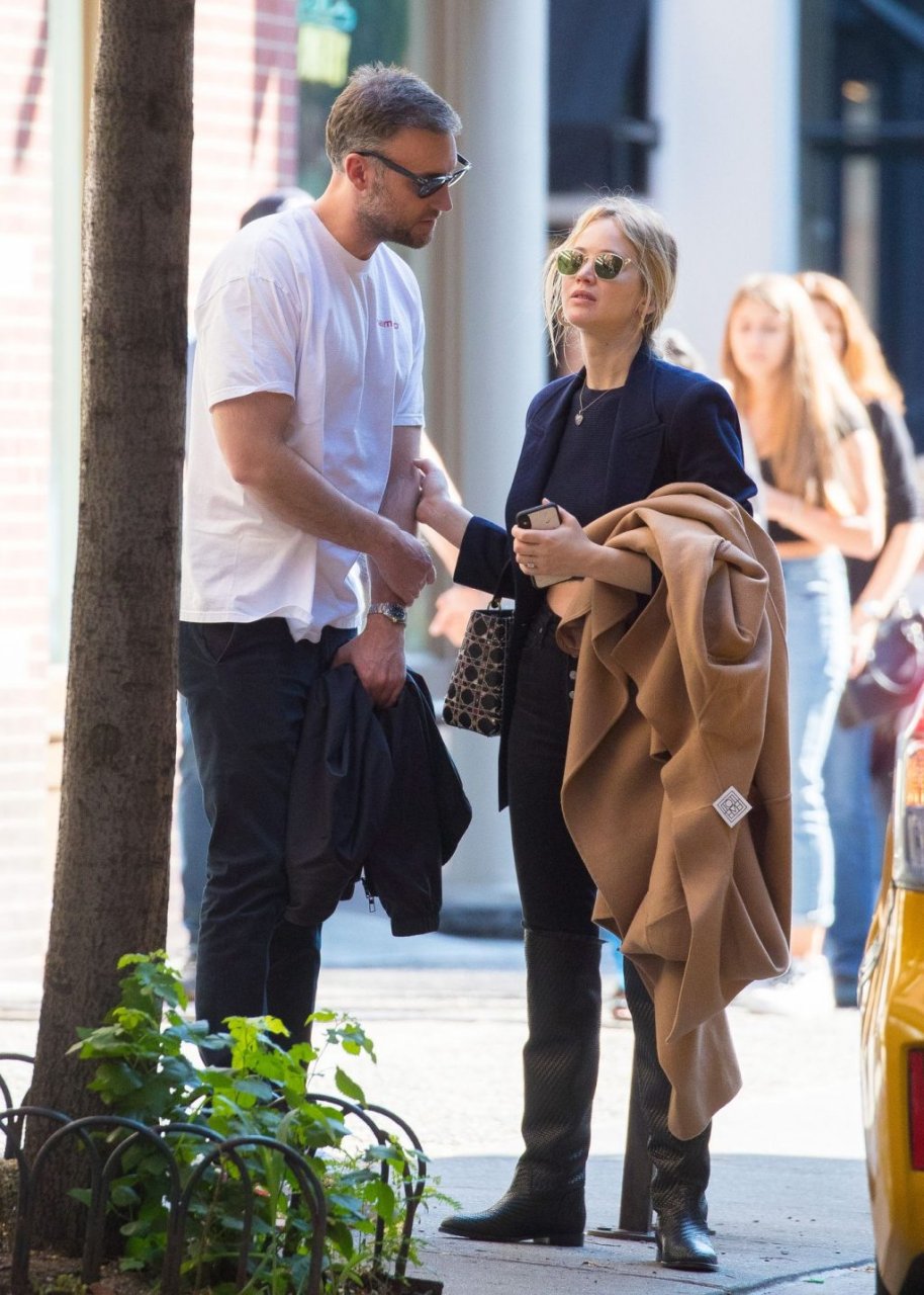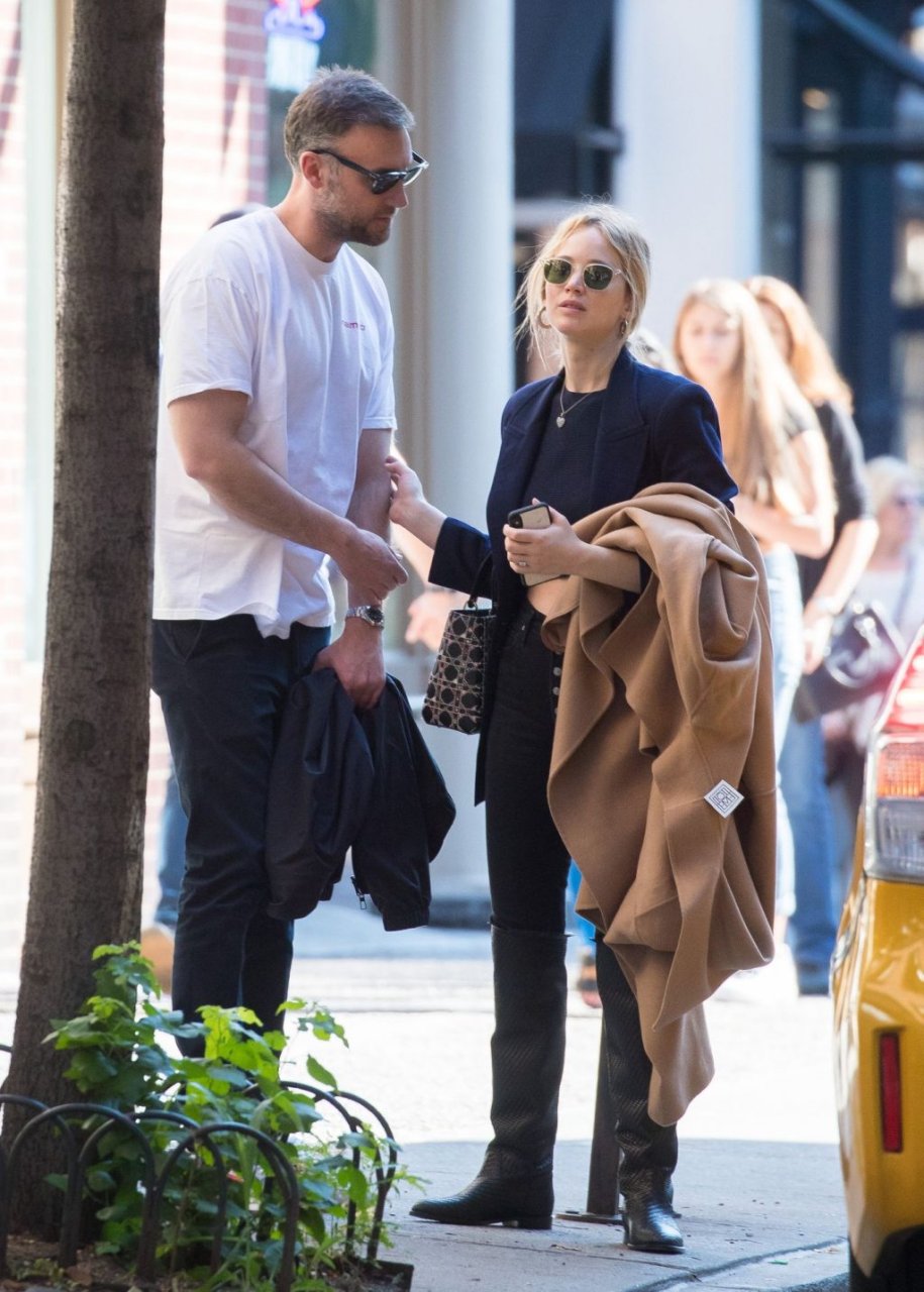 Jennifer Lawrence e Cooke Maroney si scambiano un lungo bacio prima di separarsi a New York City, 14/10/2019. L’attrice di 29 anni portava una borsa Dior e indossava un blazer nero, un crop top, pantaloni con bottoni e stivali al ginocchio.