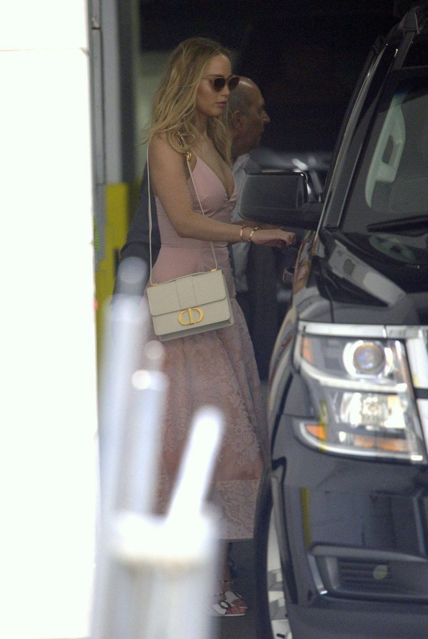 L’attrice Jennifer Lawrence mostra il suo décolleté in un vestito rosa con spalline sottili, una borsa a tracolla Dior e scarpe con tacco a spillo open toe a New York City, 01/06/2019.