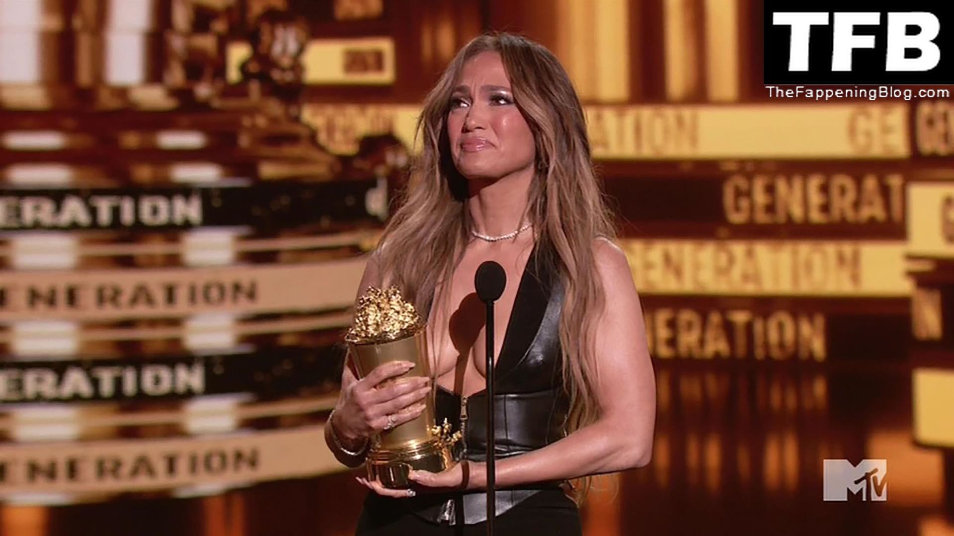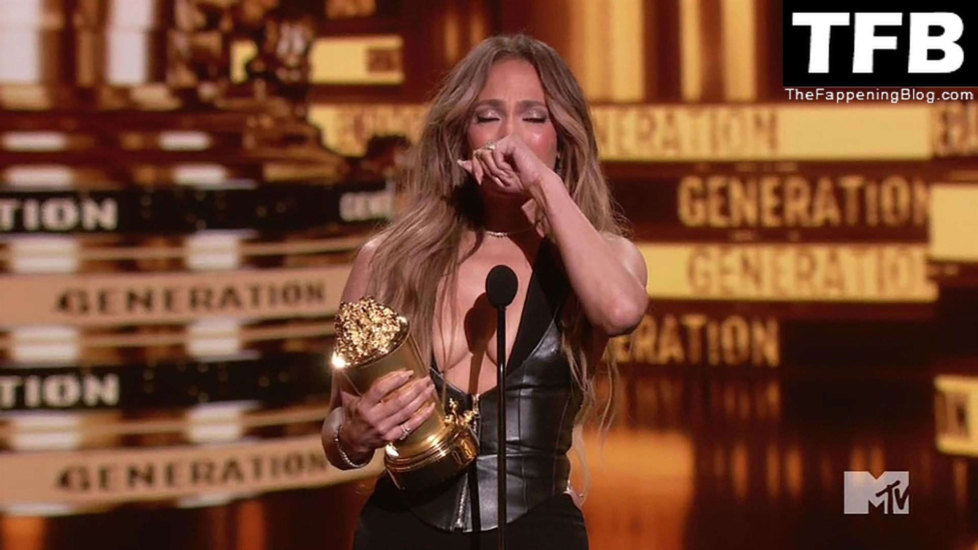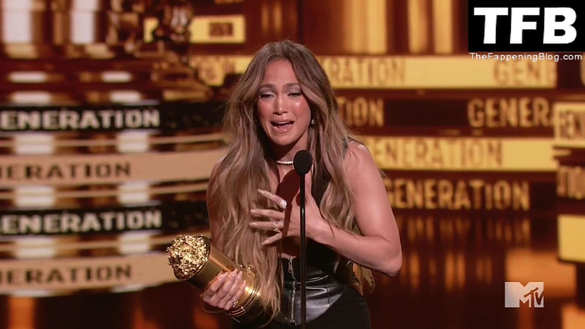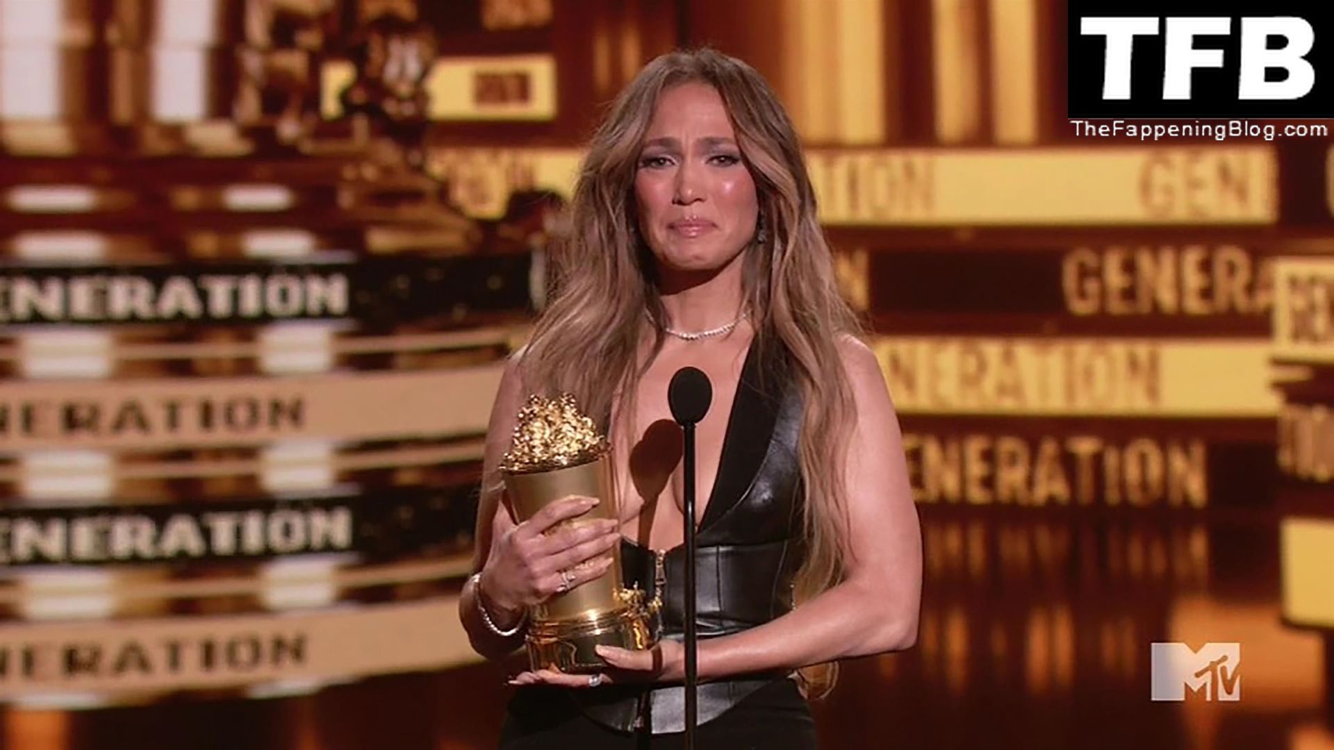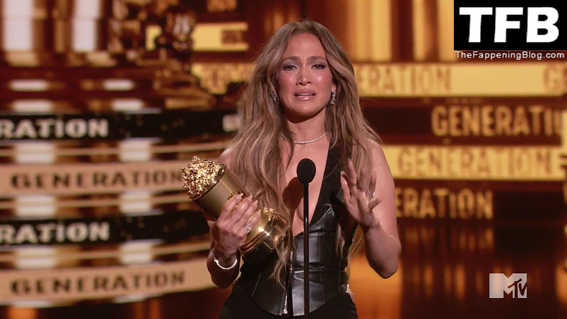 Jennifer Lopez è ritratta sul red carpet degli MTV Movie & TV Awards al Barker Hangar di Santa Monica, 06/05/2022. La cantante si emoziona mentre riceve il Generational Award.