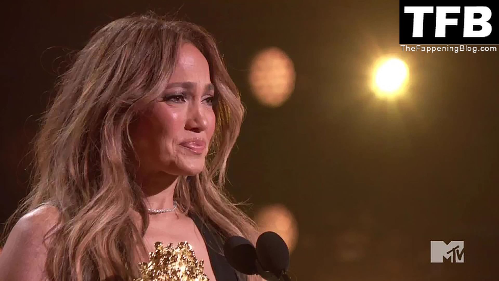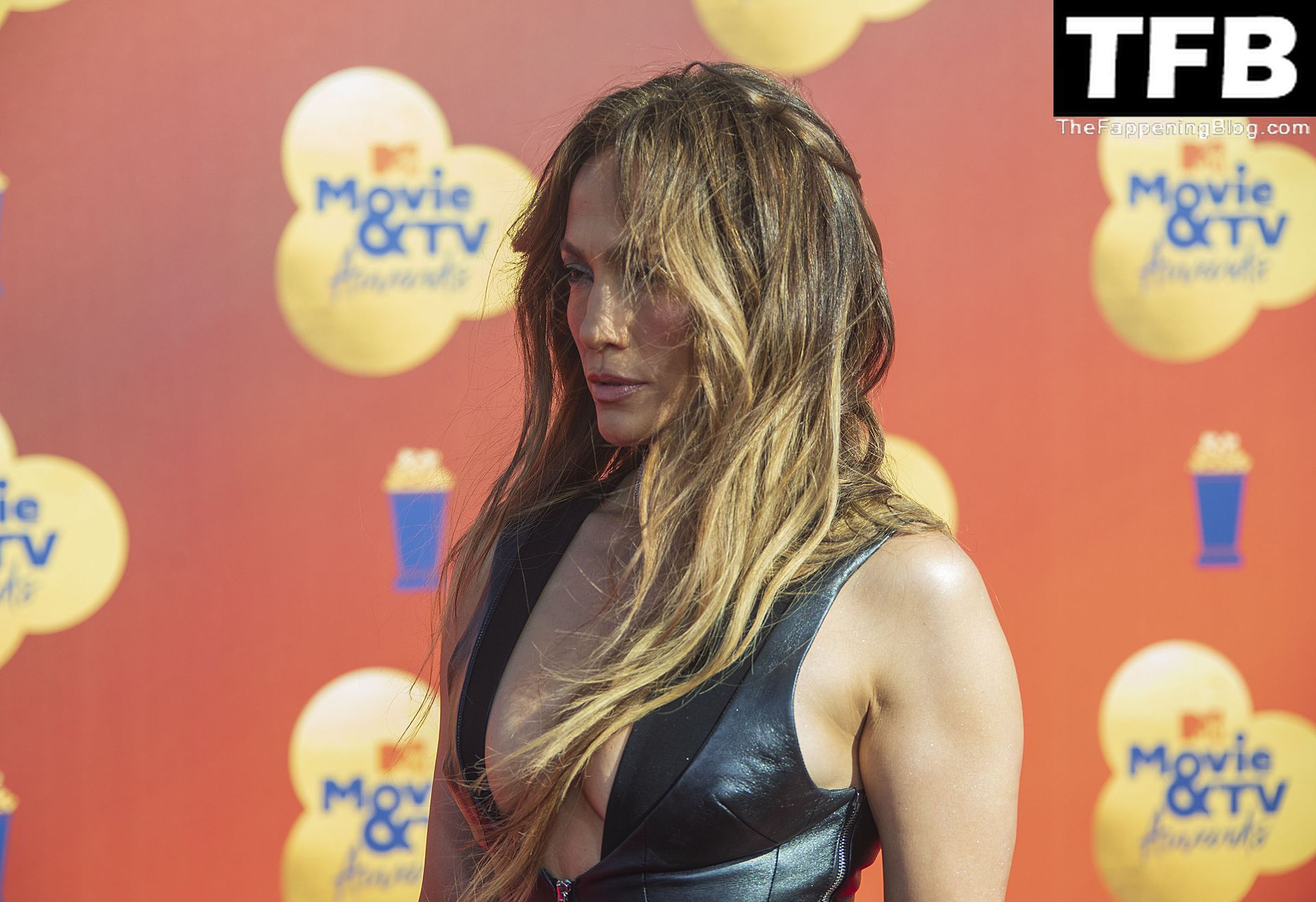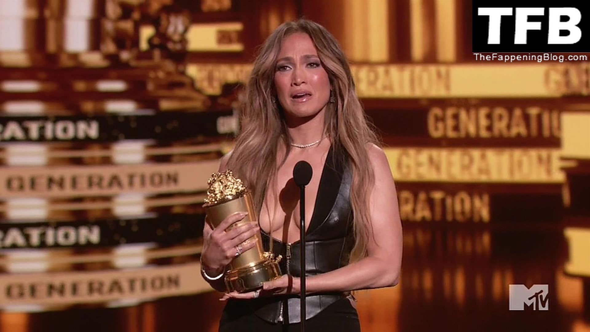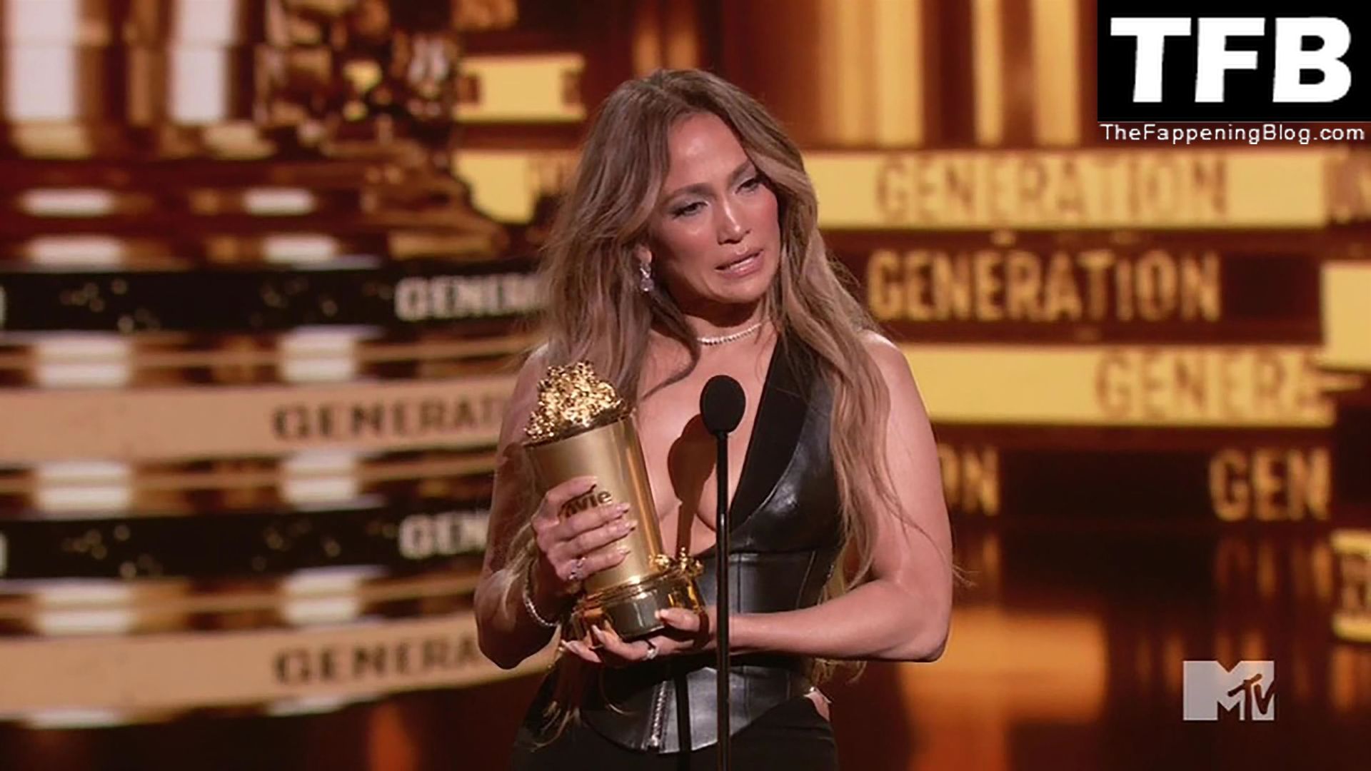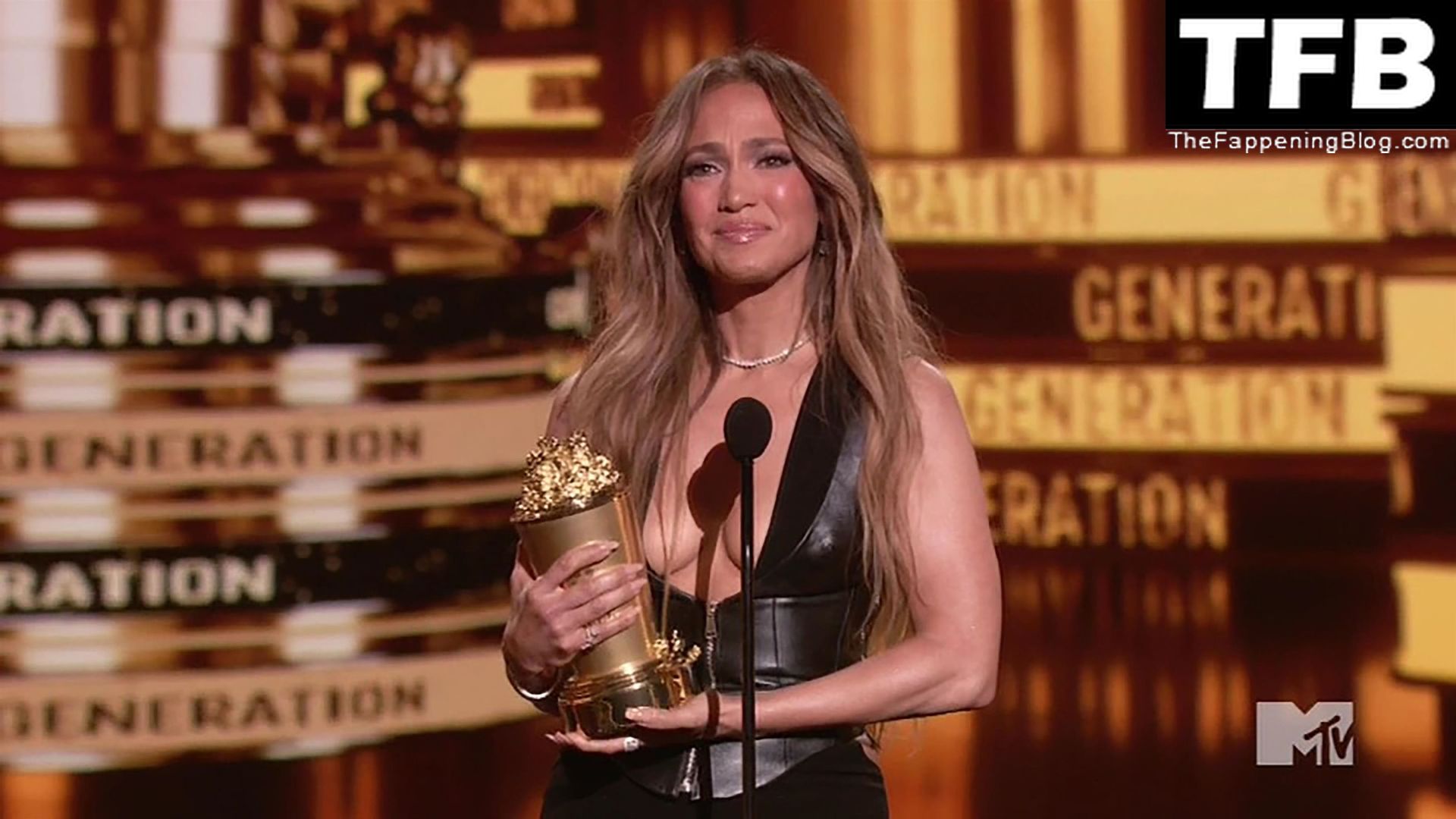 Jennifer Lopez è ritratta sul red carpet degli MTV Movie & TV Awards al Barker Hangar di Santa Monica, 06/05/2022. La cantante si emoziona mentre riceve il Generational Award.