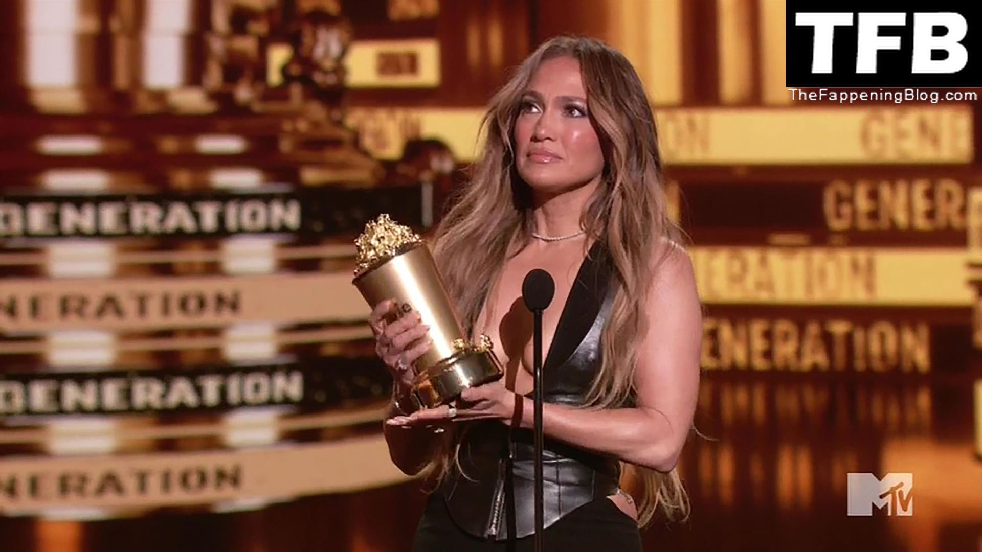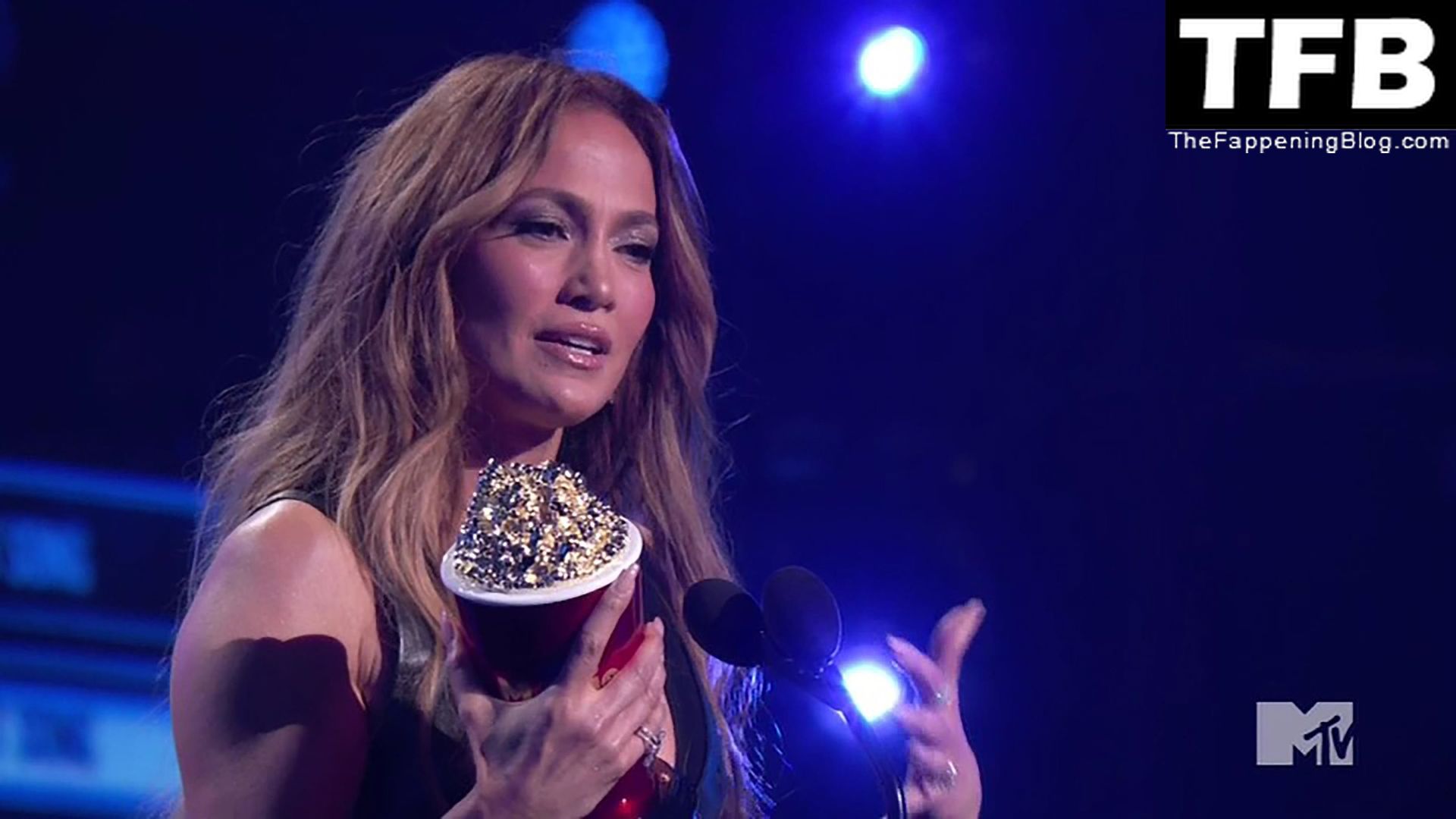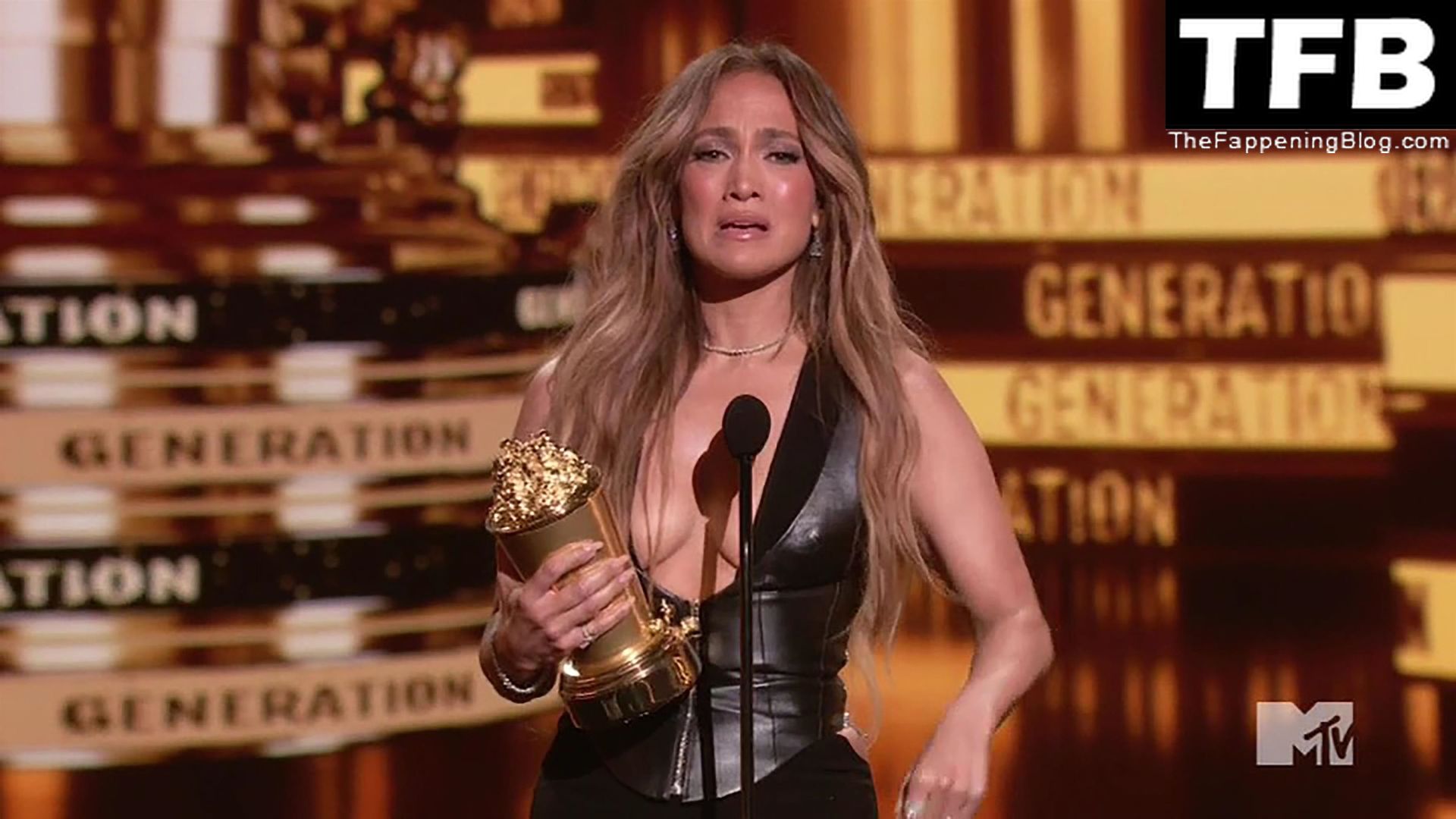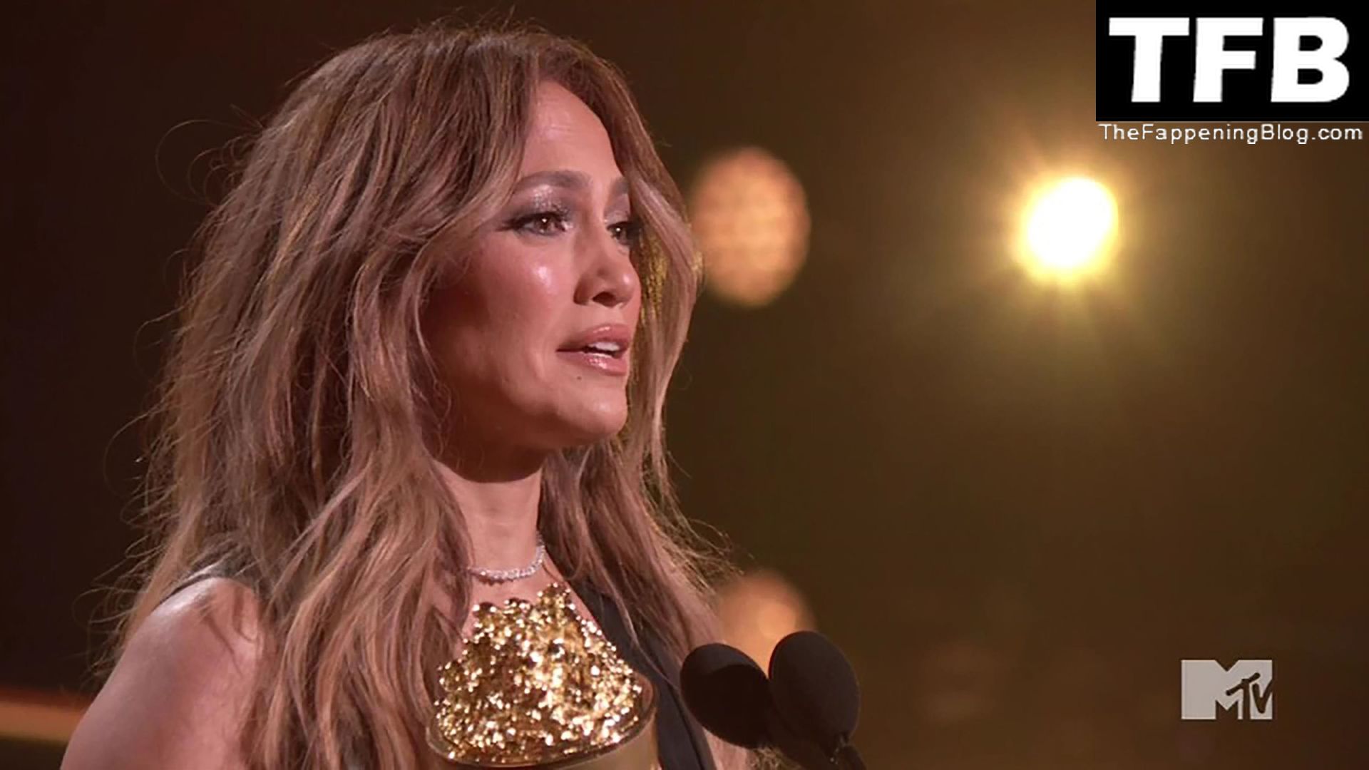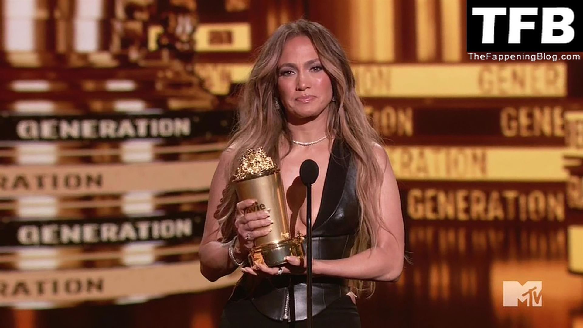 Jennifer Lopez è ritratta sul red carpet degli MTV Movie & TV Awards al Barker Hangar di Santa Monica, 06/05/2022. La cantante si emoziona mentre riceve il Generational Award.