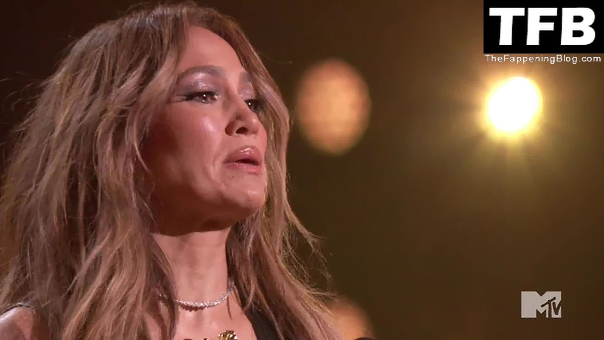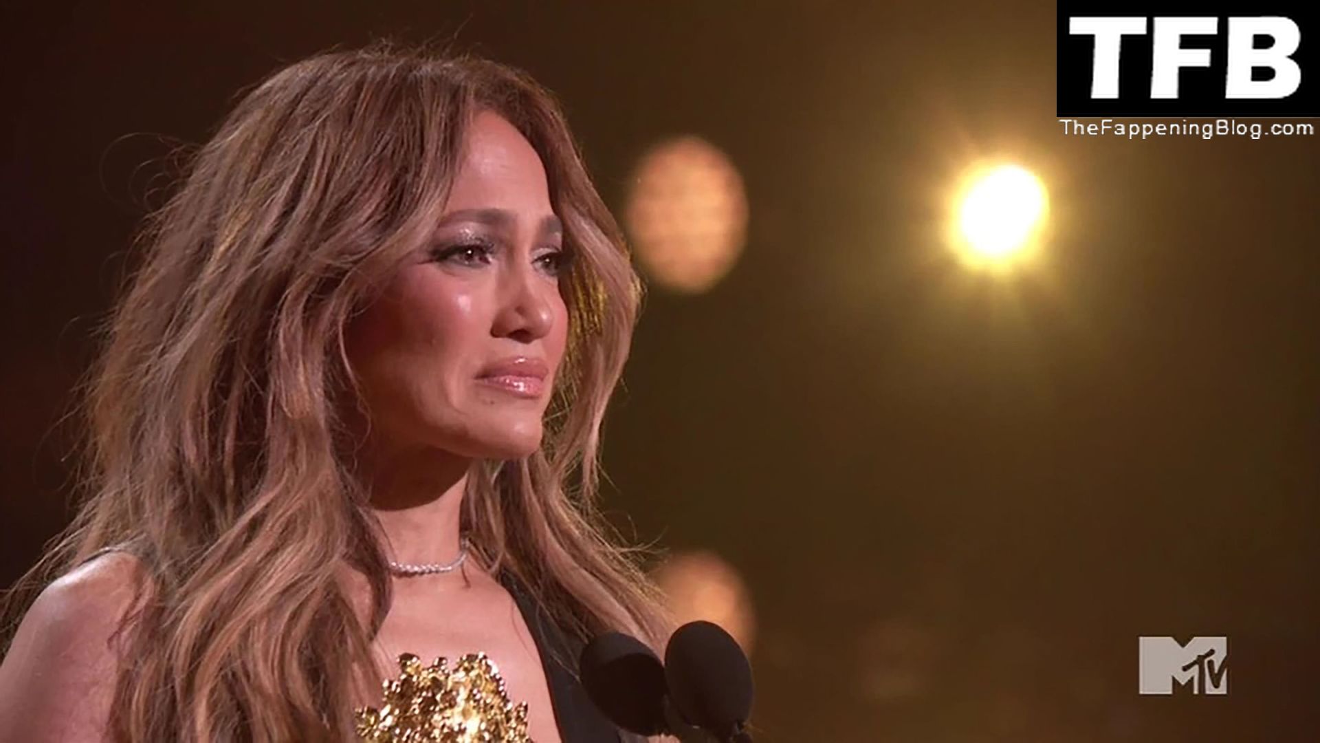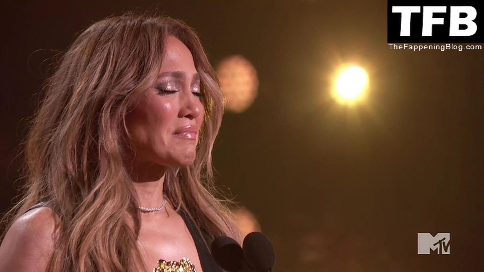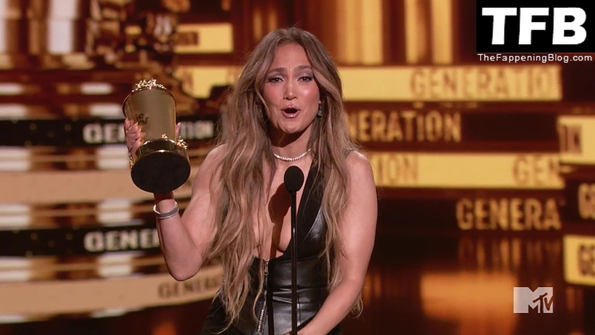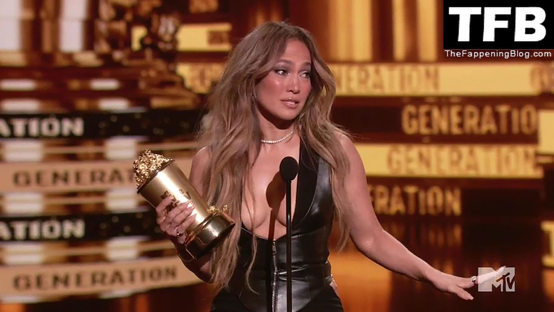 Jennifer Lopez è ritratta sul red carpet degli MTV Movie & TV Awards al Barker Hangar di Santa Monica, 06/05/2022. La cantante si emoziona mentre riceve il Generational Award.