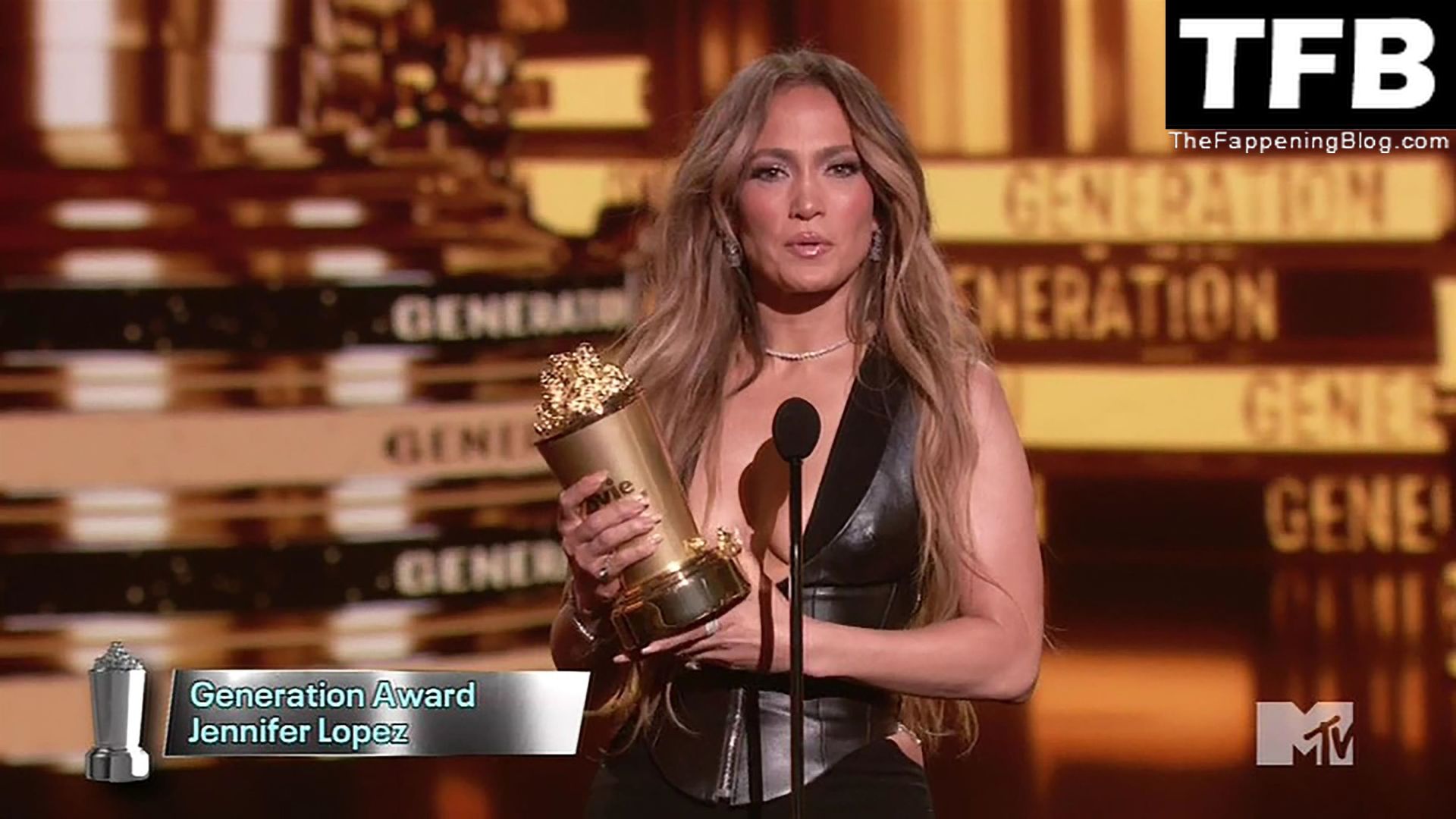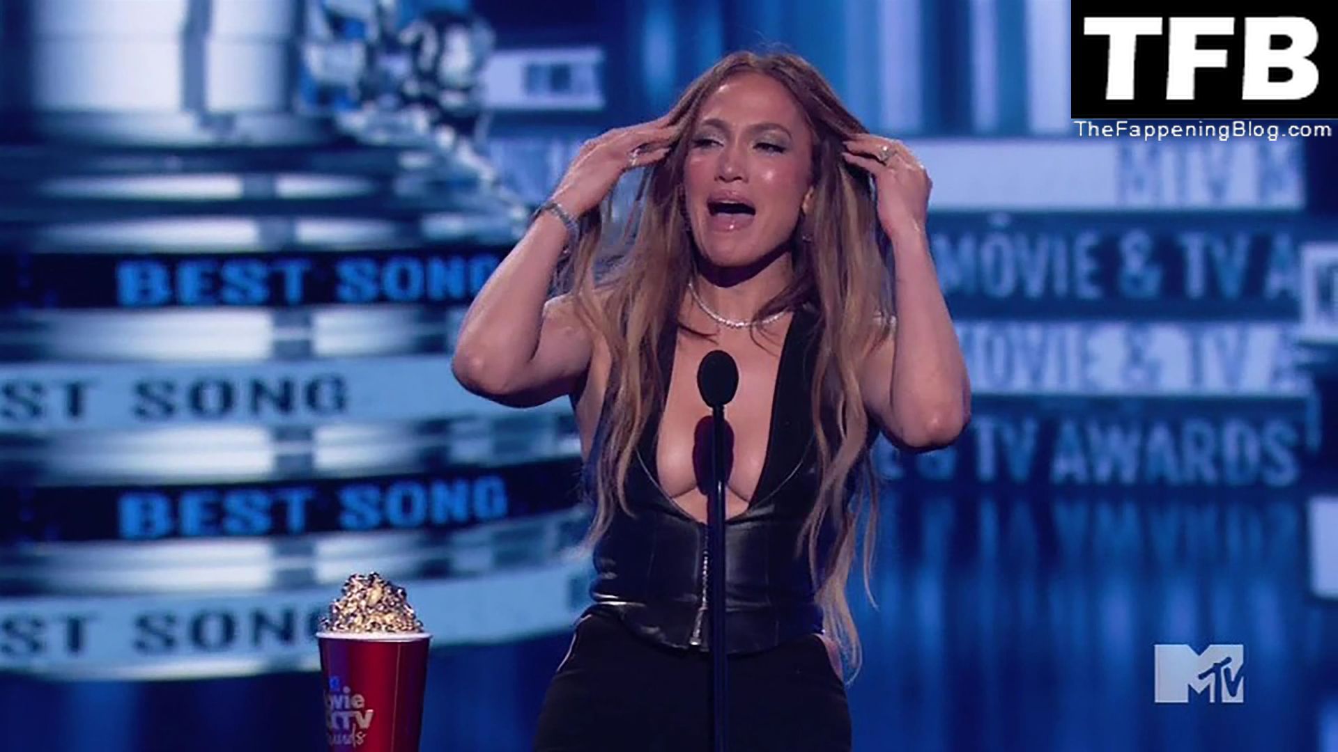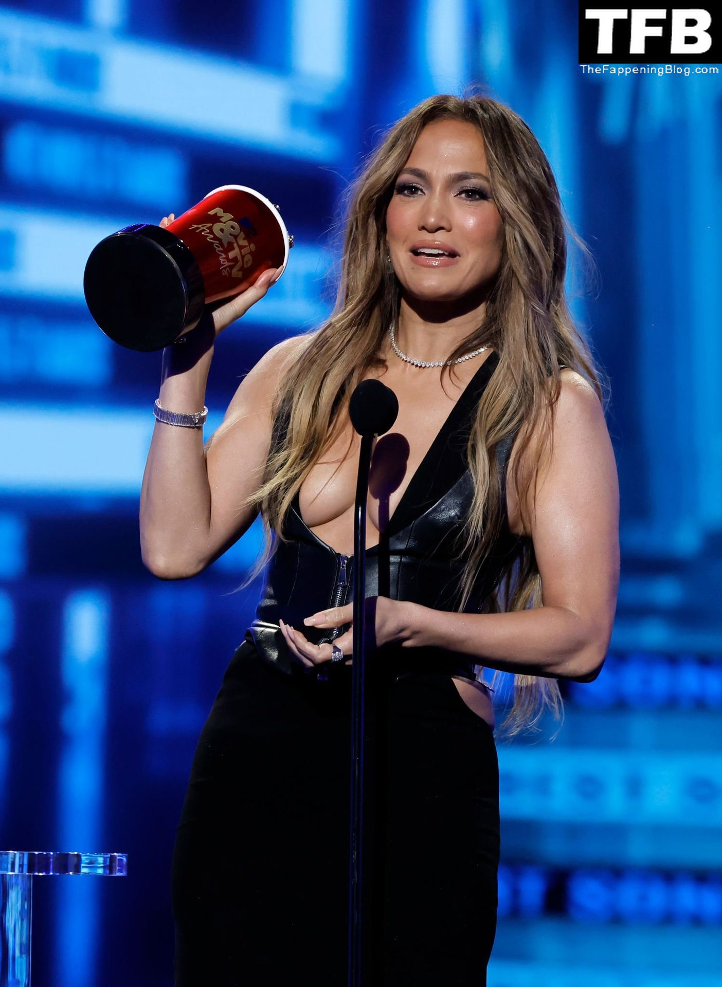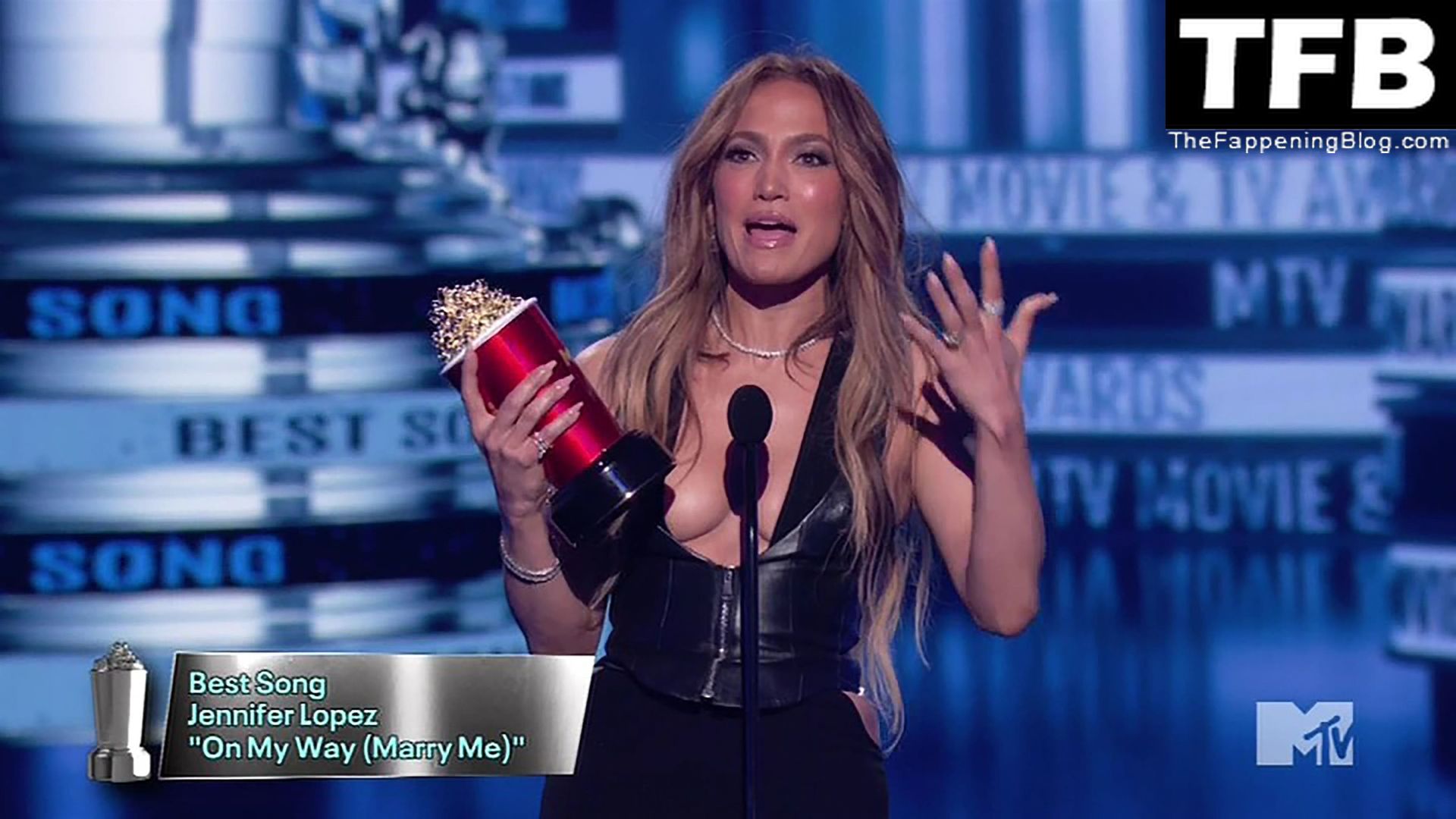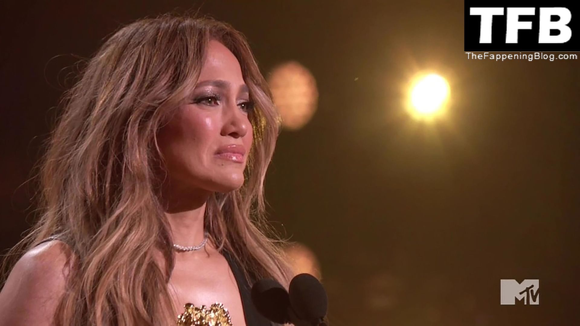 Jennifer Lopez è ritratta sul red carpet degli MTV Movie & TV Awards al Barker Hangar di Santa Monica, 06/05/2022. La cantante si emoziona mentre riceve il Generational Award.