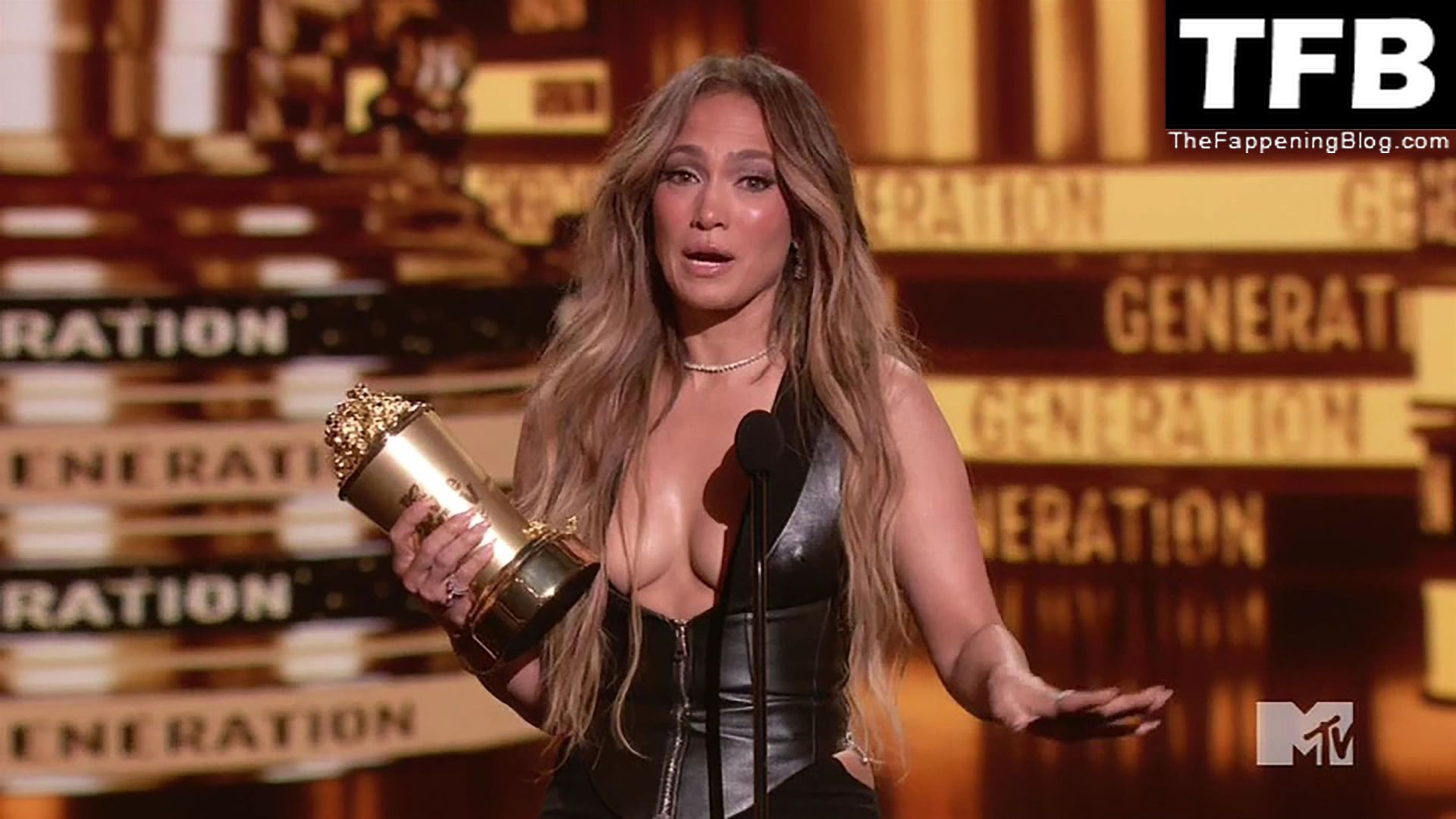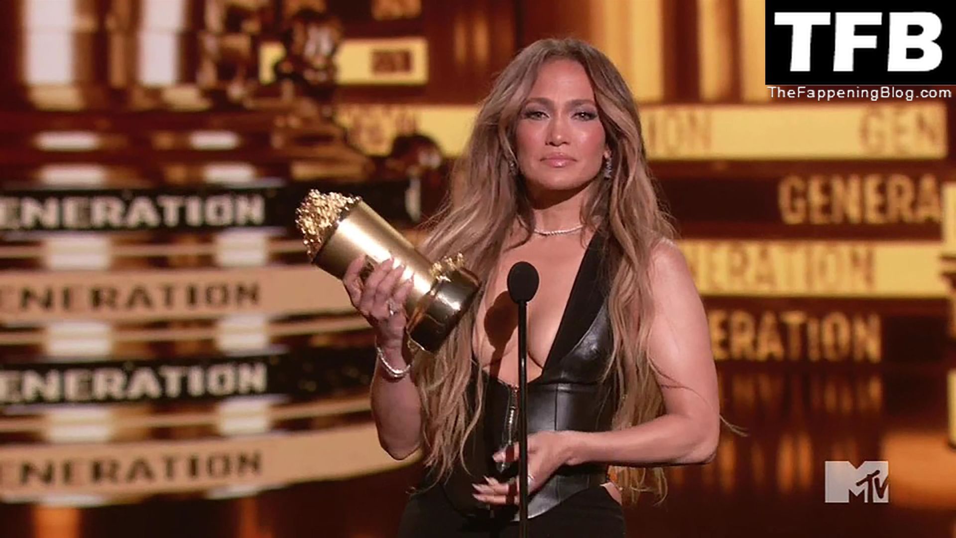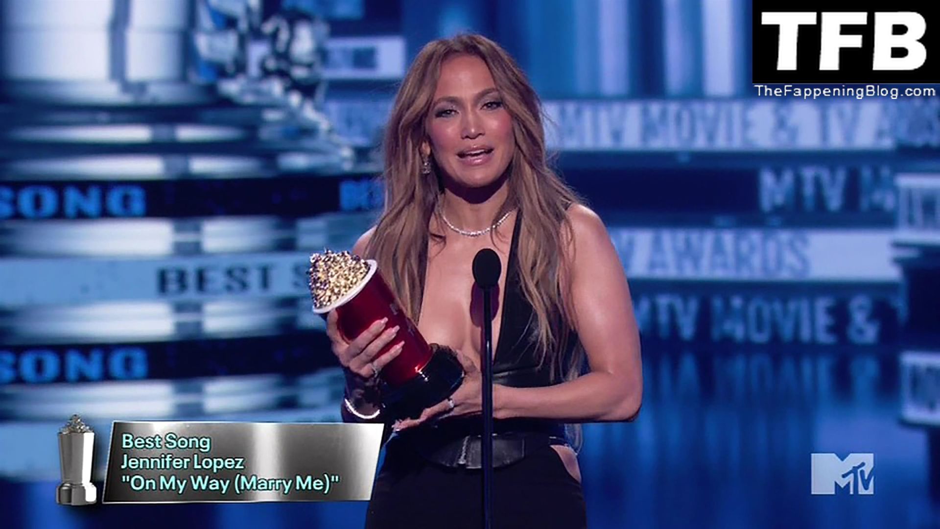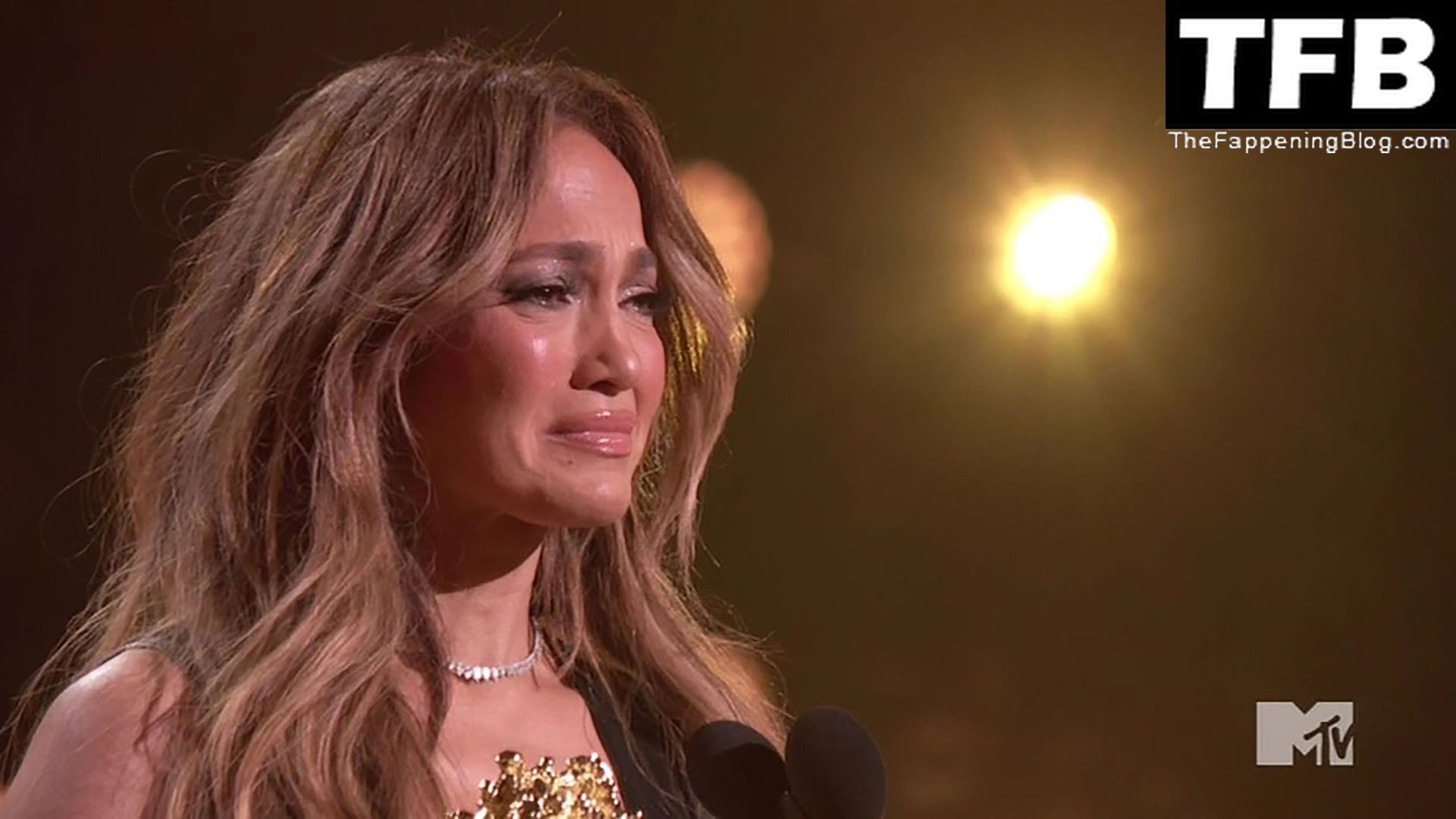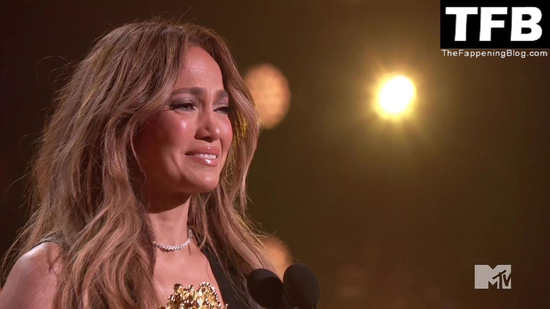 Jennifer Lopez è ritratta sul red carpet degli MTV Movie & TV Awards al Barker Hangar di Santa Monica, 06/05/2022. La cantante si emoziona mentre riceve il Generational Award.