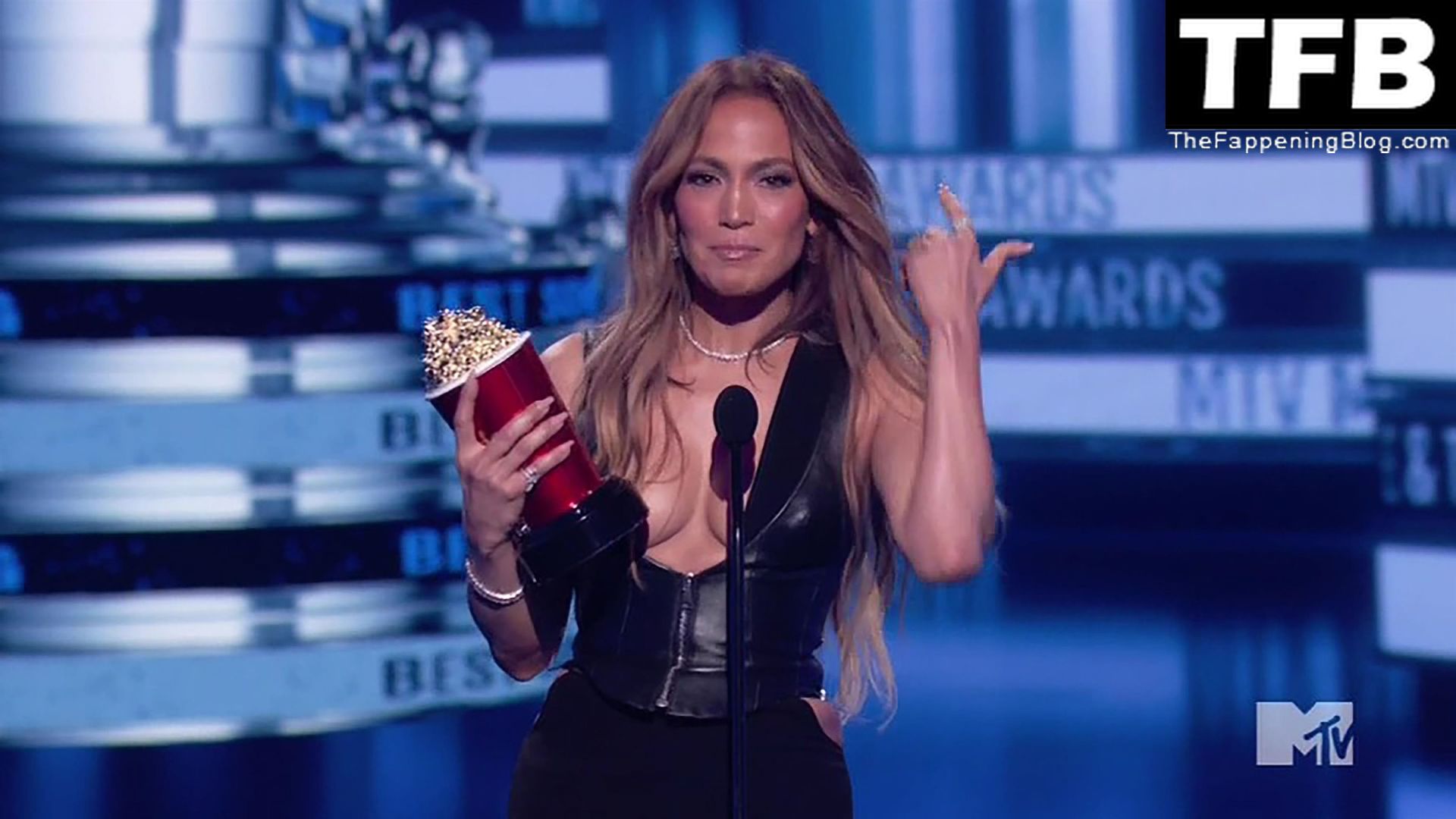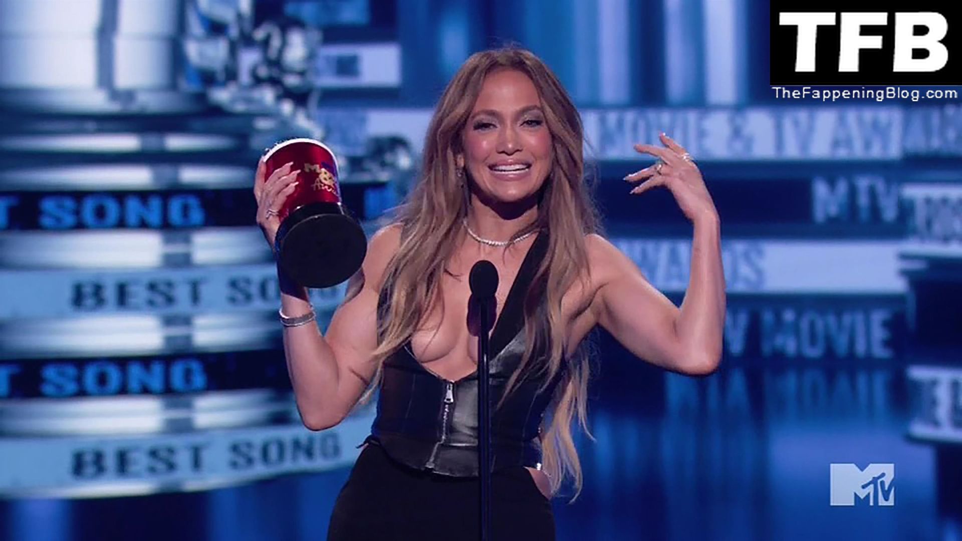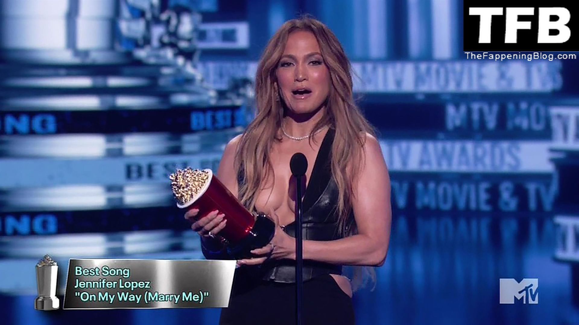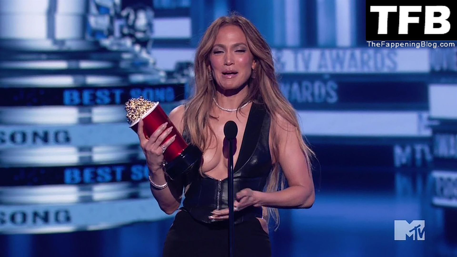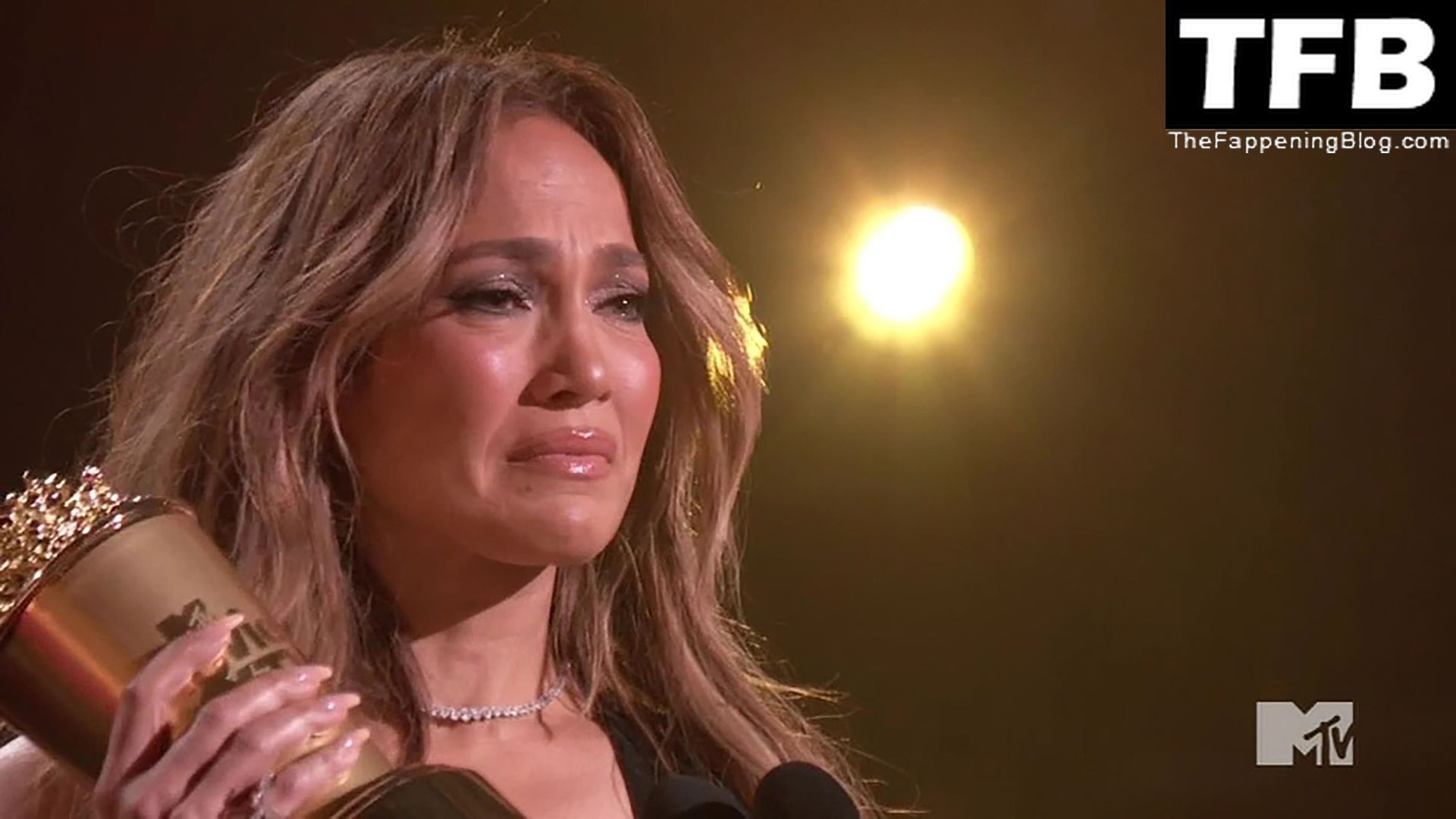 Jennifer Lopez è ritratta sul red carpet degli MTV Movie & TV Awards al Barker Hangar di Santa Monica, 06/05/2022. La cantante si emoziona mentre riceve il Generational Award.