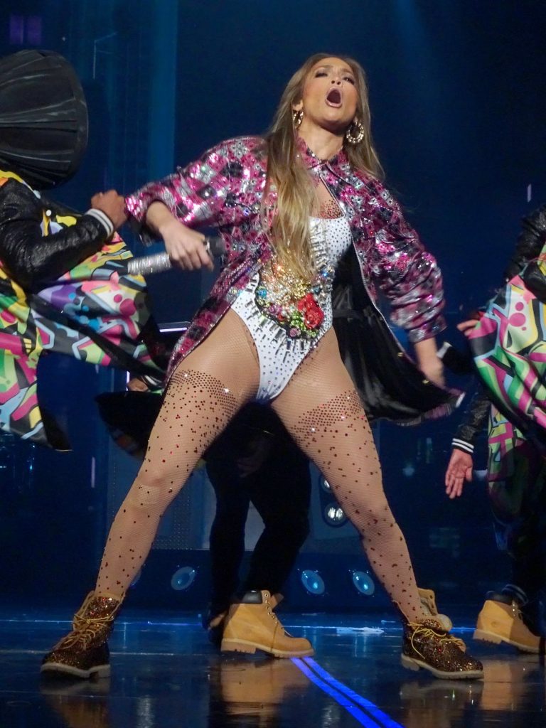 Jennifer Lopez si esibisce sul palco al suo spettacolo a Las Vegas, 06/02/2017. Jennifer “J.Lo” Lopez è un’attrice americana (Bye Bye Birdie Live!), cantante, ballerina. Età – 47.