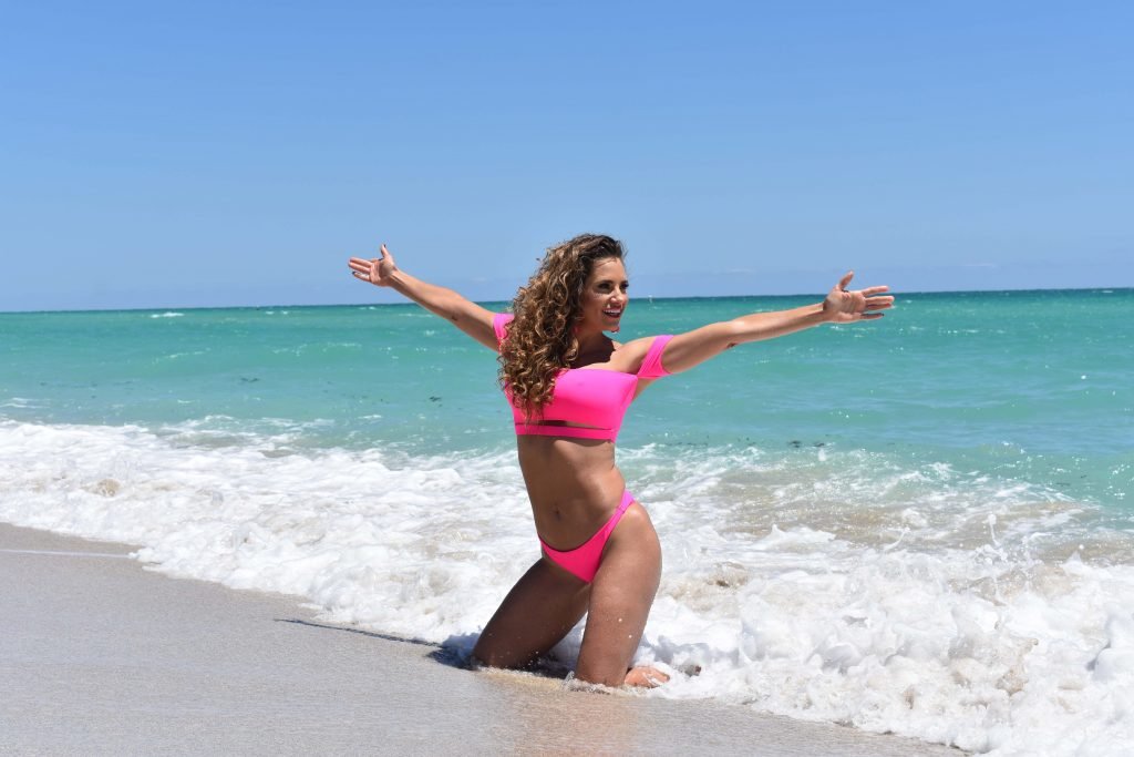 Fitness model e life coach Jennifer Nicole Lee, 42 anni, realizza un nuovo servizio fotografico in bikini rosa sulla spiaggia di Miami Beach, 24/04/2018. La milf ha mostrato il suo corpo abbronzato in onore del nuovo numero di Ocean Magazine.