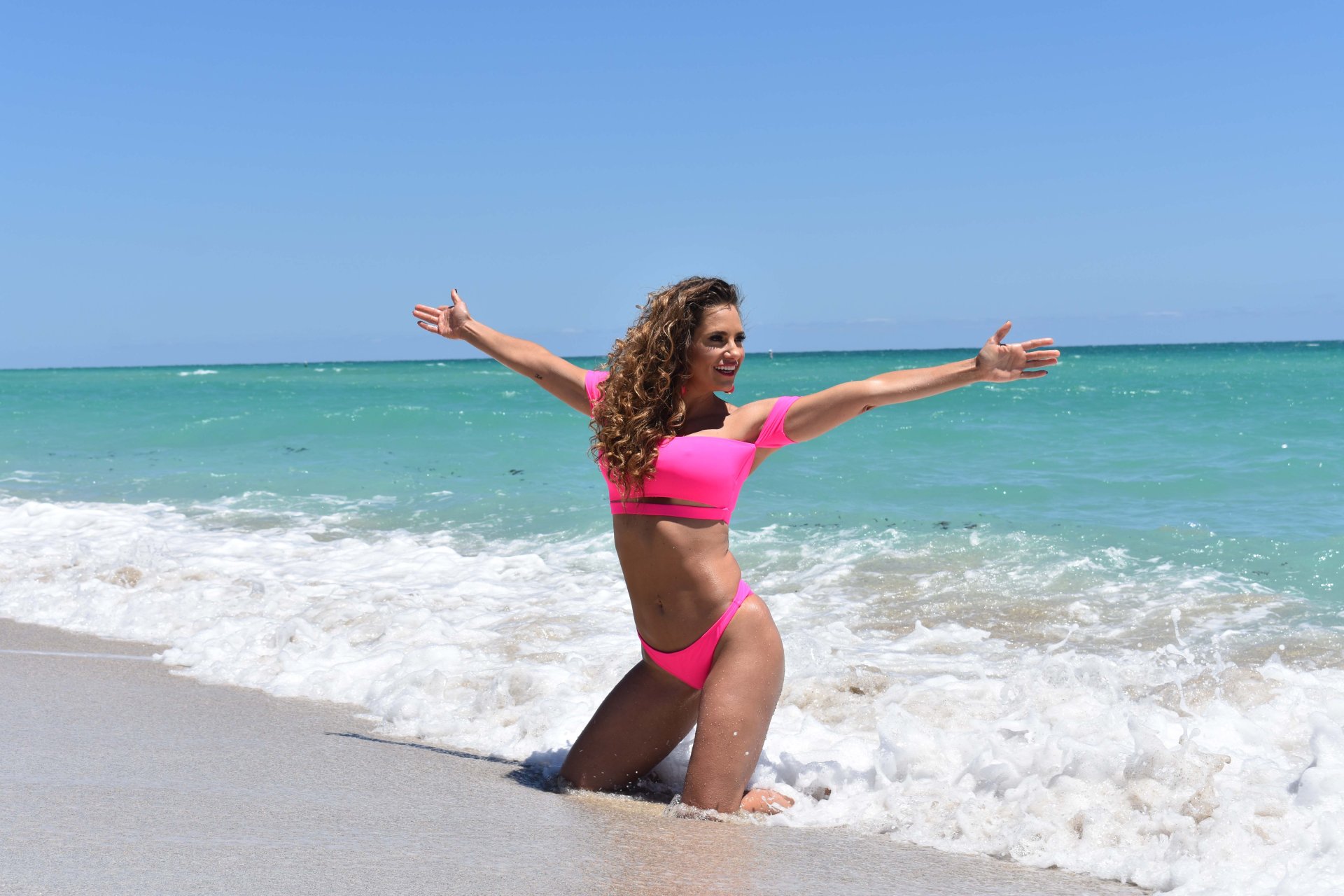 Fitness model e life coach Jennifer Nicole Lee, 42 anni, realizza un nuovo servizio fotografico in bikini rosa sulla spiaggia di Miami Beach, 24/04/2018. La milf ha mostrato il suo corpo abbronzato in onore del nuovo numero di Ocean Magazine.