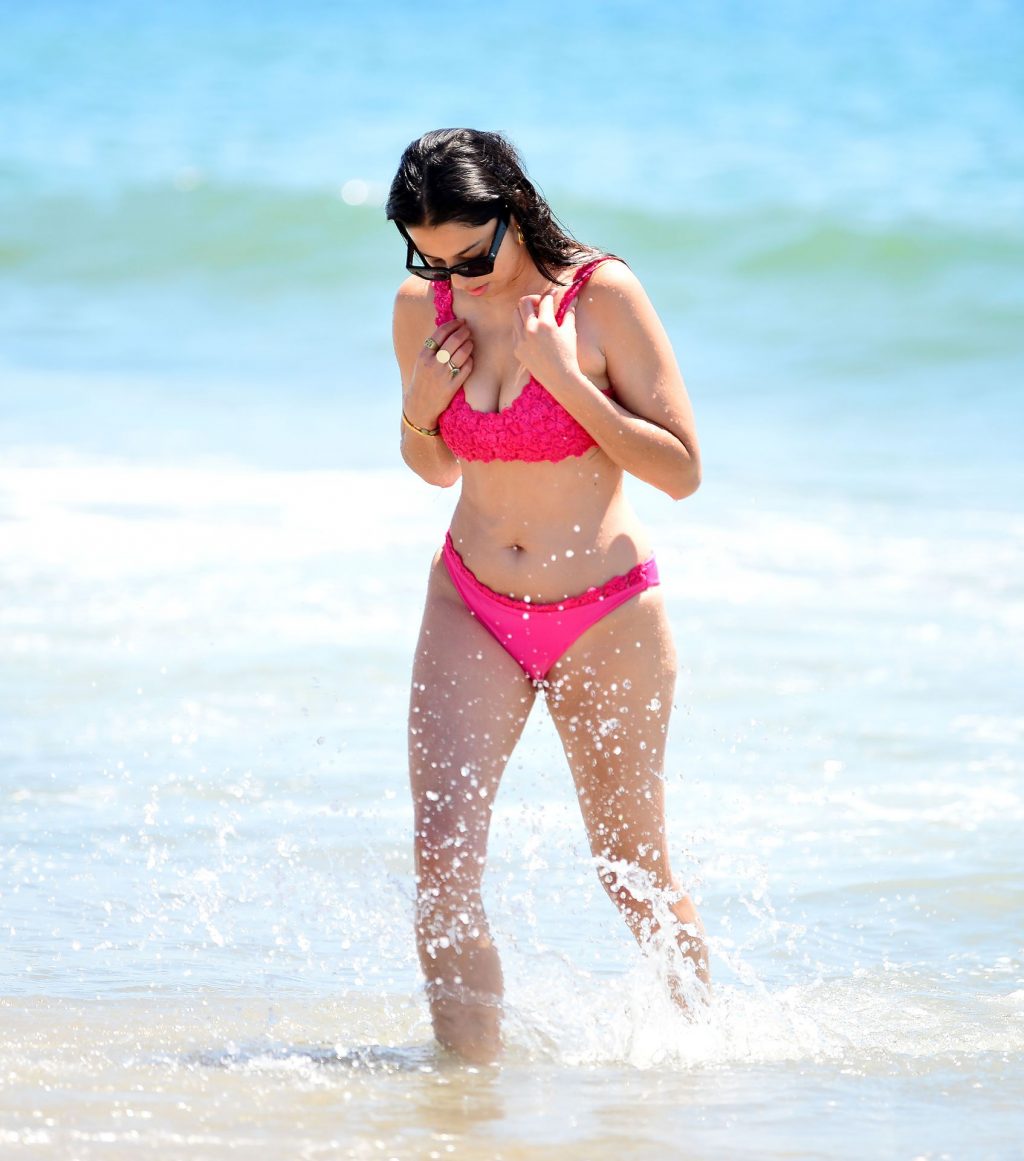 La modella australiana Jessica Gomes indossa un bikini rosa acceso e succinto di She Made Me mentre si rinfresca nell’oceano durante una giornata in spiaggia, 16/07/2020.