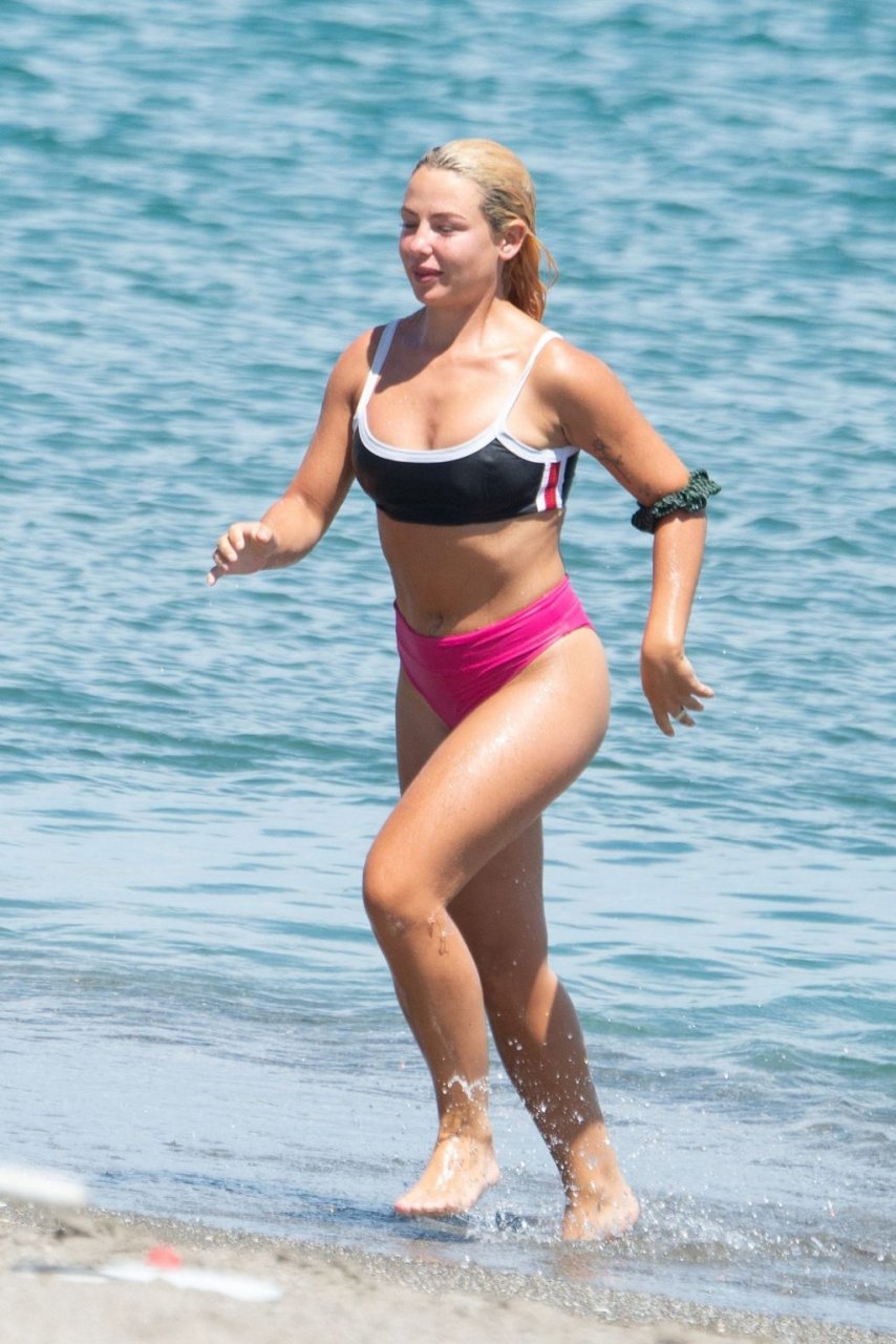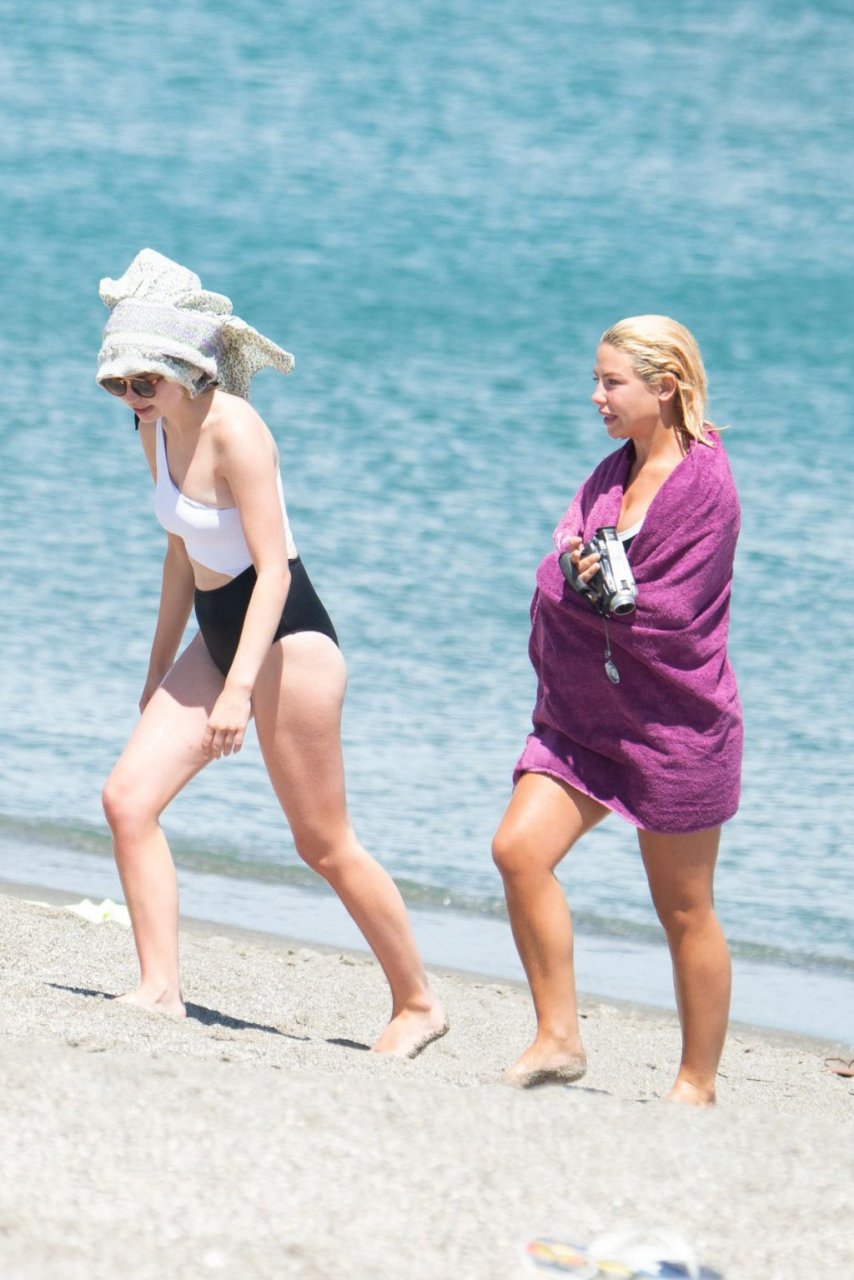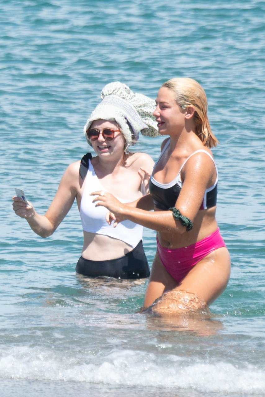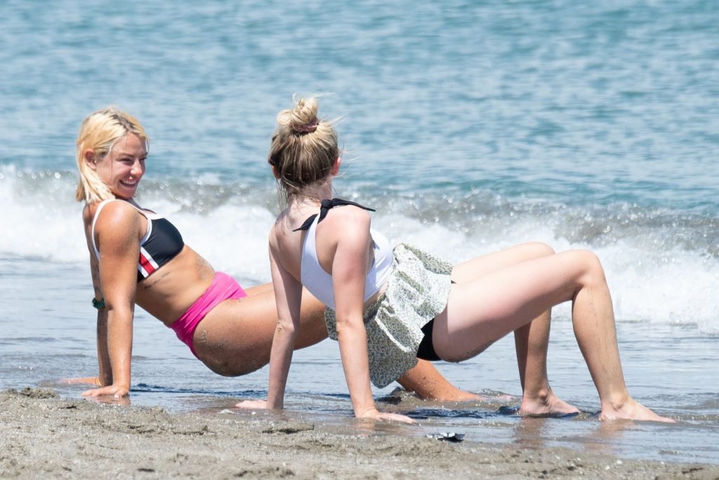 Jessica Anne Woodley e Georgia Toffolo trascorrono una giornata divertente sulla spiaggia a Sotogrande, Cadice, 26/07/2019.