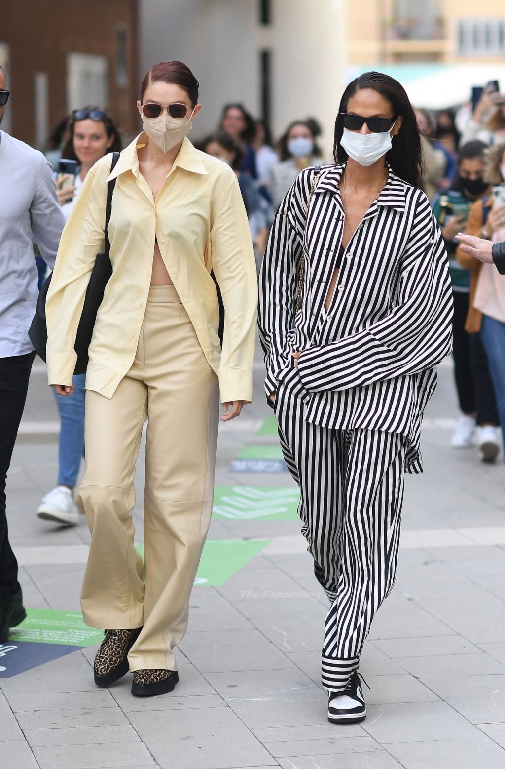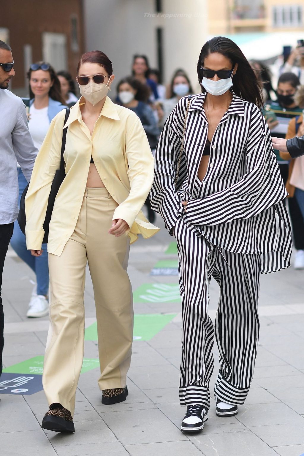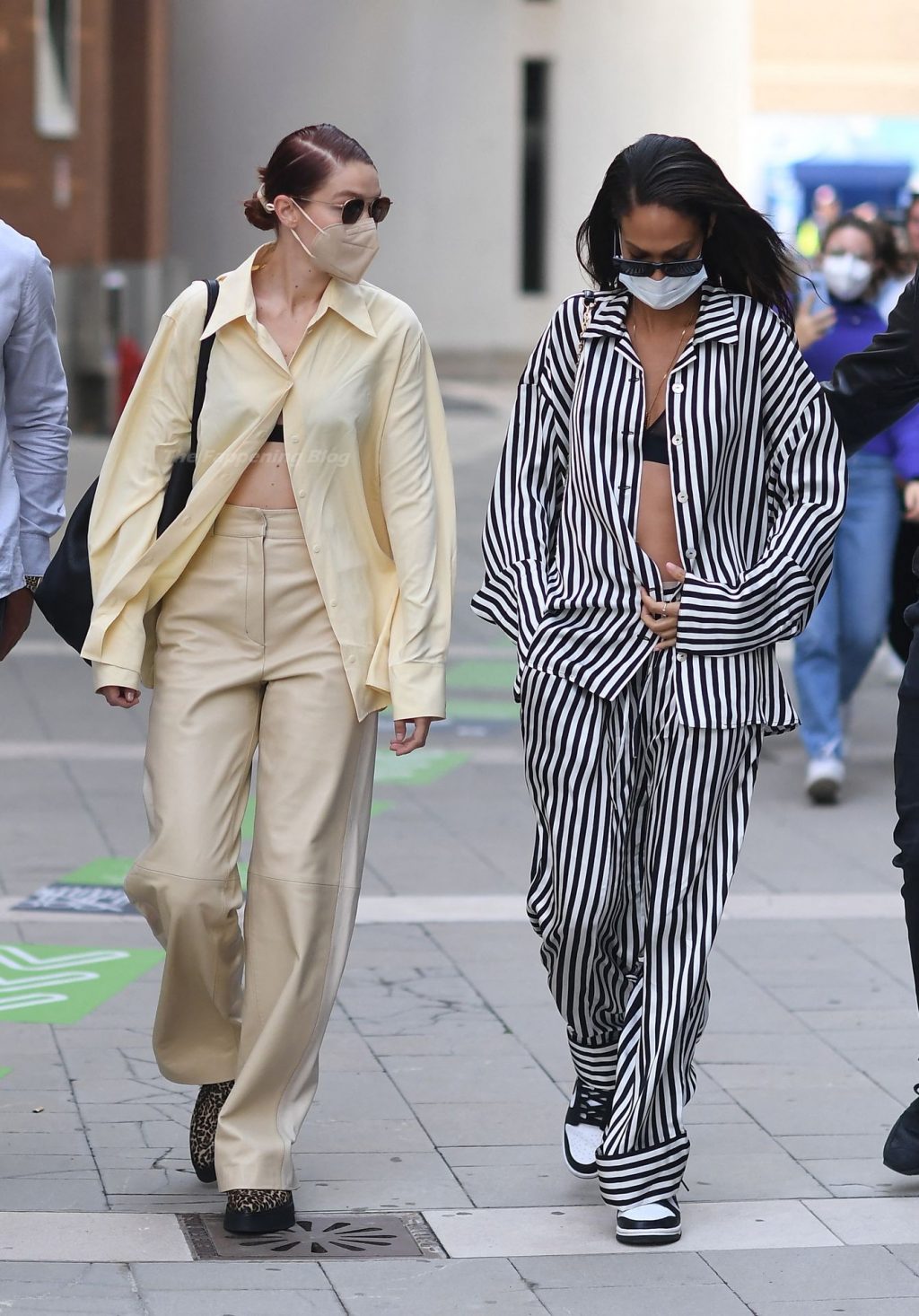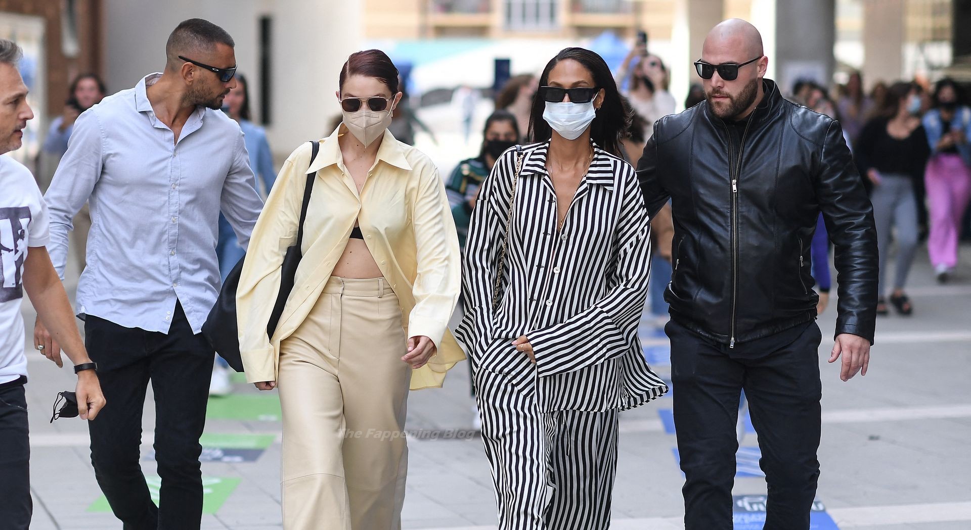Gigi Hadid e Joan Smalls sono state viste durante la Settimana della Moda di Milano a Milano, 23/09/2021. Joan mostra il capezzolo, indossando un reggiseno trasparente.