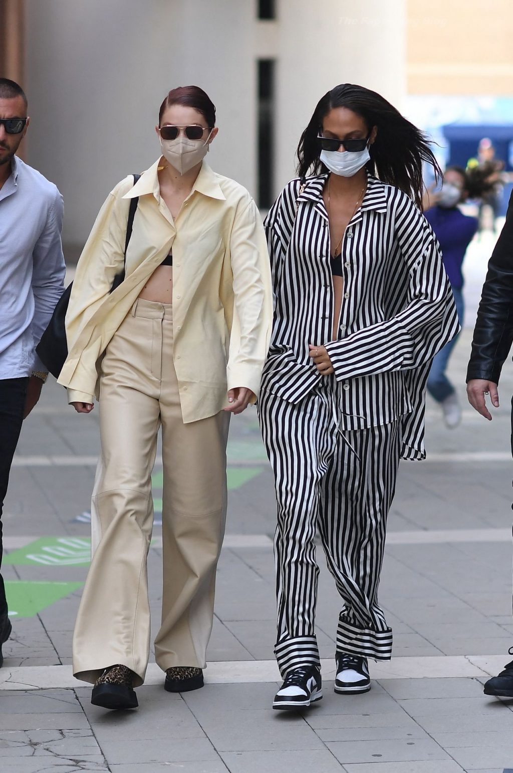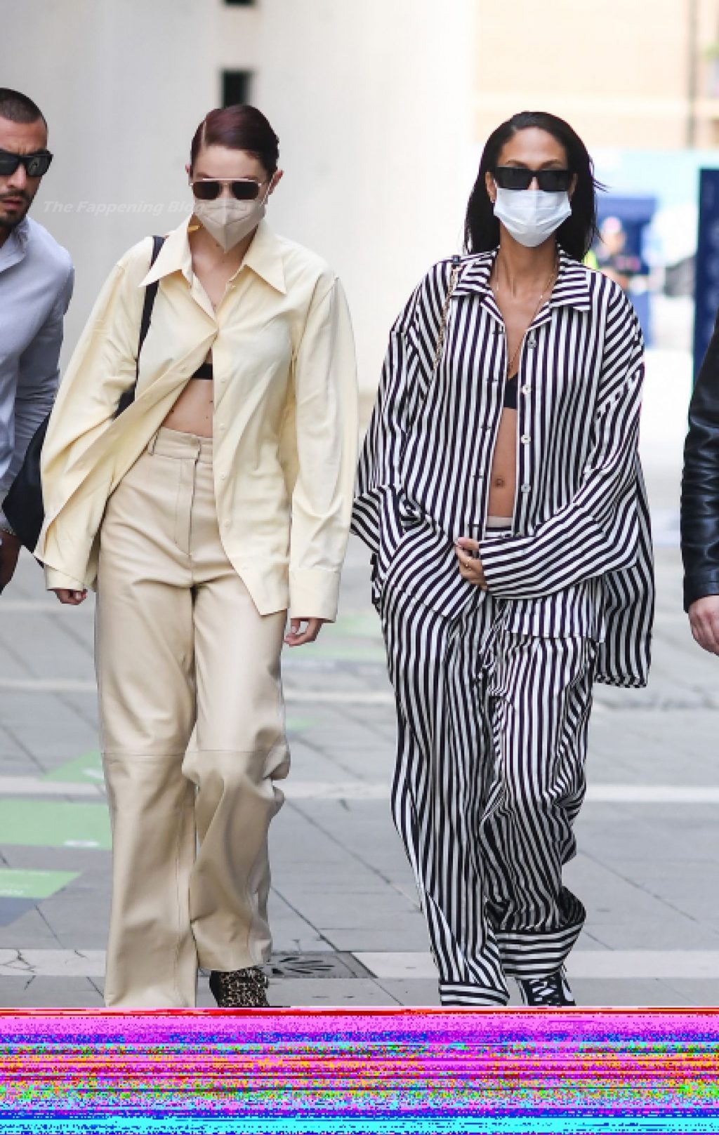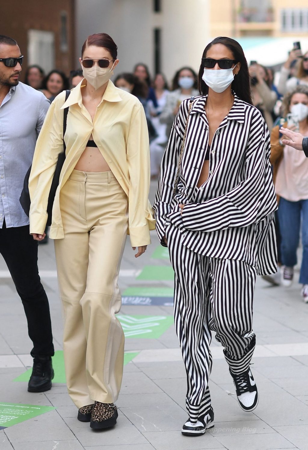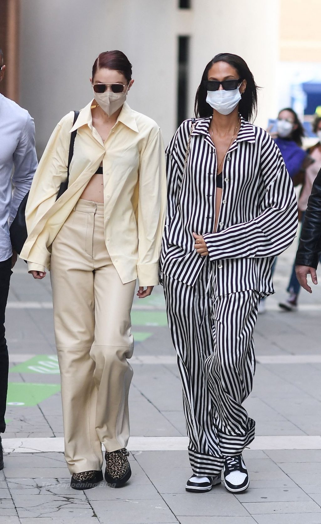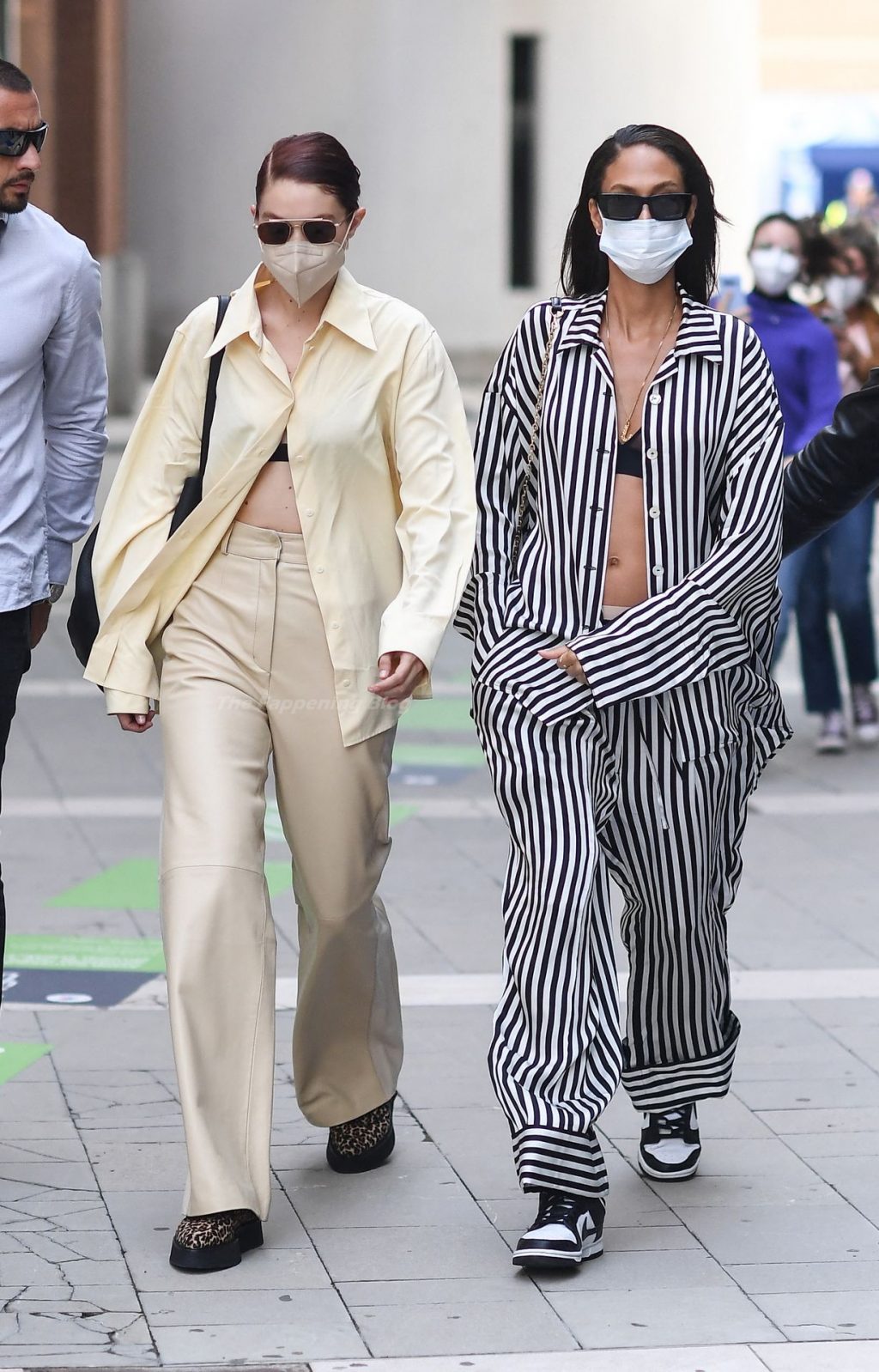 Gigi Hadid e Joan Smalls sono state viste durante la Settimana della Moda di Milano a Milano, 23/09/2021. Joan mostra il capezzolo, indossando un reggiseno trasparente.