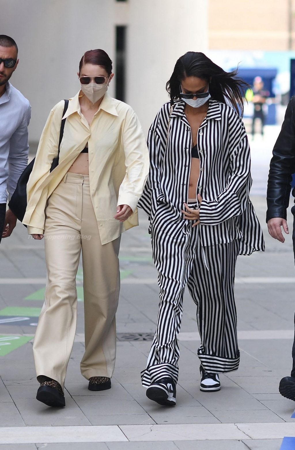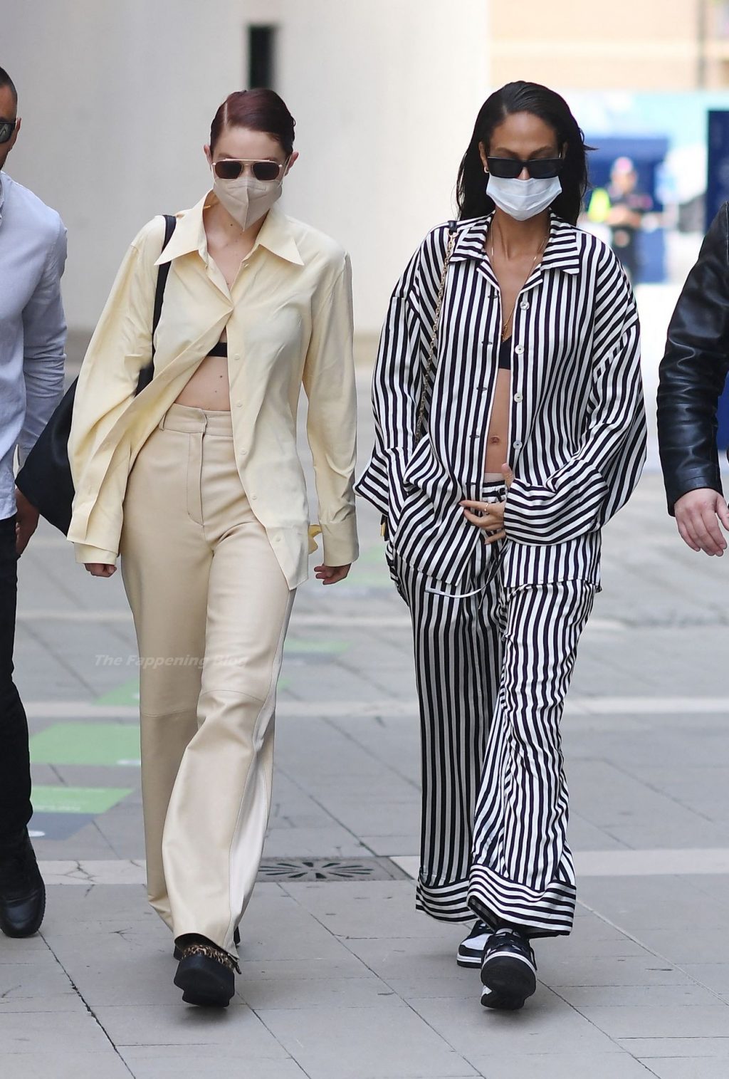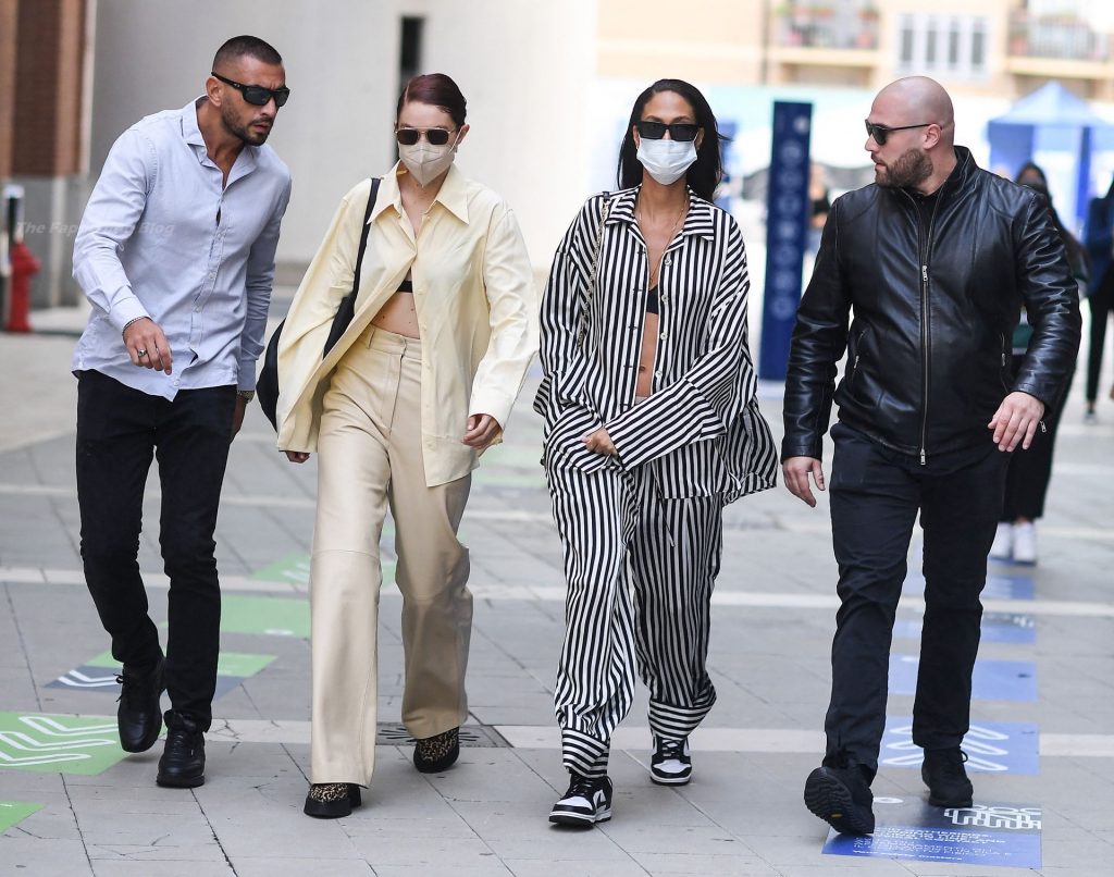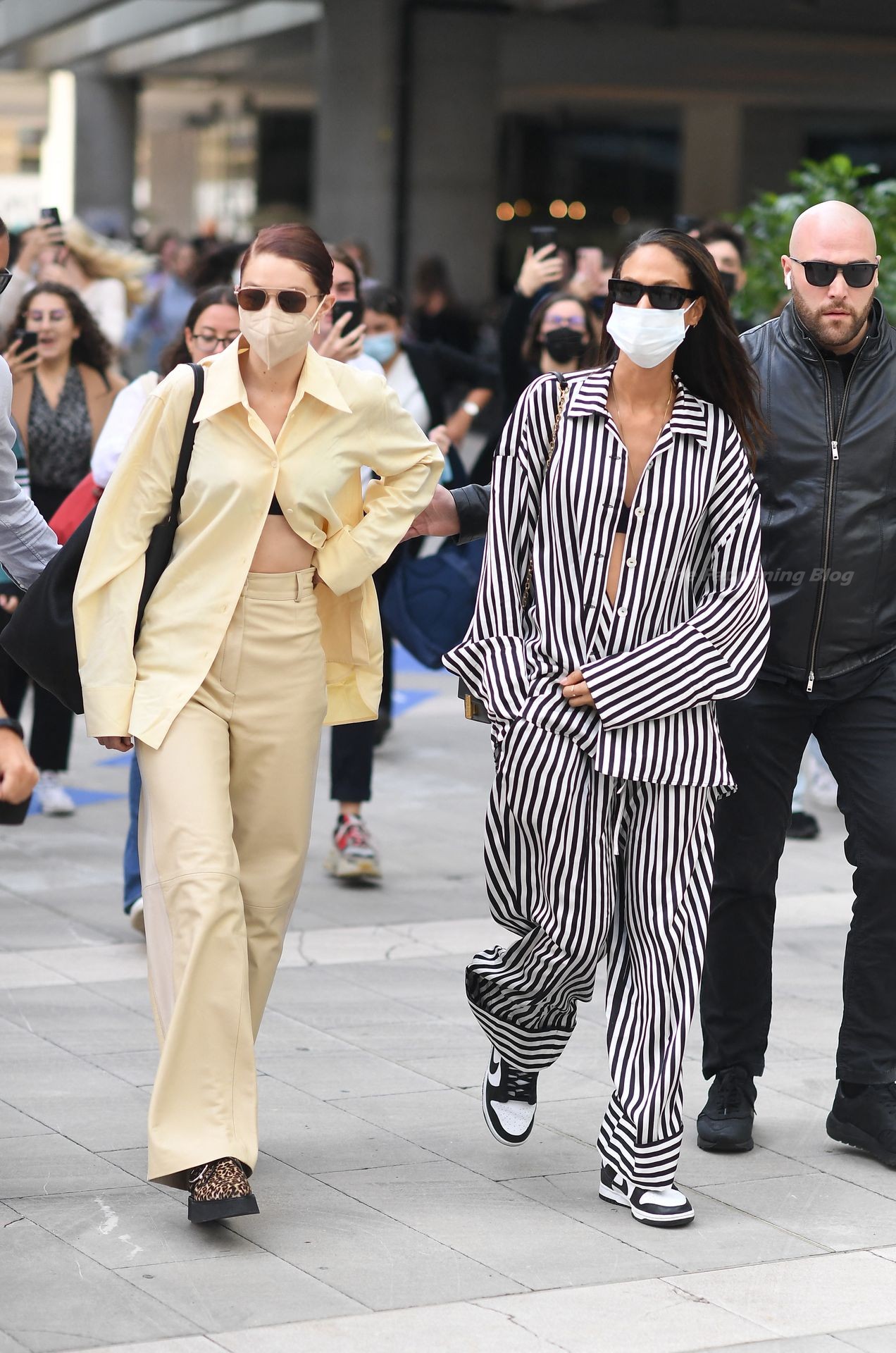 Gigi Hadid e Joan Smalls sono state viste durante la Settimana della Moda di Milano a Milano, 23/09/2021. Joan mostra il capezzolo, indossando un reggiseno trasparente.