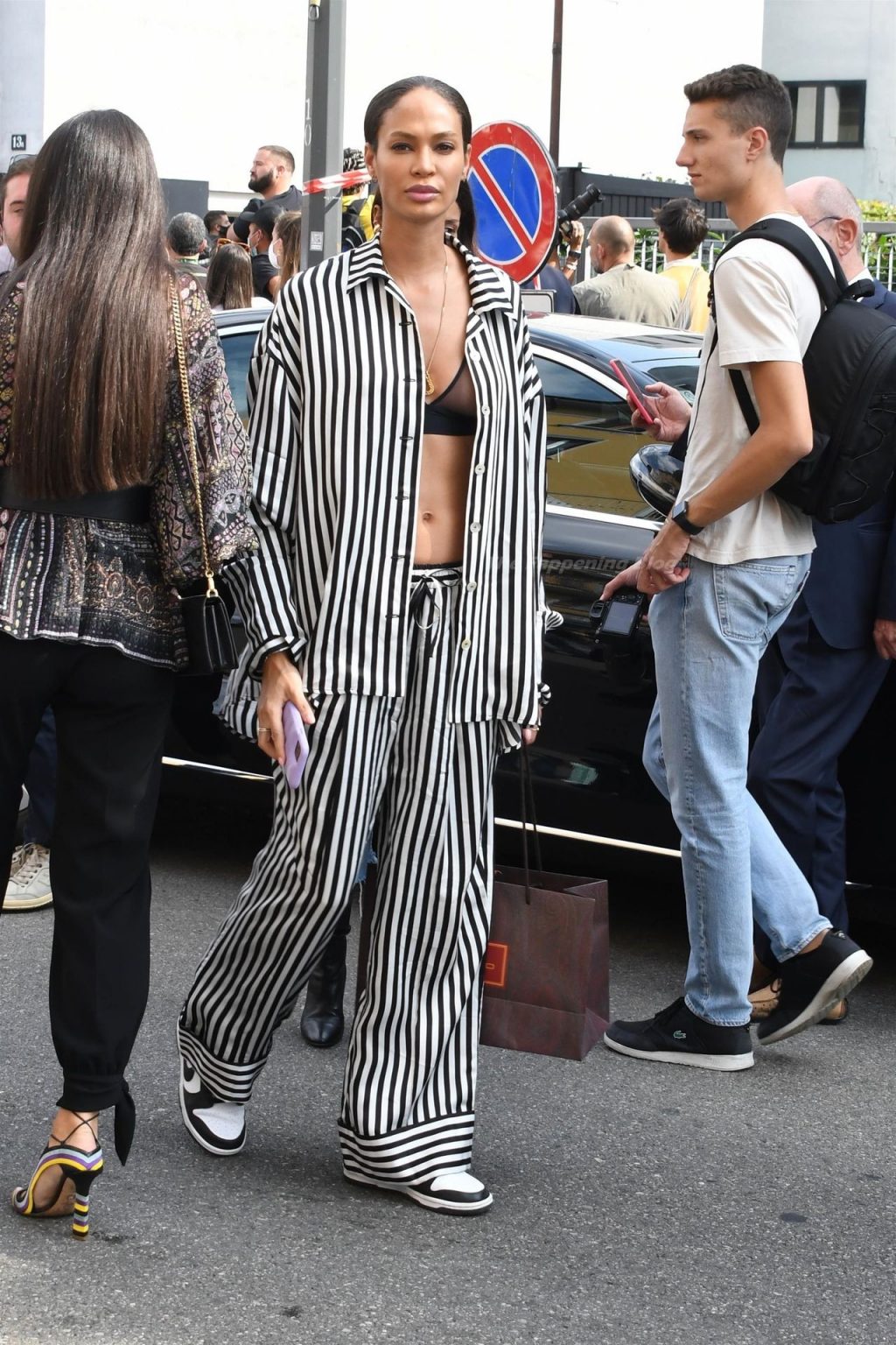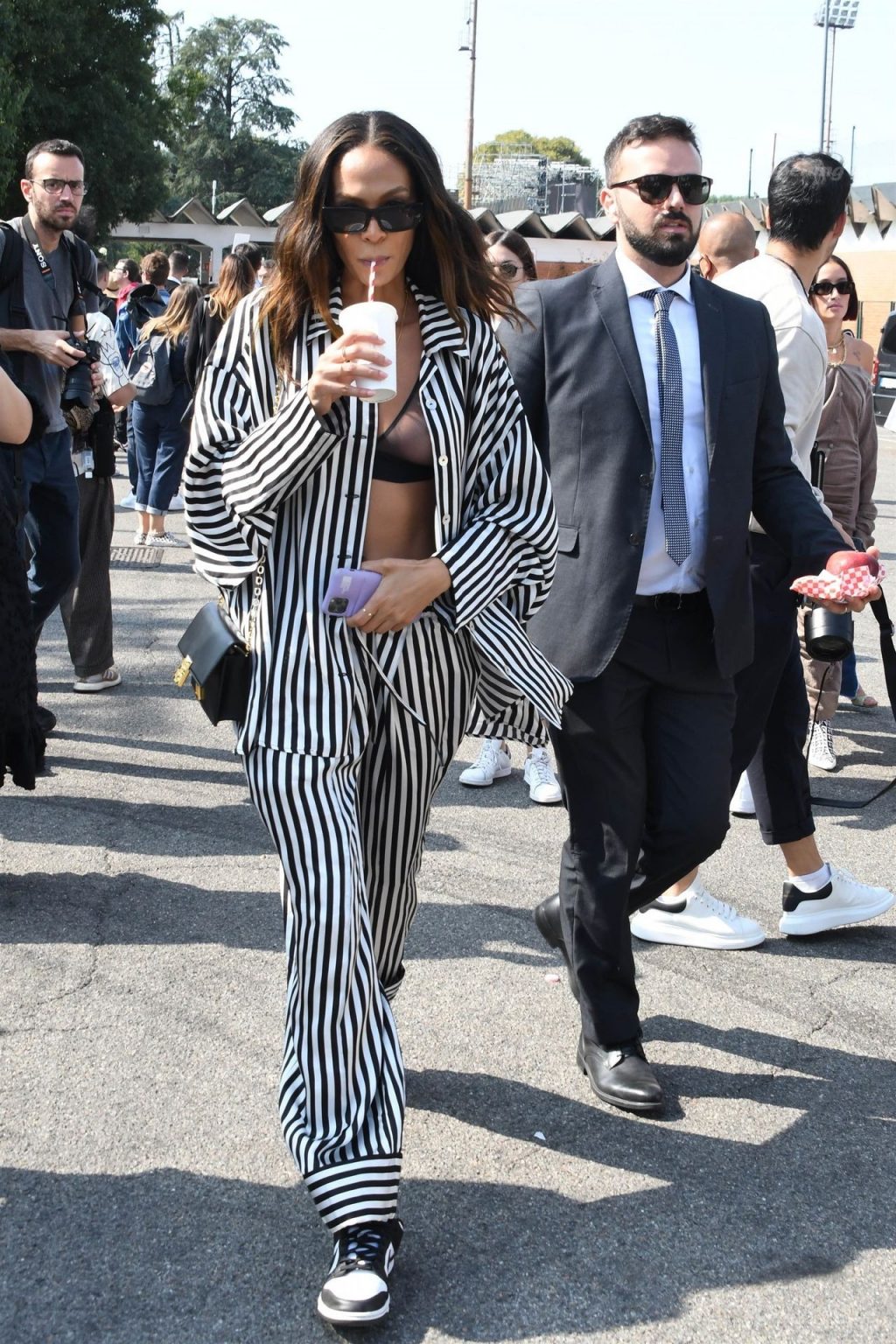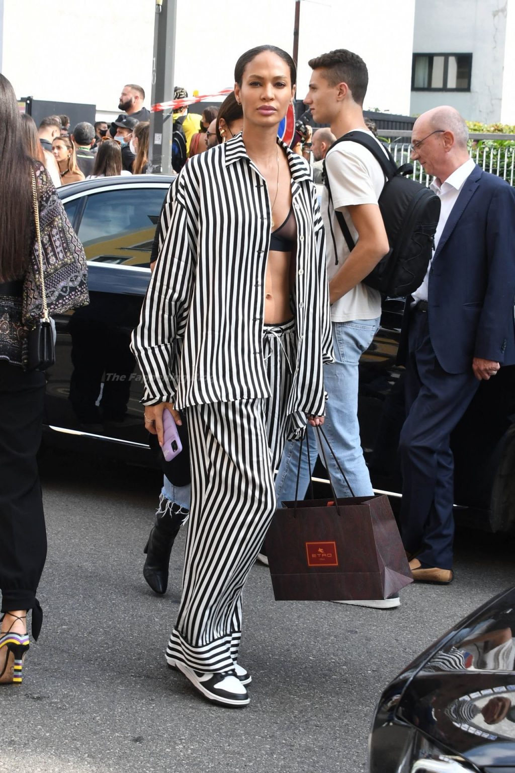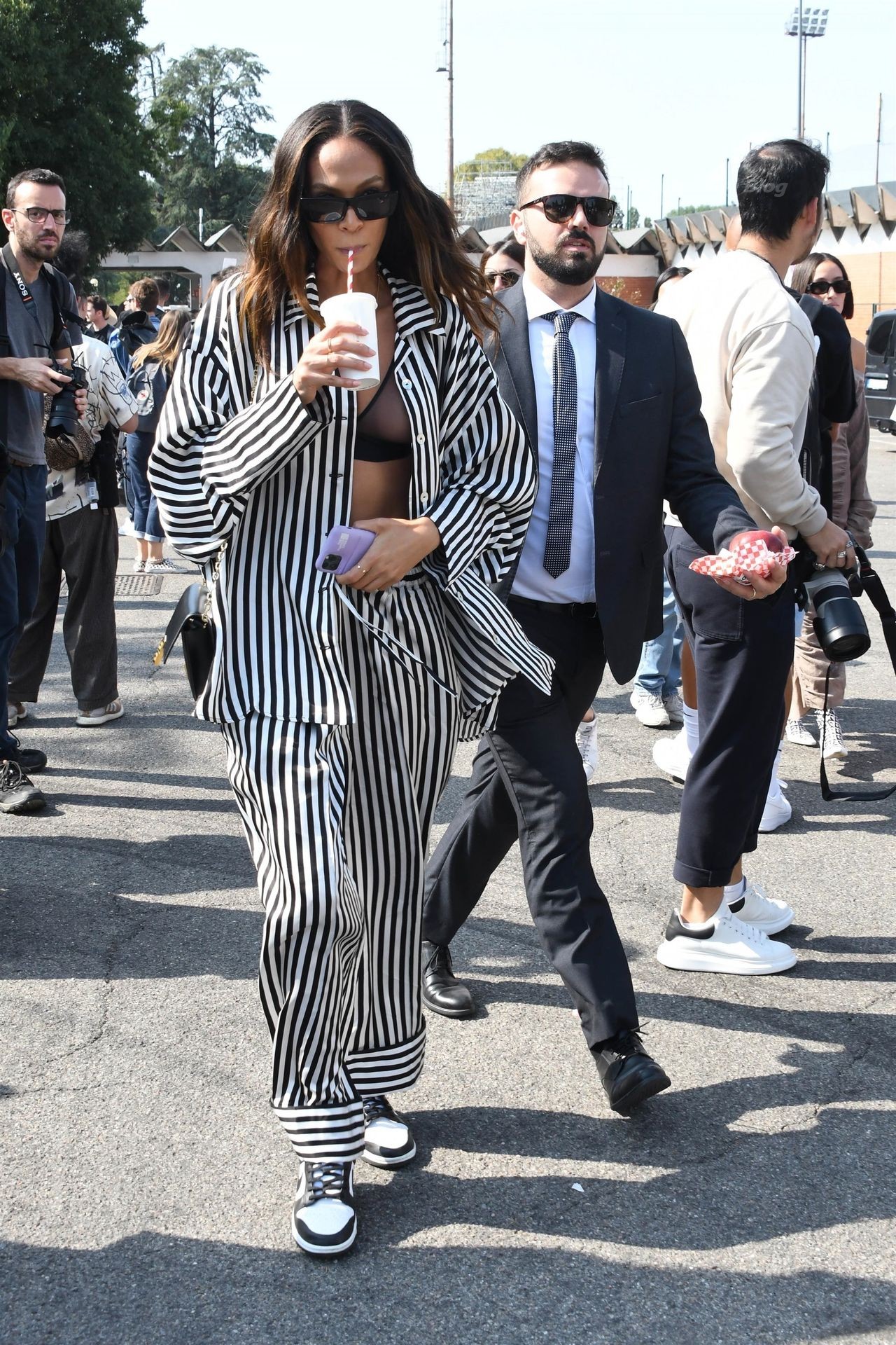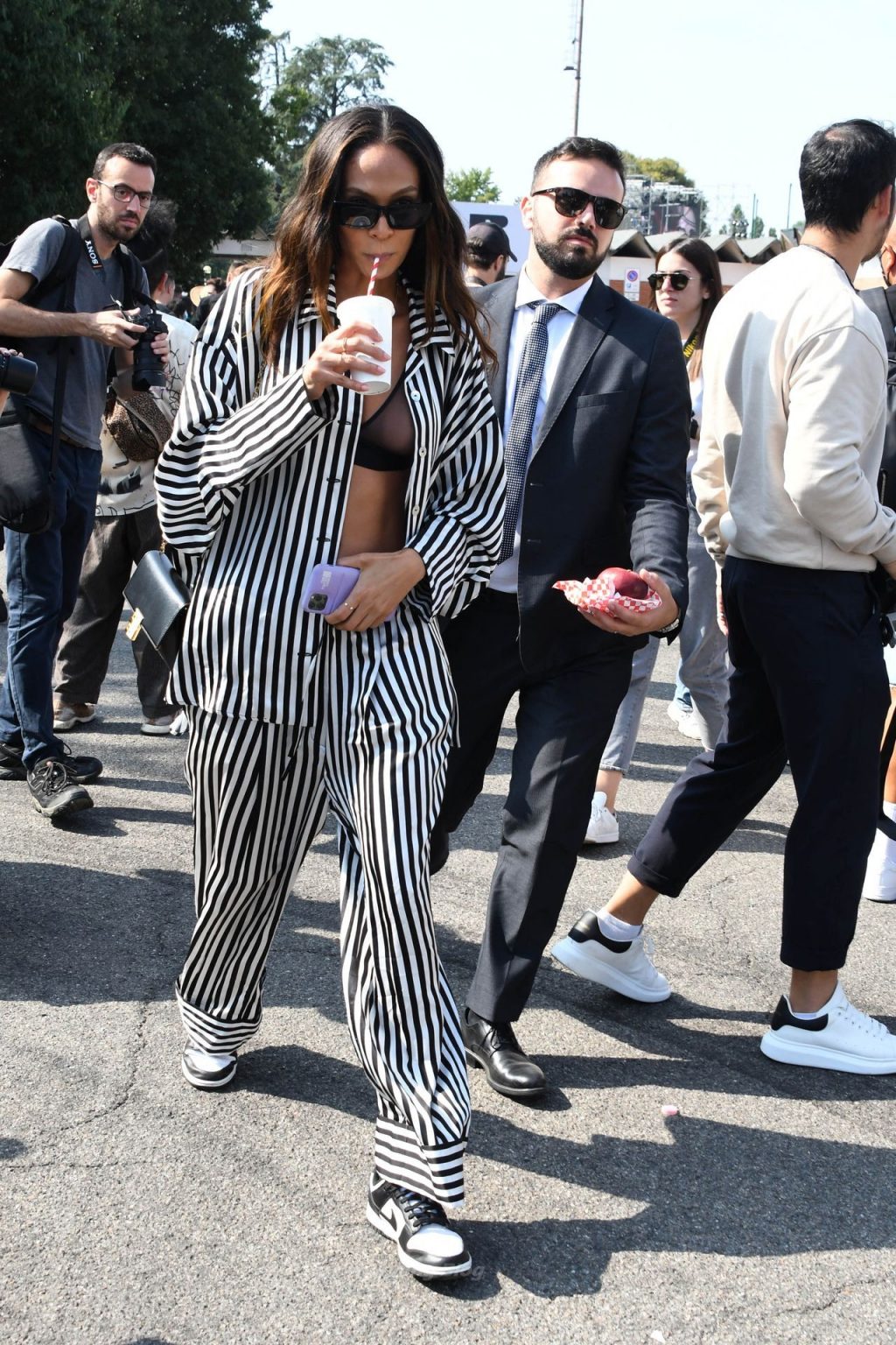 Gigi Hadid e Joan Smalls sono state viste durante la Settimana della Moda di Milano a Milano, 23/09/2021. Joan mostra il capezzolo, indossando un reggiseno trasparente.