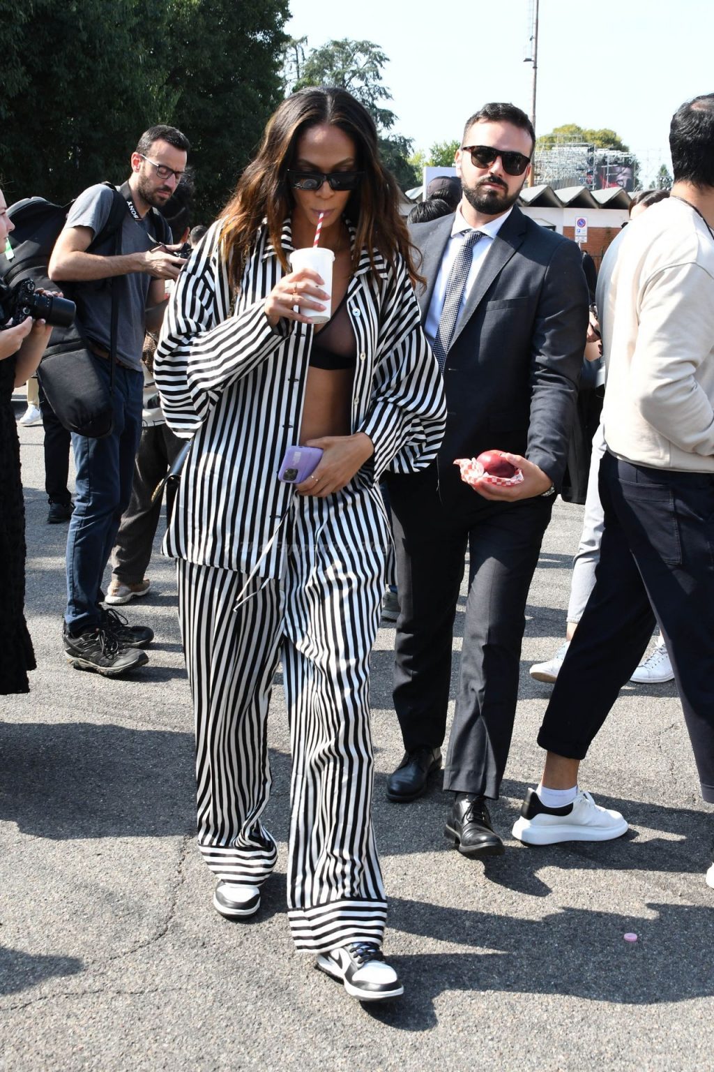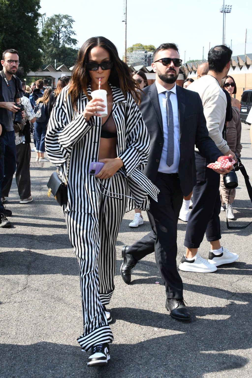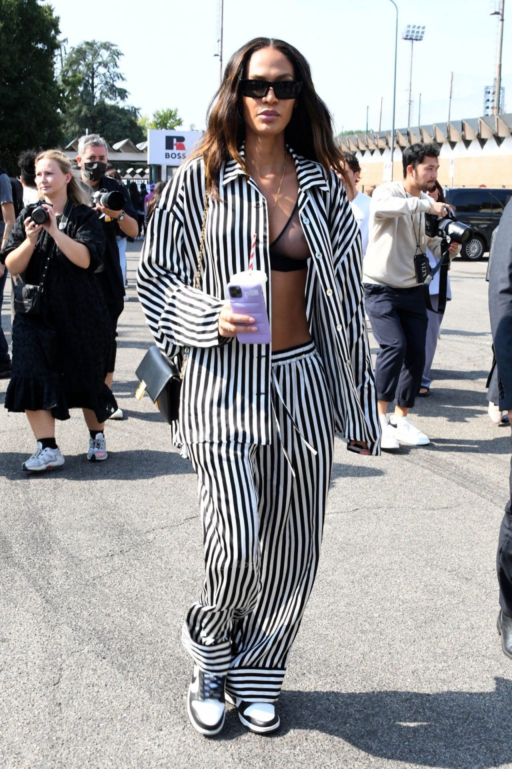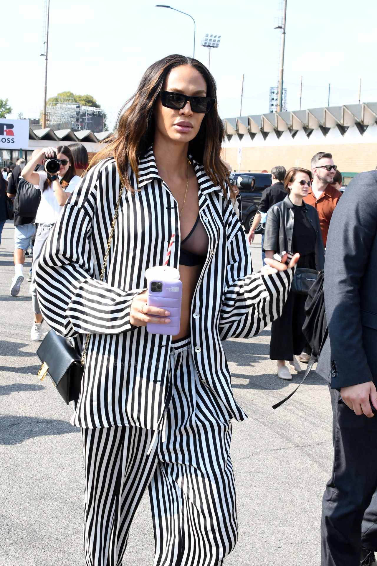 Gigi Hadid e Joan Smalls sono state viste durante la Settimana della Moda di Milano a Milano, 23/09/2021. Joan mostra il capezzolo, indossando un reggiseno trasparente.