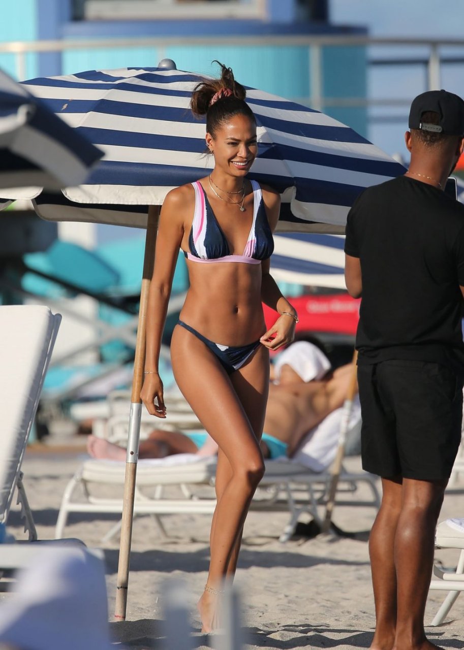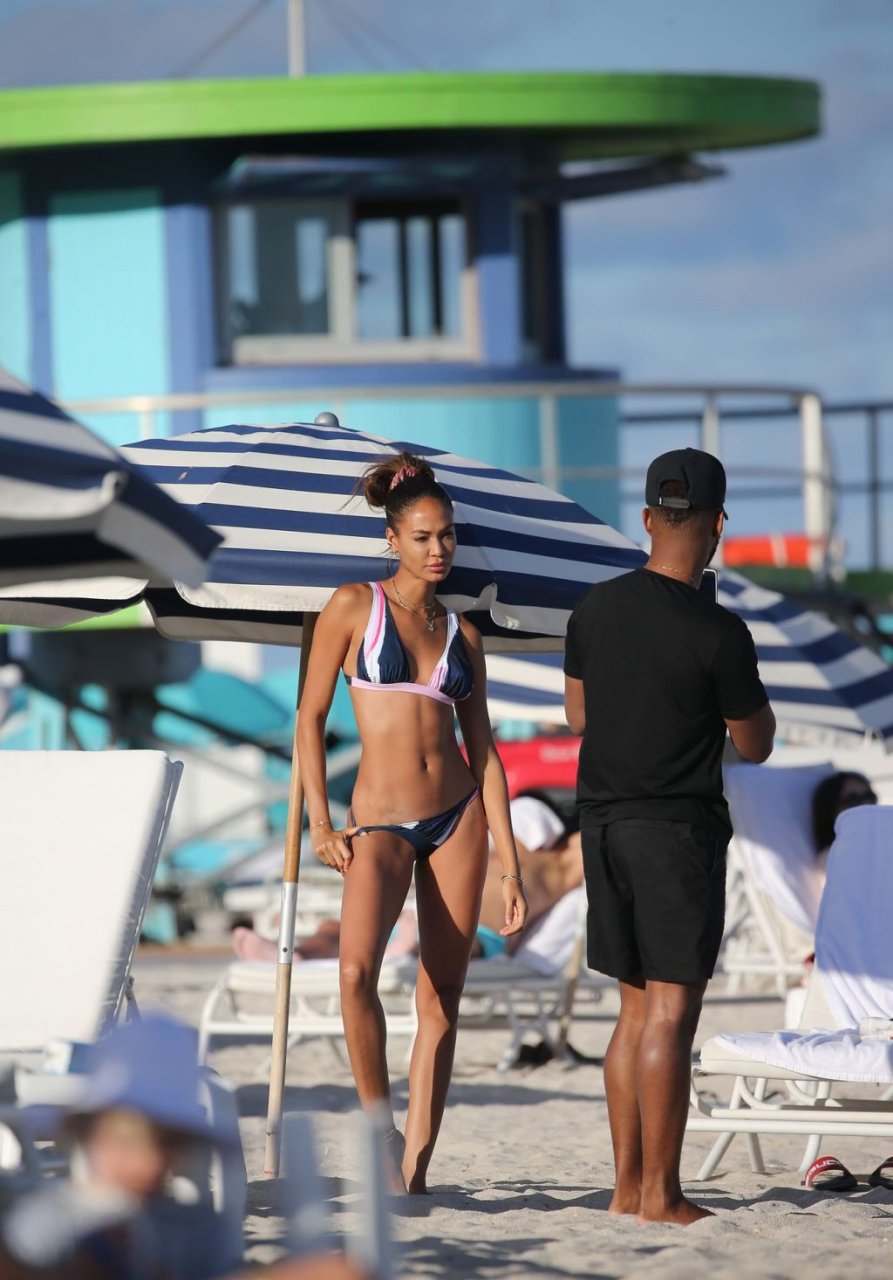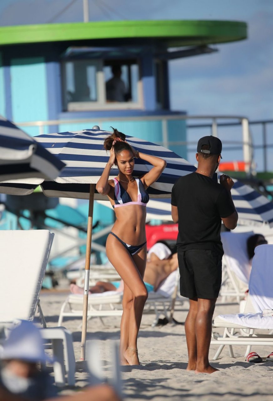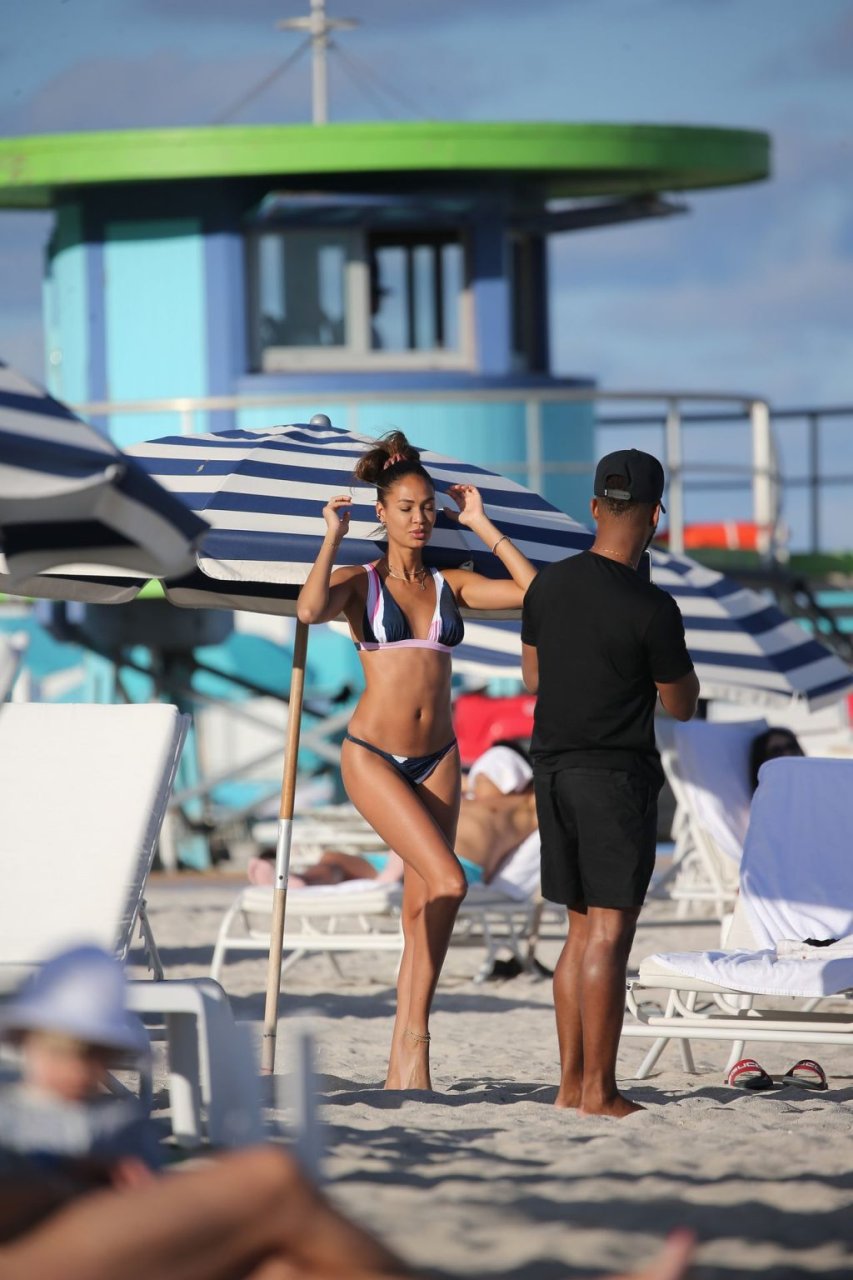 La modella Joan Smalls coinvolge il suo fidanzato Bernard Smith come fotografo mentre posa seducente in bikini sulla spiaggia di Miami.