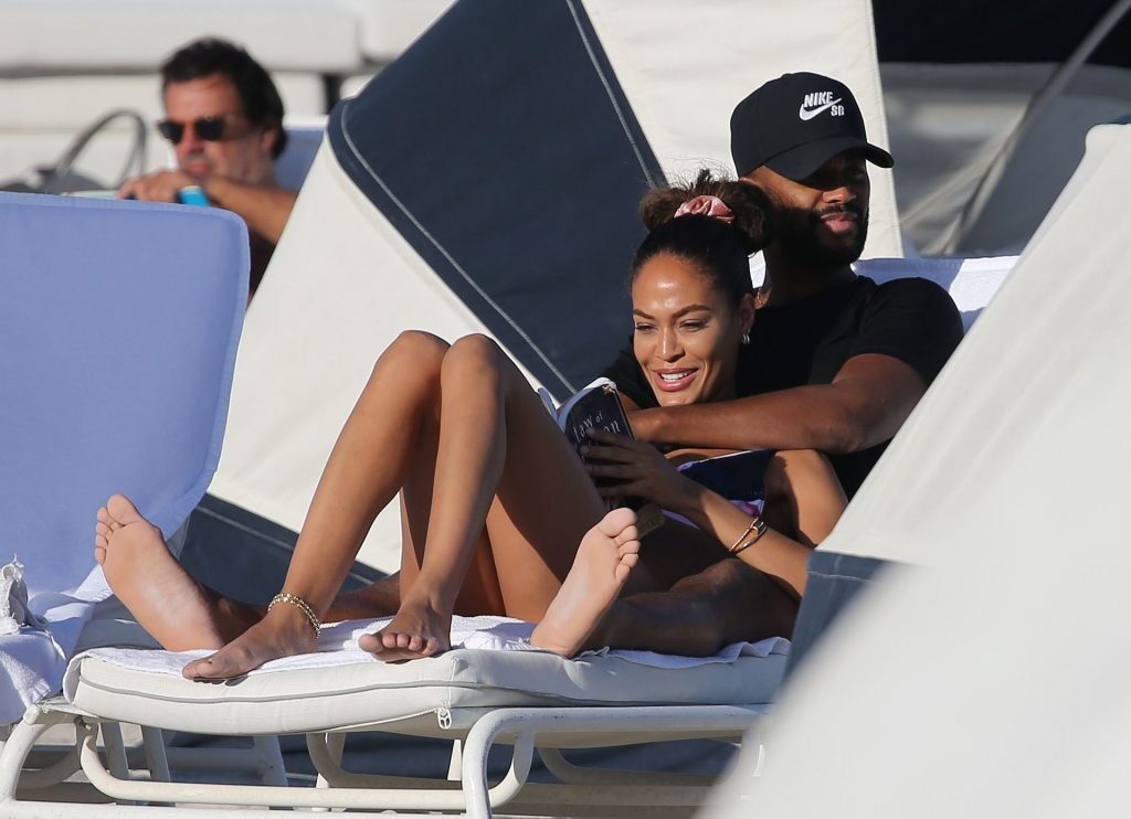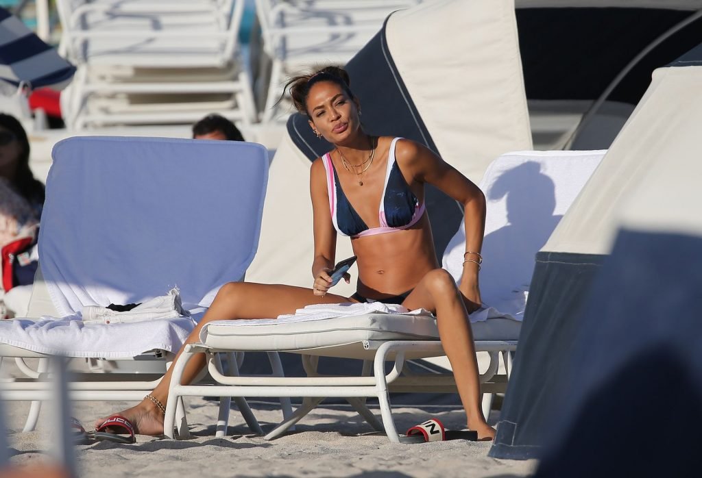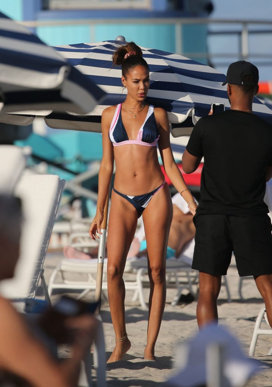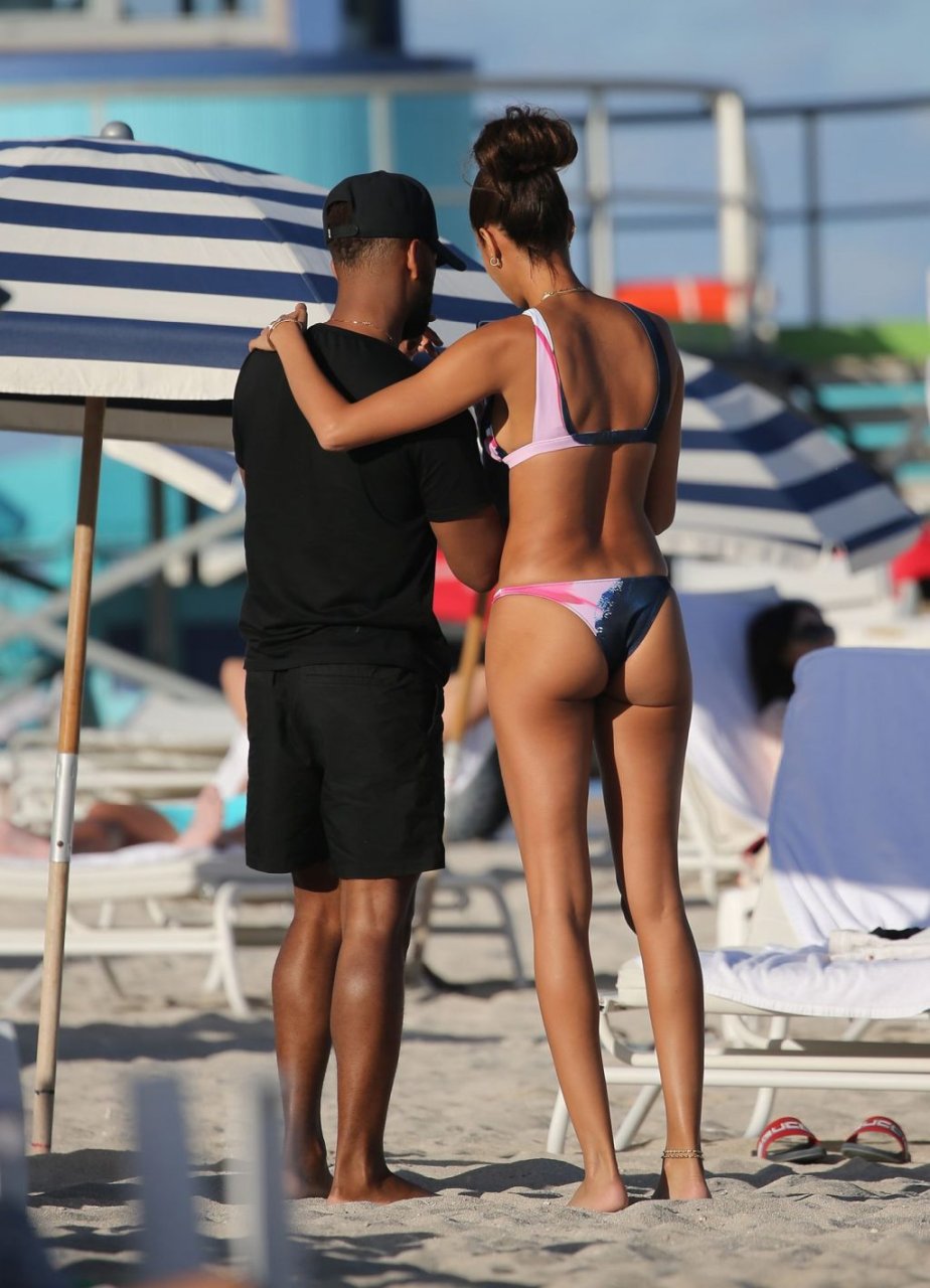 La modella Joan Smalls coinvolge il suo fidanzato Bernard Smith come fotografo mentre posa seducente in bikini sulla spiaggia di Miami.